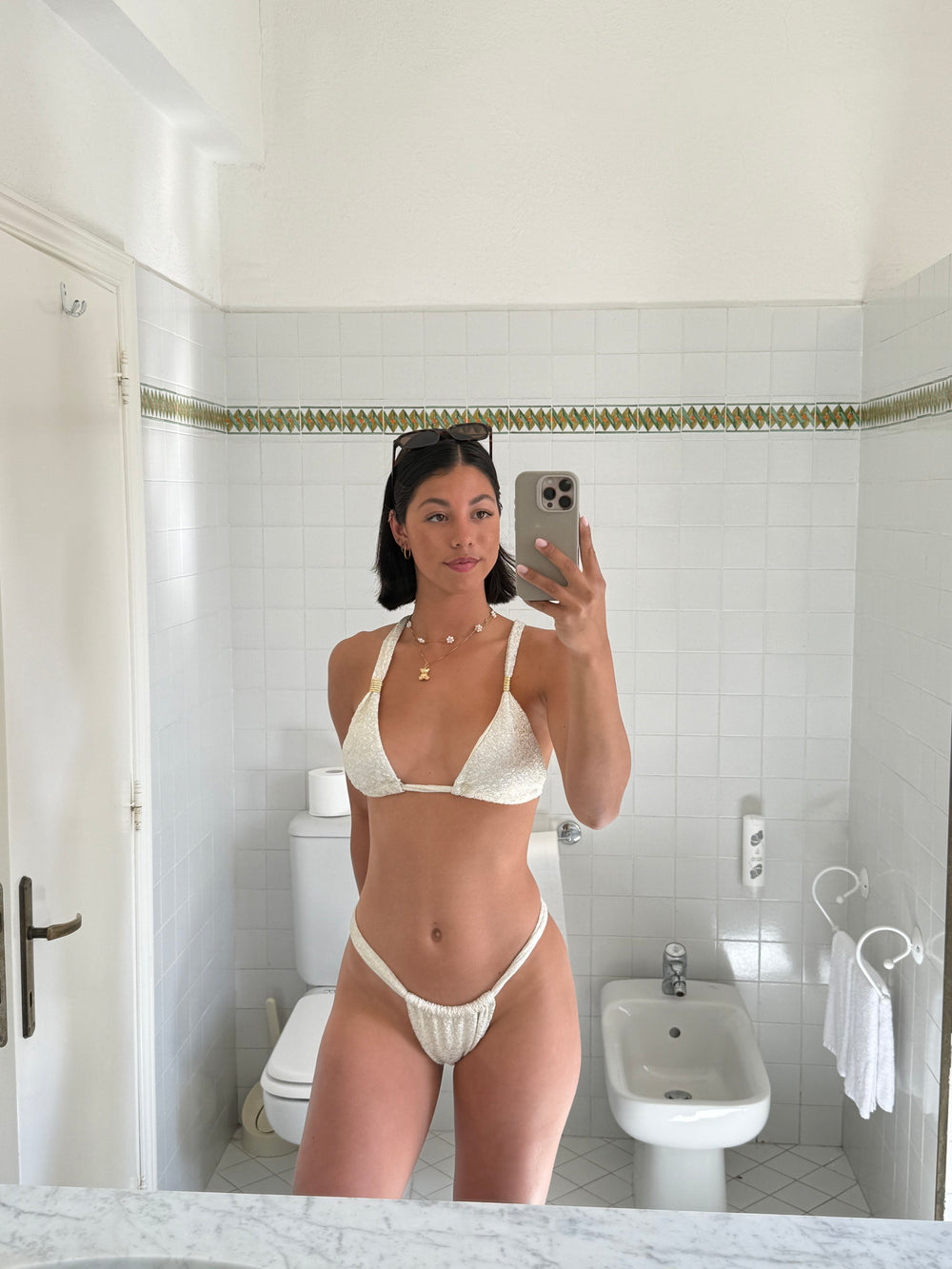 Vores Bruna bikini bikini i beige/off white består af en overdel med brede stropper og gulddetaljer. Den kan bindes på ryggen og er justerbar. Den er i et fint glimmer-materiale.