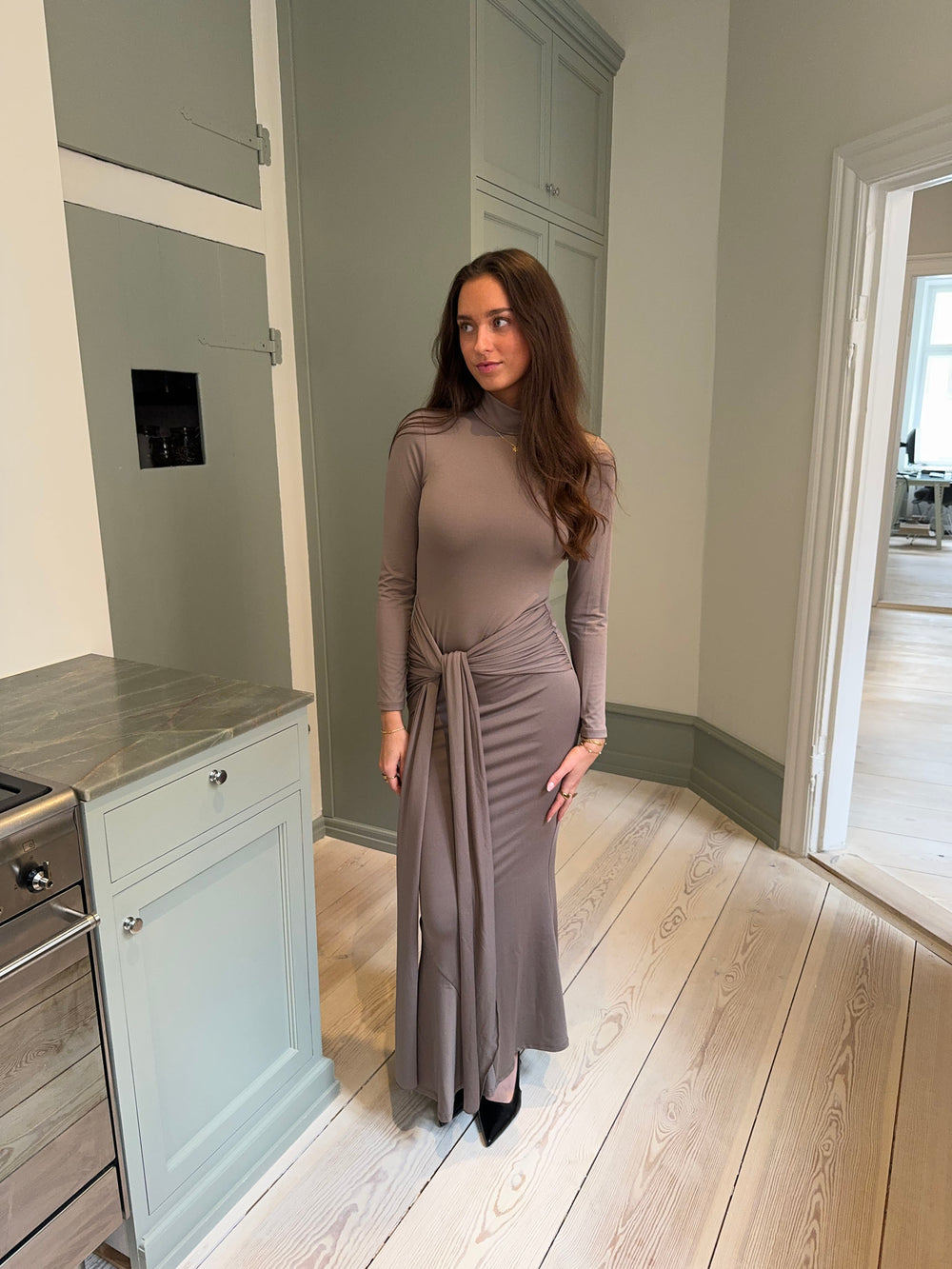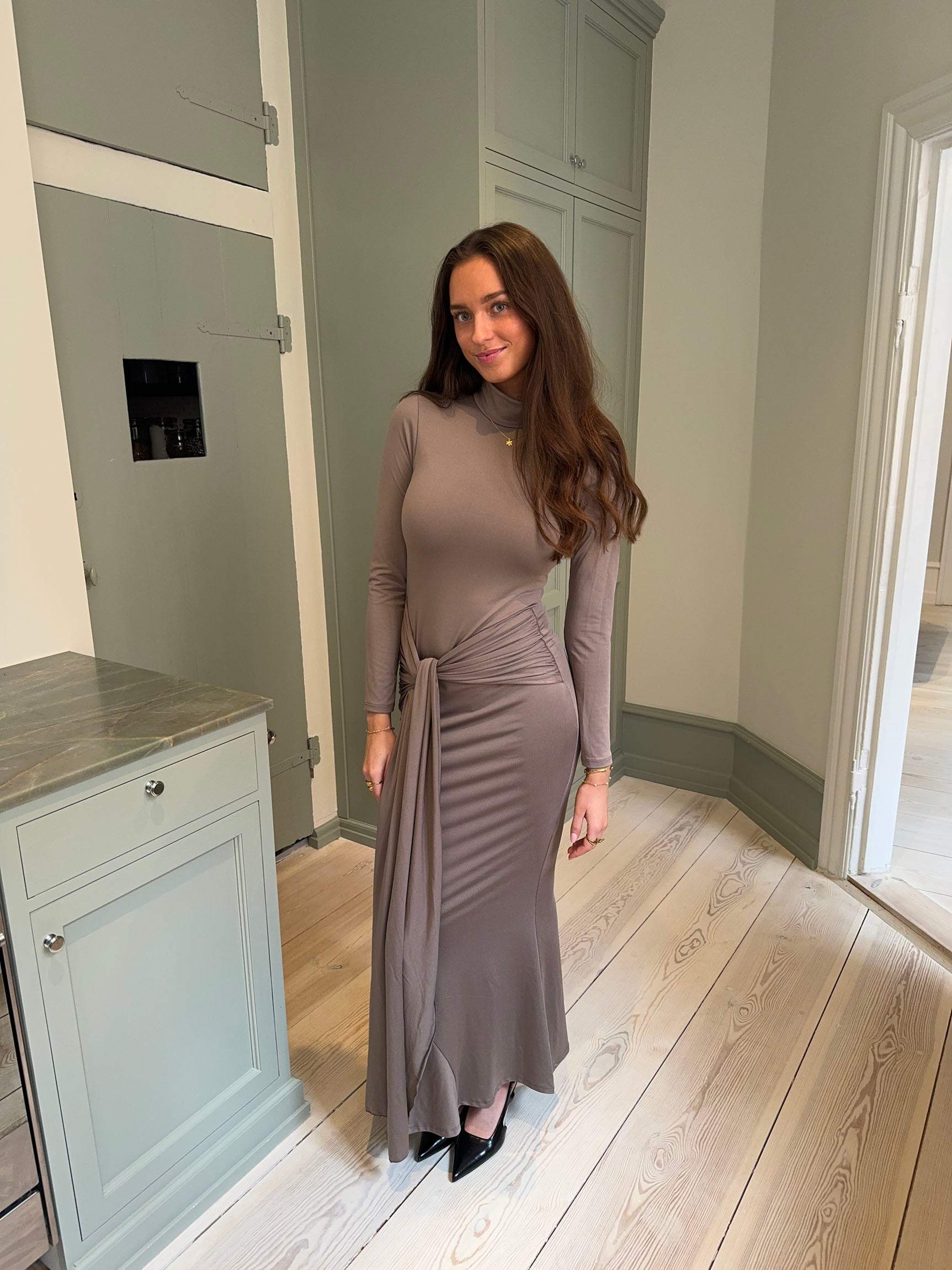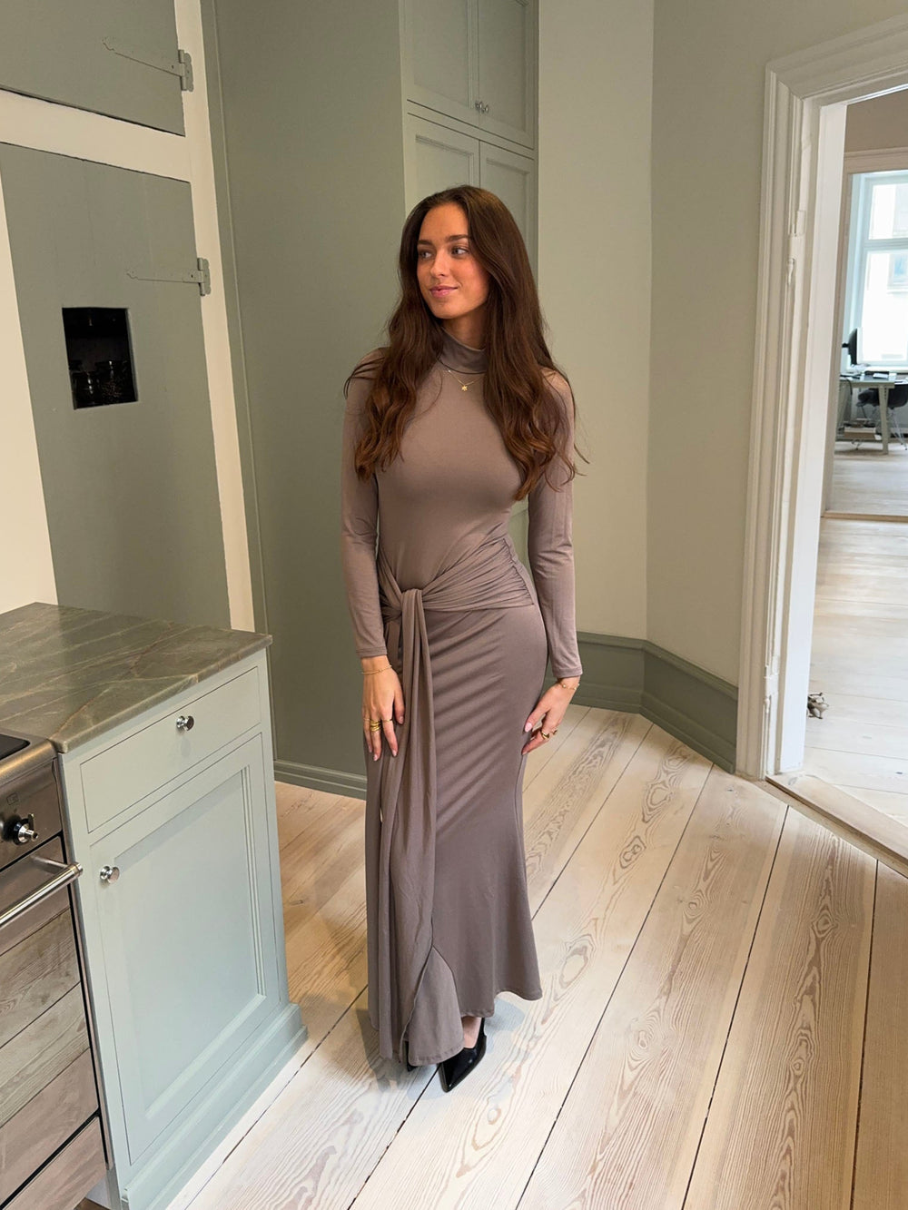 En elegant og stilfuld maxikjole i en smuk taupe-farve. Kjolen har lange ærmer og en sofistikeret høj hals, der skaber et klassisk og raffineret udtryk. Bindebåndet ved taljen eller hofterne fremhæver figuren og tilføjer en feminin silhuet. Det flydende stof falder smukt langs kroppen og gør den perfekt til både formelle og festlige anledninger.