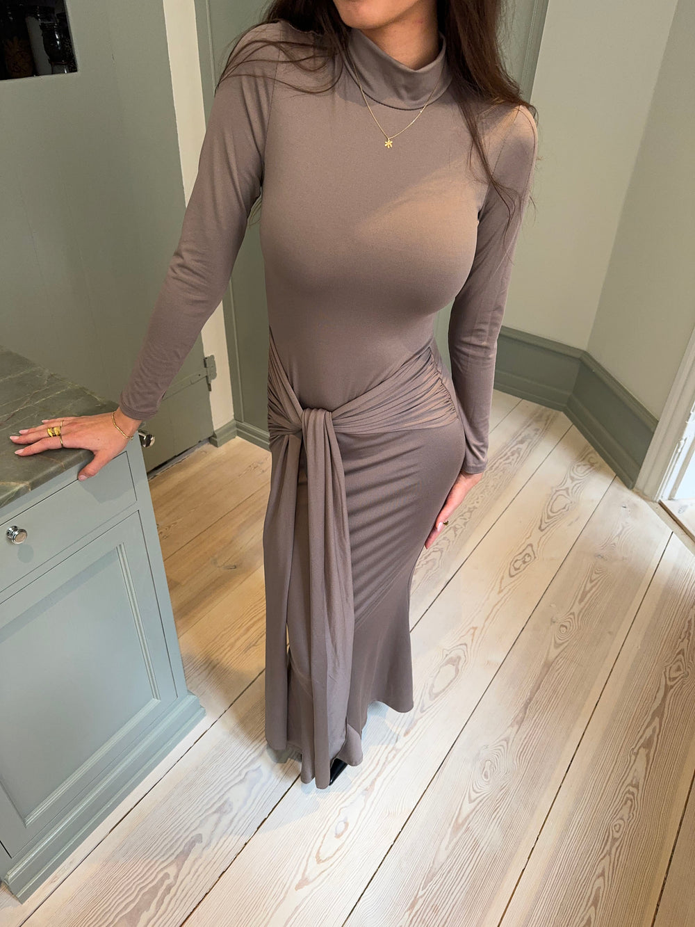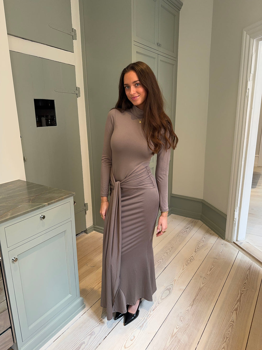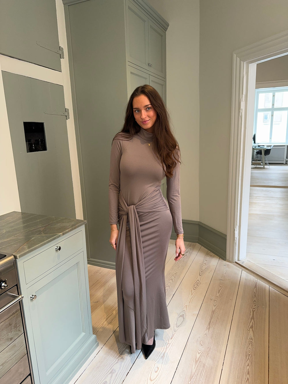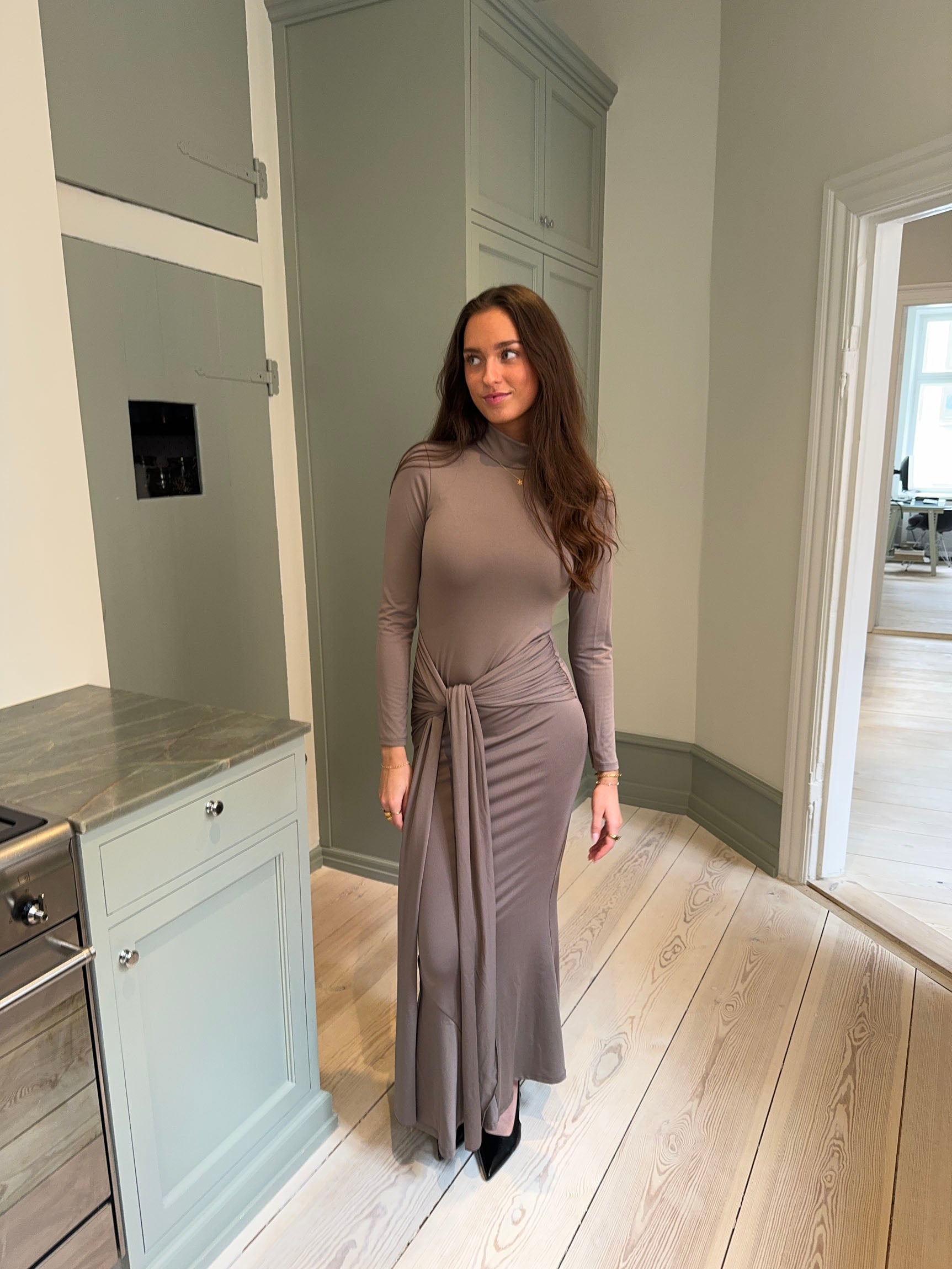 En elegant og stilfuld maxikjole i en smuk taupe-farve. Kjolen har lange ærmer og en sofistikeret høj hals, der skaber et klassisk og raffineret udtryk. Bindebåndet ved taljen eller hofterne fremhæver figuren og tilføjer en feminin silhuet. Det flydende stof falder smukt langs kroppen og gør den perfekt til både formelle og festlige anledninger.