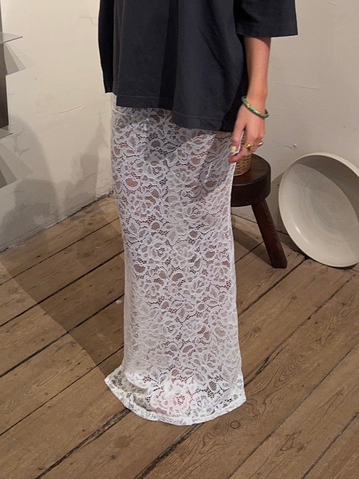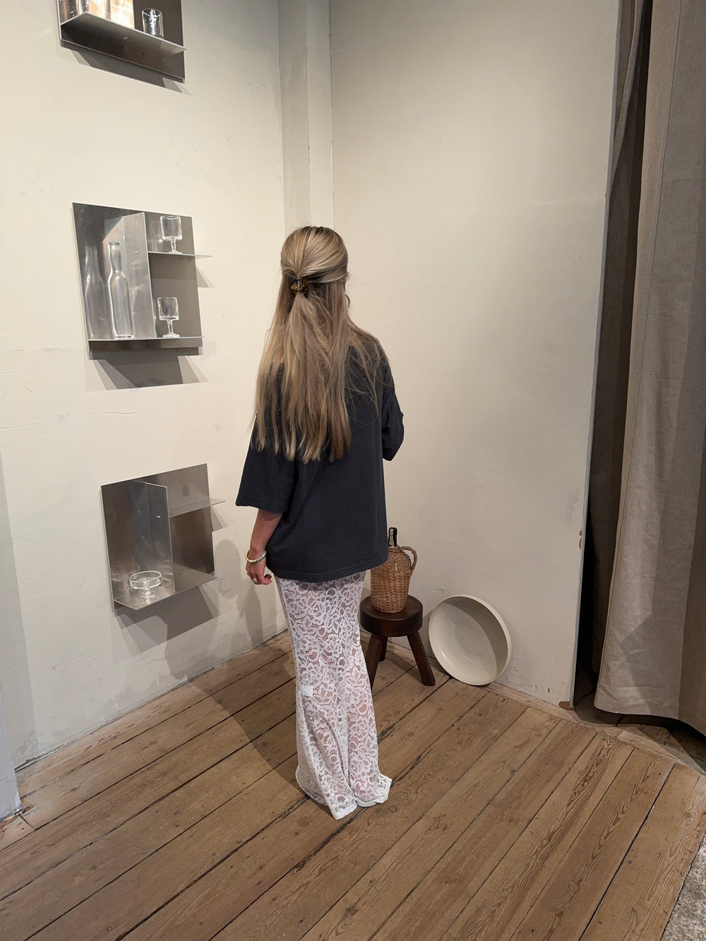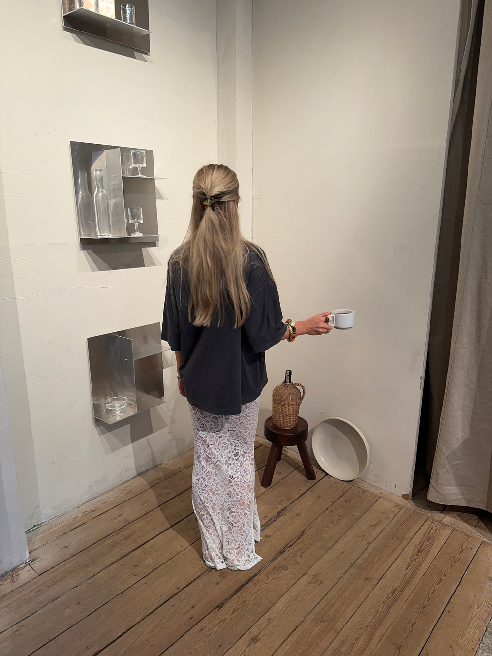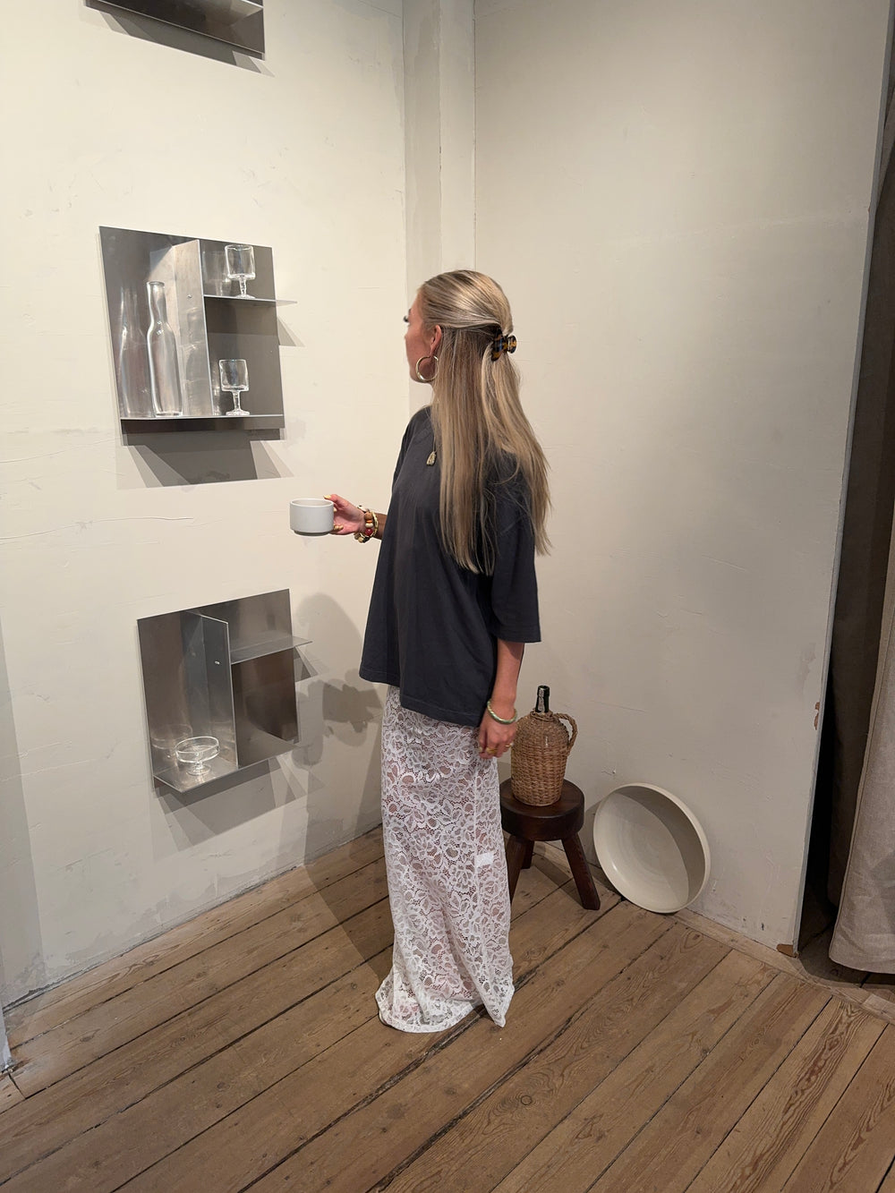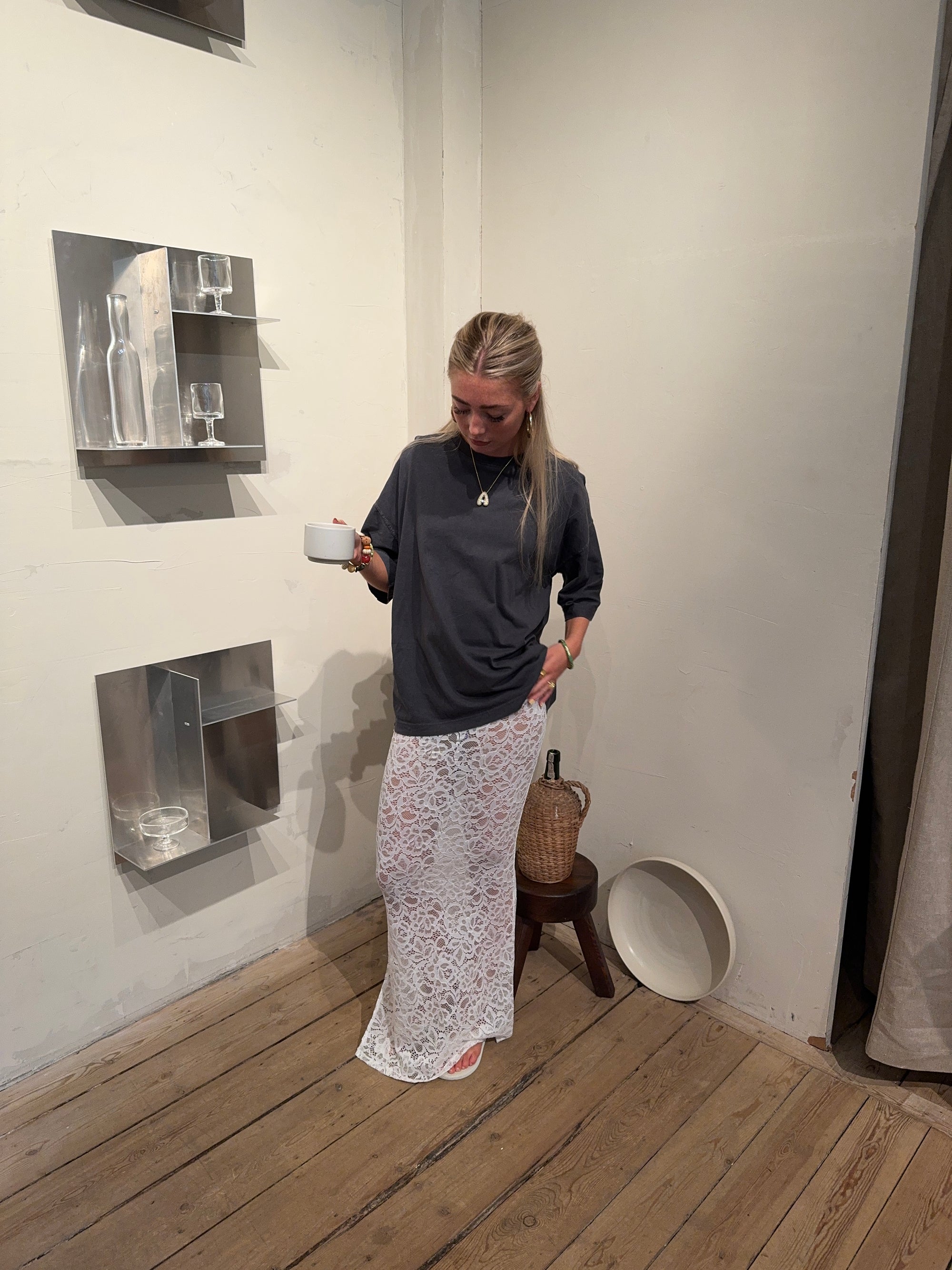 Tilføj et strejf af elegance til din garderobe med denne smukke hvide maxi nederdel i blonde. Nederdelen har en lige pasform, der giver et klassisk og stilfuldt udtryk, mens det lette blondemateriale tilfører et sofistikeret touch. Den dekorative slids i den ene side giver et subtilt, men moderne twist, der gør nederdelen perfekt til både formelle anledninger og afslappede sommerdage. Den hvide farve er tidløs og alsidig, hvilket gør det nemt at style med forskellige toppe og accessories for et komplet look. Vi har dog valgt at style den med en oversized t-shirt for det optimale it girl-look!