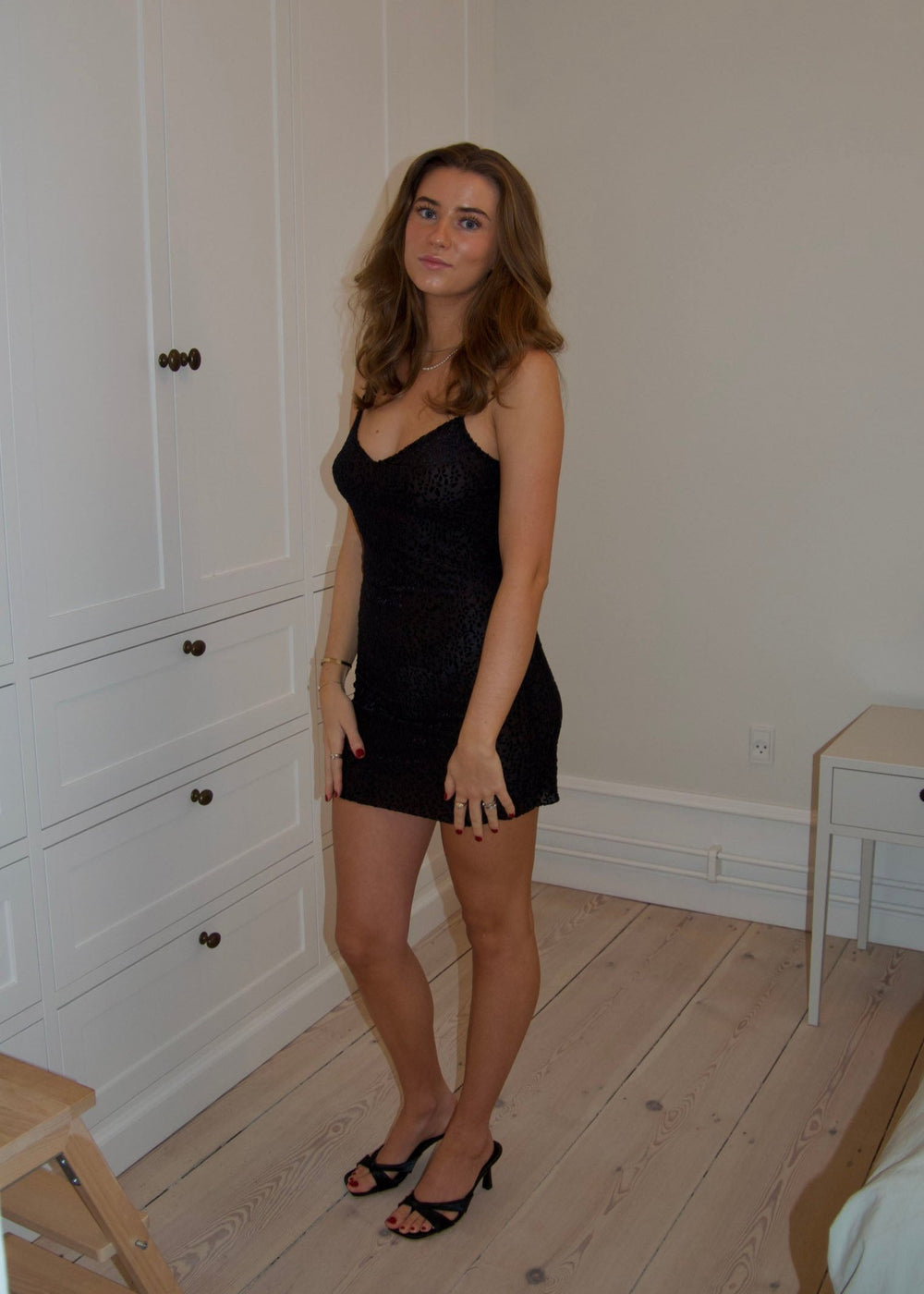 Denne elegante, sorte korte kjole er den perfekte kombination af tidløs stil og festlig flair. Med sine tynde stropper og en v-udskæring fremhæver kjolen din figur på en sofistikeret måde. De smukke blomsterdetaljer tilføjer et elegant touch, der gør den ideel til både nytårsfest og andre festlige begivenheder. Kjolens lette og flatterende pasform sikrer, at du kan bevæge dig frit og føle dig selvsikker hele aftenen.