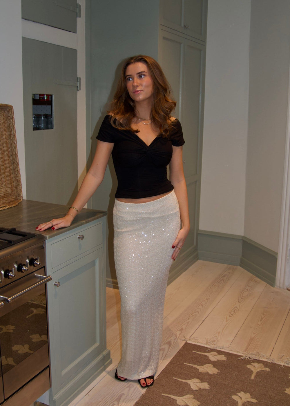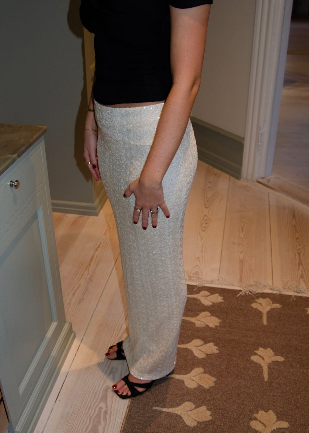 Denne off-white maxi nederdel med pallietter er den perfekte kombination af elegance og glamour. De funklende pallietter fanger lyset ved bevægelse, hvilket gør den til et ideelt valg til både aftener og festlige lejligheder. Den flatterende silhuet giver et chic og sofistikeret look, mens pallietterne tilføjer et livligt look. Kombinér den med en enkel top eller en iøjnefaldende bluse for et look, der udstråler fest!