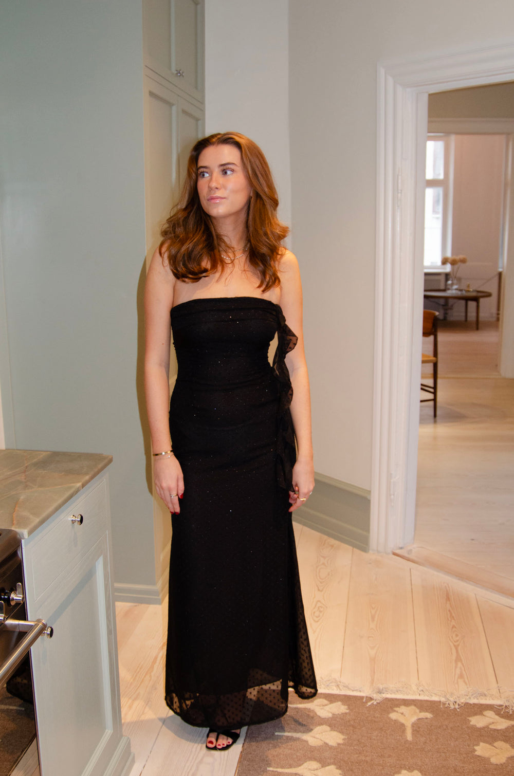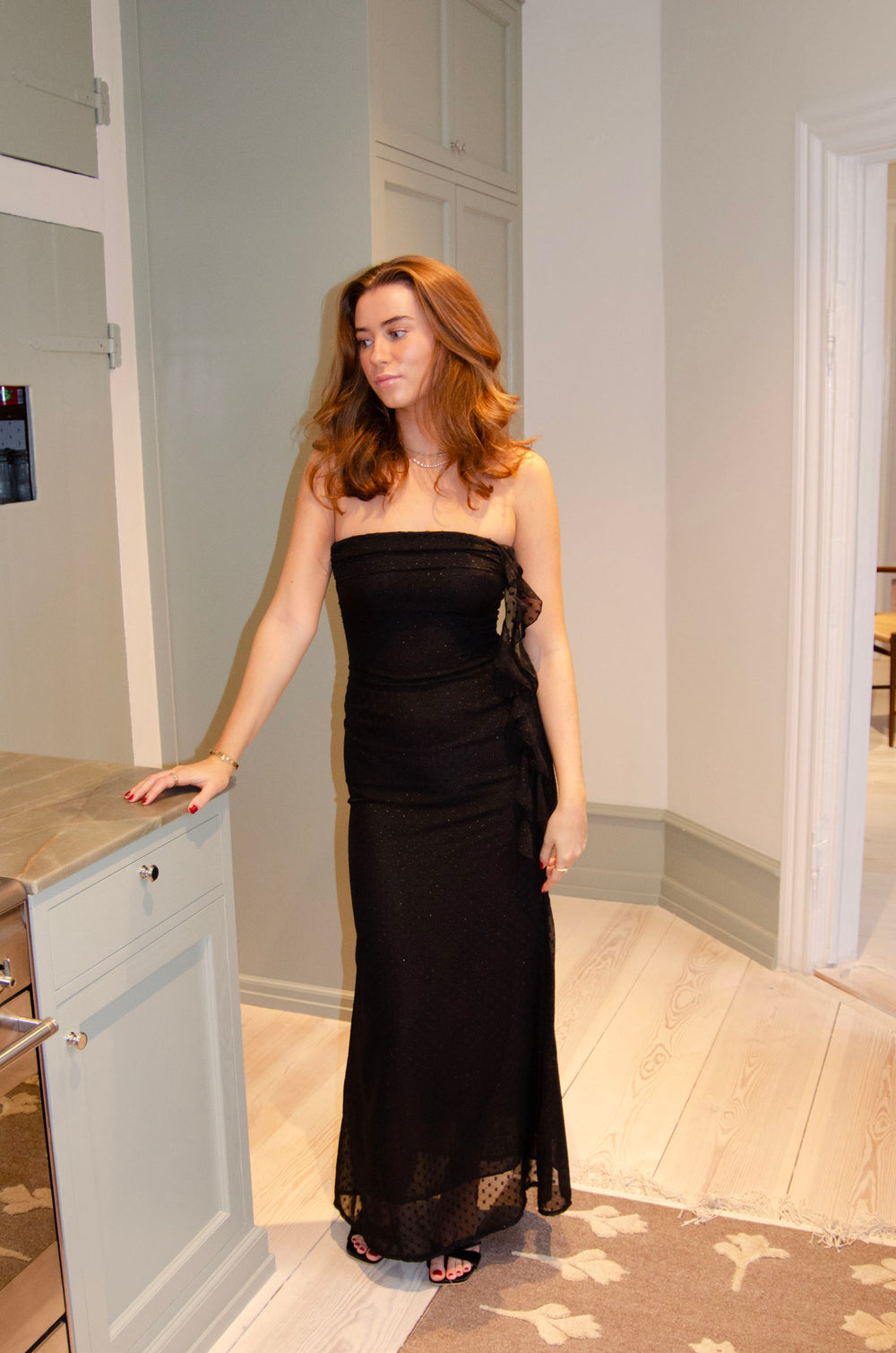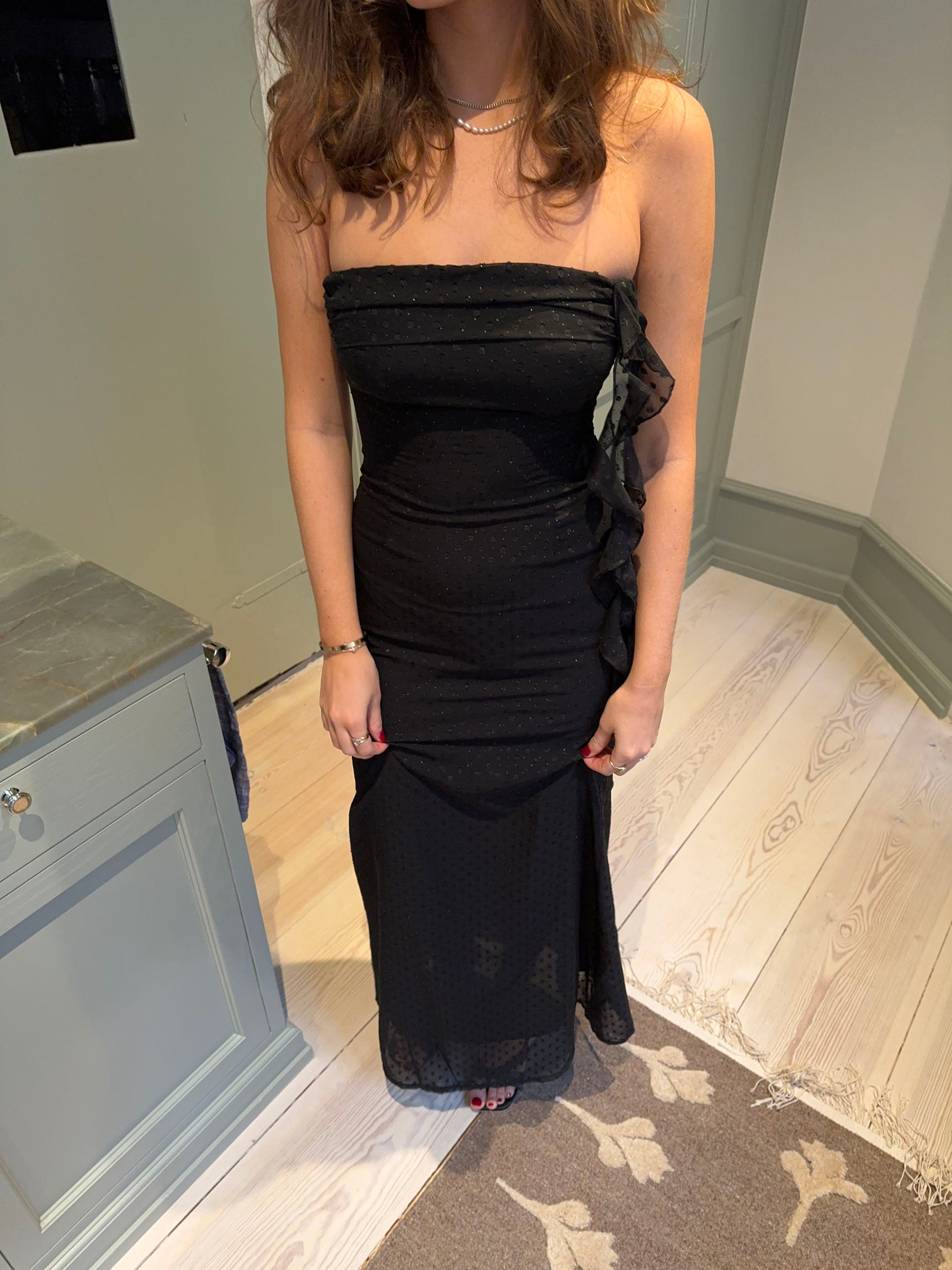Denne smukke lange bandeau-kjole i sort med glimmer er et statement af både elegance og glamour. Den glitrende overflade fanger lyset på en subtil, men iøjnefaldende måde, hvilket giver kjolen en sofistikeret og festlig karakter. Den tætsiddende kjole skaber en slank og stilfuld silhuet, mens den dramatiske flænsedetalje, der løber langs siden, tilføjer en smule bevægelse og ekstra flair. Flæsen åbner op for en smuk, dynamisk effekt, der giver kjolen et feminint udtryk.