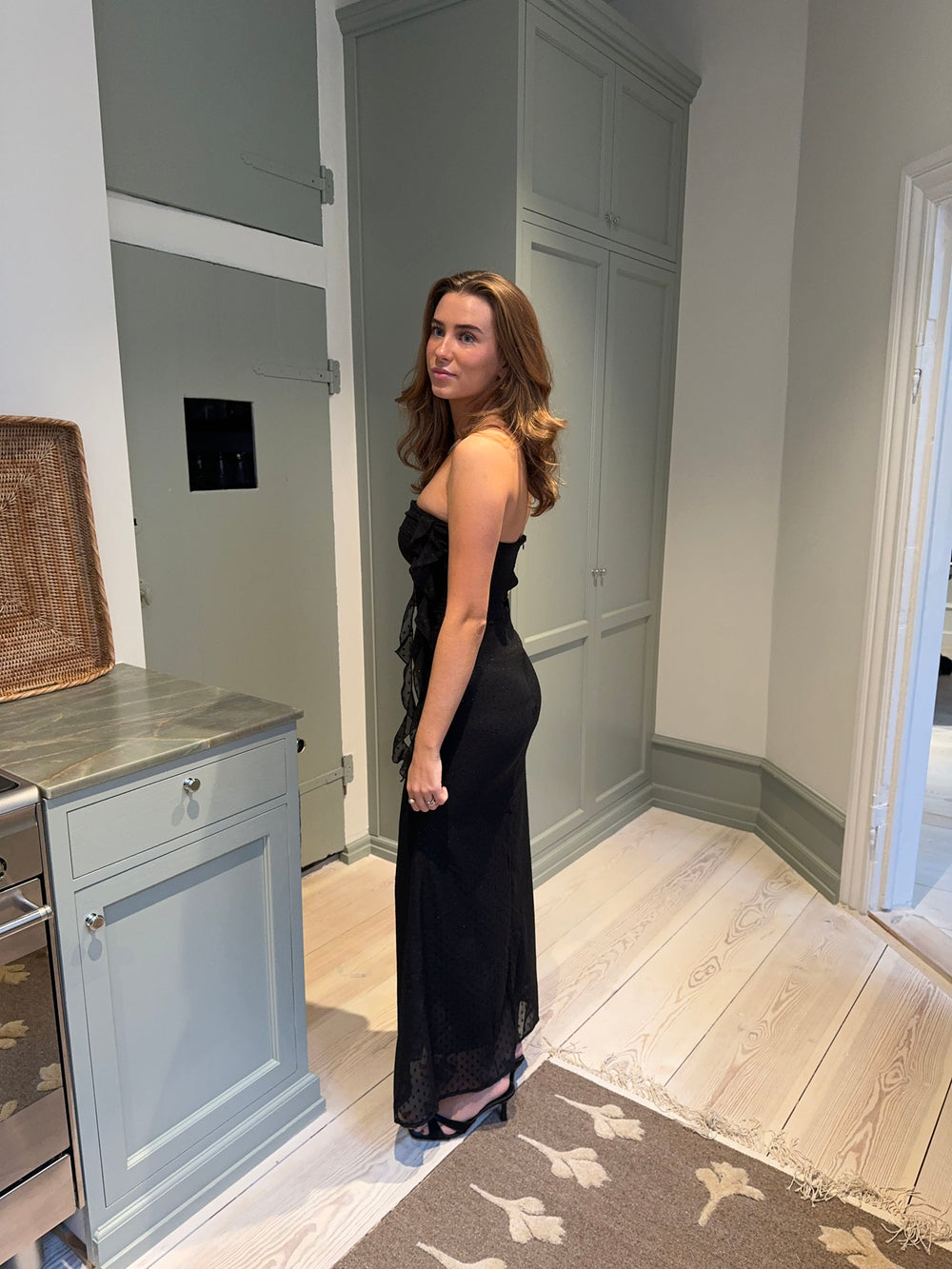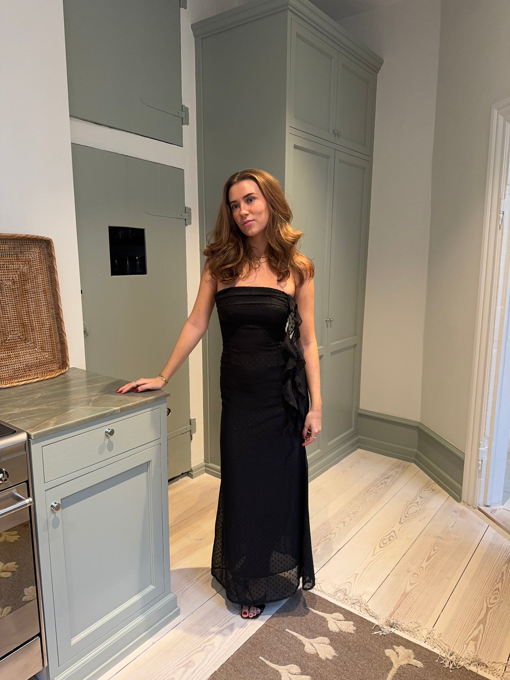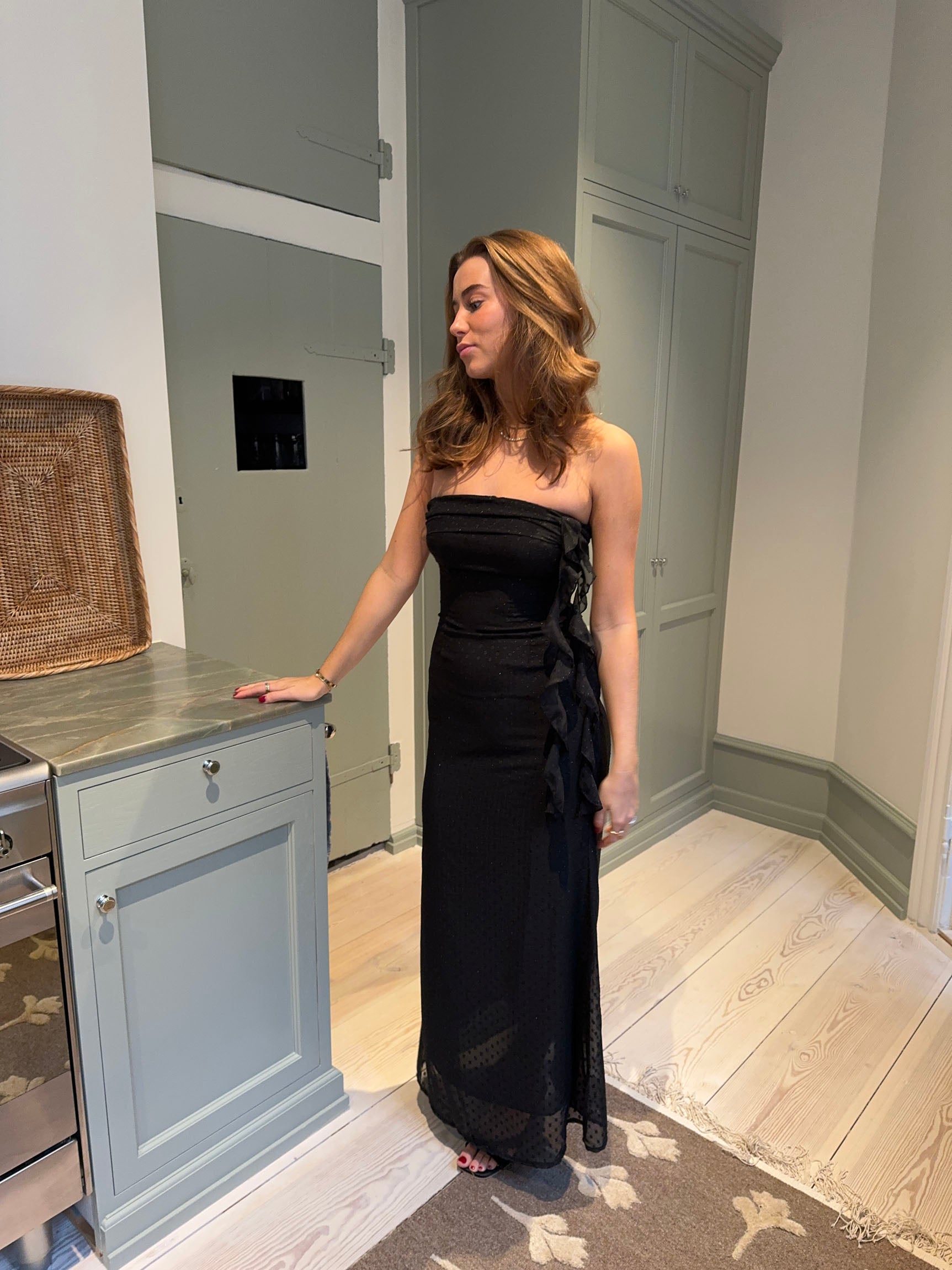 Denne smukke lange bandeau-kjole i sort med glimmer er et statement af både elegance og glamour. Den glitrende overflade fanger lyset på en subtil, men iøjnefaldende måde, hvilket giver kjolen en sofistikeret og festlig karakter. Den tætsiddende kjole skaber en slank og stilfuld silhuet, mens den dramatiske flænsedetalje, der løber langs siden, tilføjer en smule bevægelse og ekstra flair. Flæsen åbner op for en smuk, dynamisk effekt, der giver kjolen et feminint udtryk.