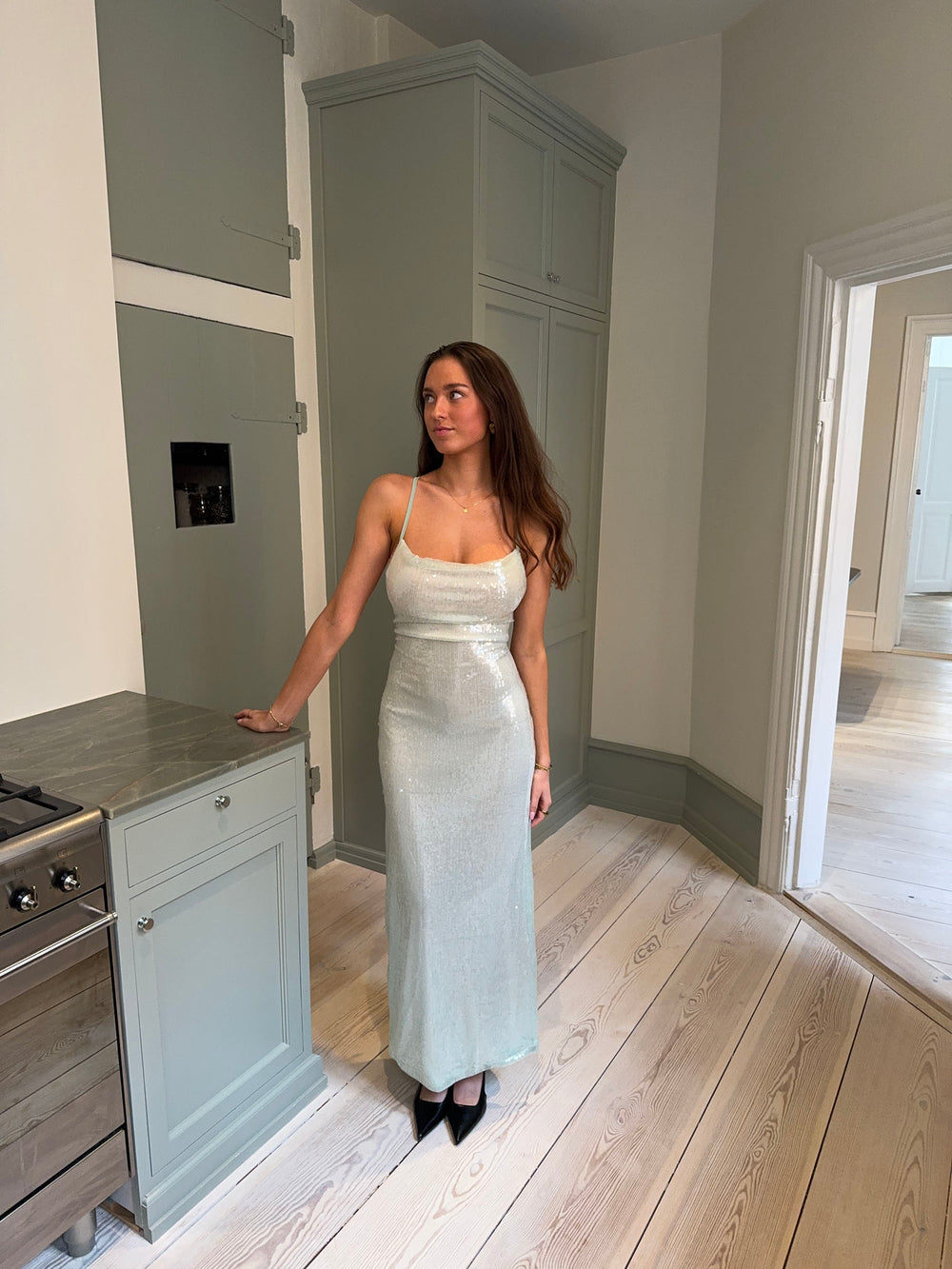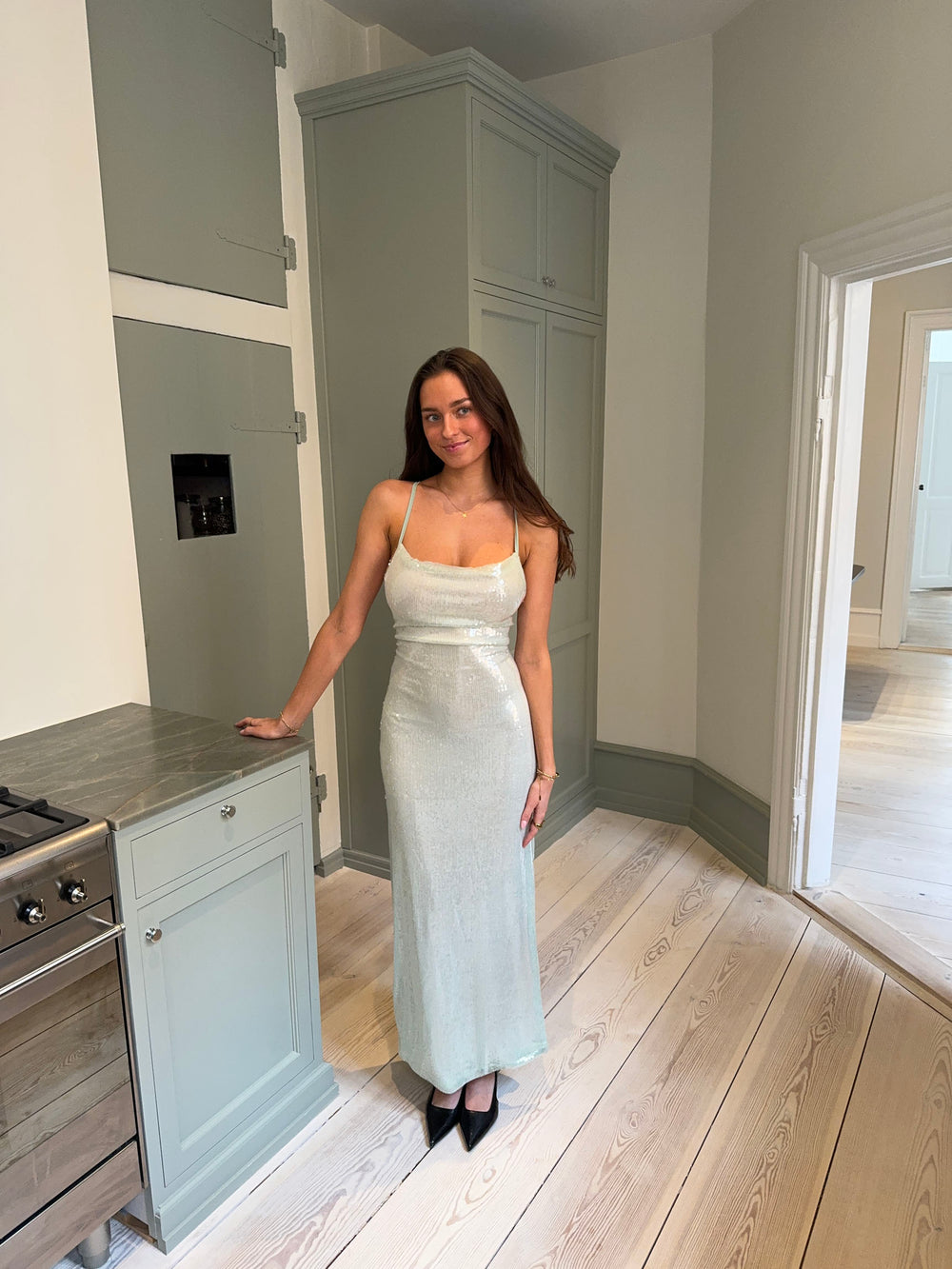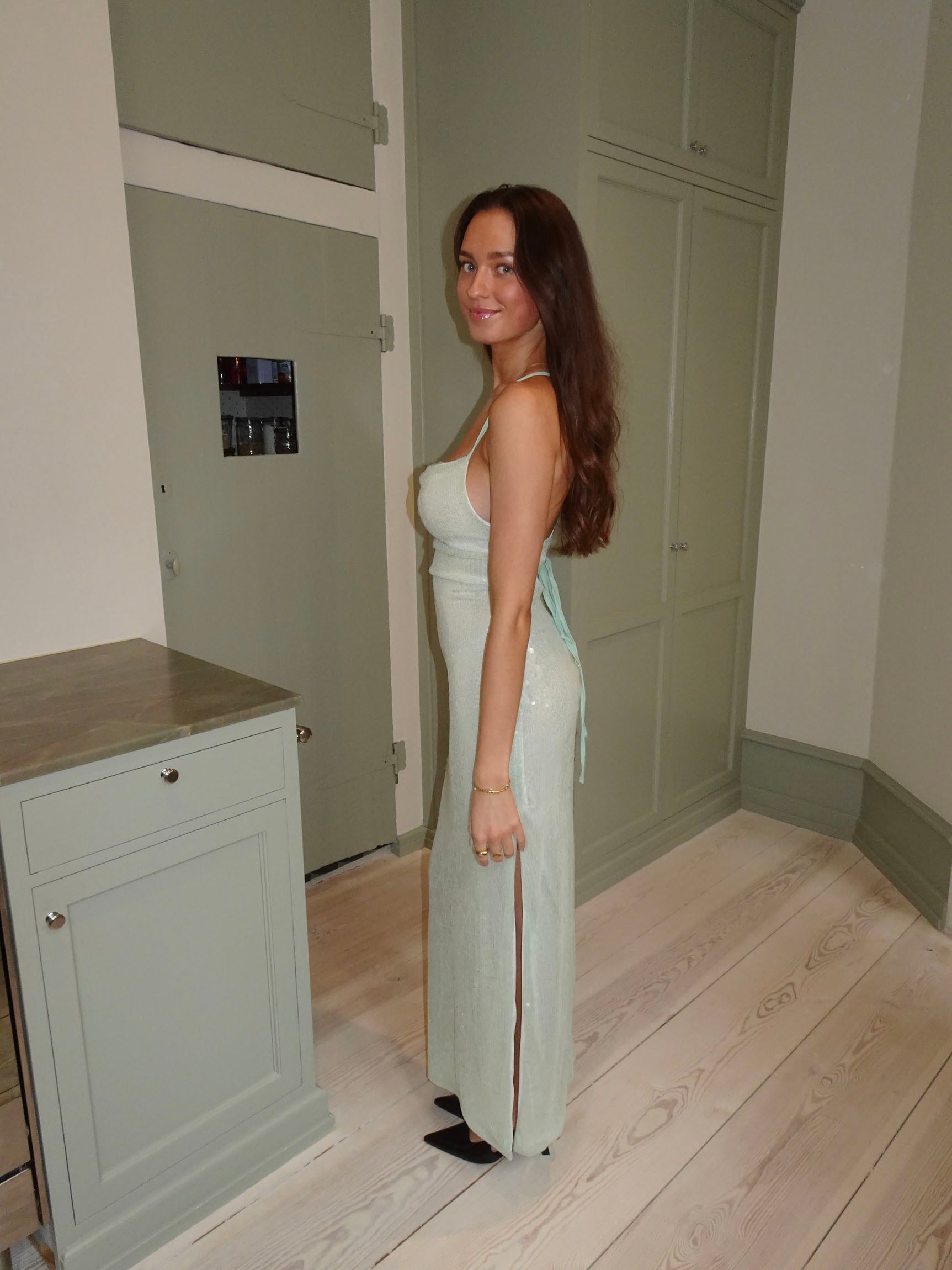En glamourøs og sofistikeret maxikjole dækket af funklende pallietter. Designet har en åben ryg med elegante bindedetaljer, der fremhæver silhuetten og tilføjer et eksklusivt touch. Den flydende pasform skaber en smuk bevægelse, mens den sagegrønne nuance understreger et tidløst og luksuriøst udtryk. Perfekt til gallafester og særlige anledninger – style den med minimalistiske smykker og hæle for et elegant og iøjnefaldende look.