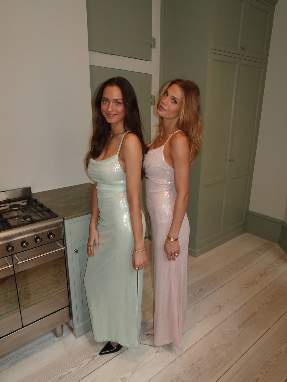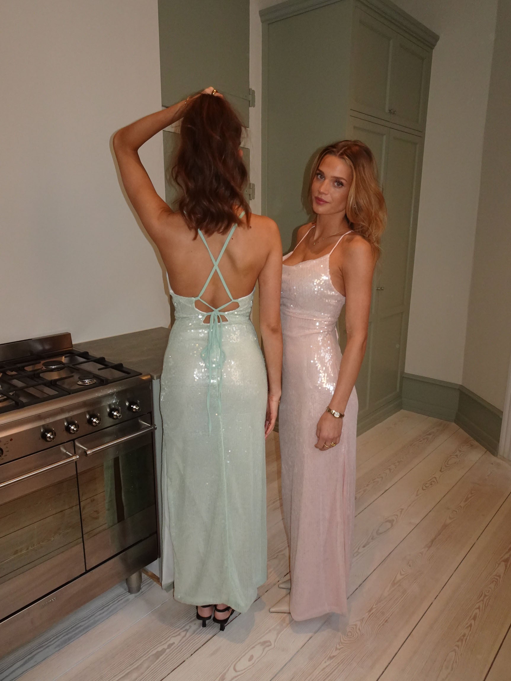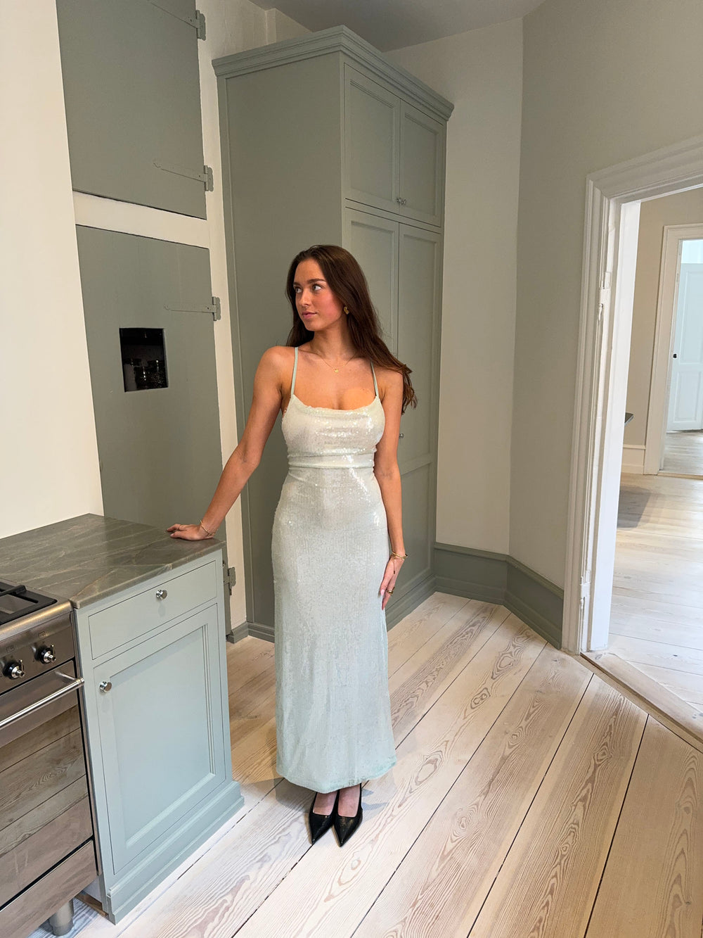 En glamourøs og sofistikeret maxikjole dækket af funklende pallietter. Designet har en åben ryg med elegante bindedetaljer, der fremhæver silhuetten og tilføjer et eksklusivt touch. Den flydende pasform skaber en smuk bevægelse, mens den sagegrønne nuance understreger et tidløst og luksuriøst udtryk. Perfekt til gallafester og særlige anledninger – style den med minimalistiske smykker og hæle for et elegant og iøjnefaldende look.