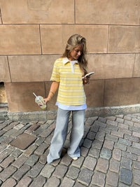 Vores stribede polo er din nye go to. De dybe toner kombineret med en skarp hvid krave skaber et sofistikeret, men afslappet udtryk. Den kan styles med både jeans, tailored bukser eller en enkel nederdel – perfekt til både hverdagsbrug og mere formelle anledninger.