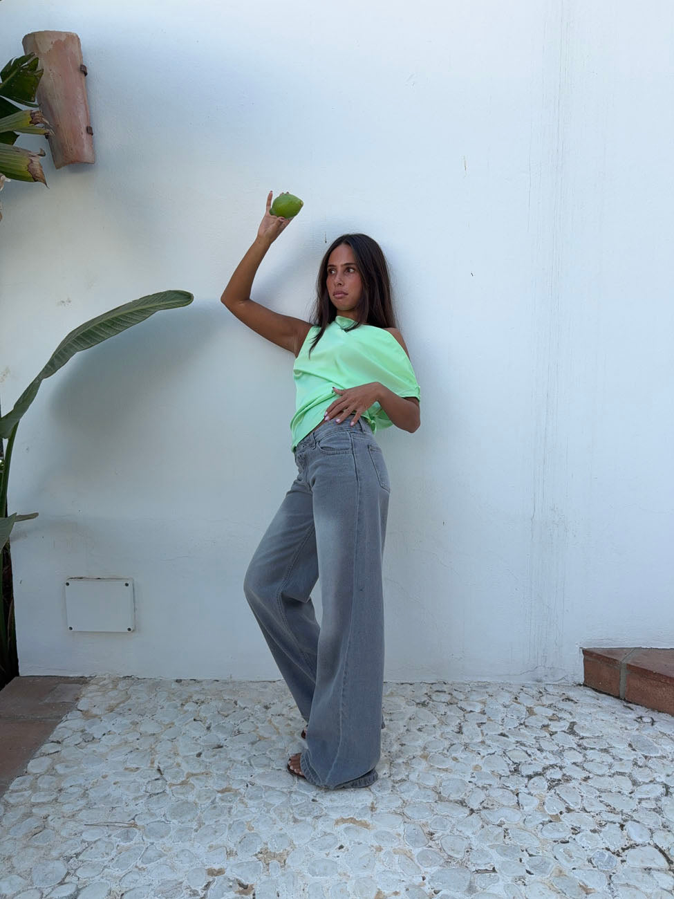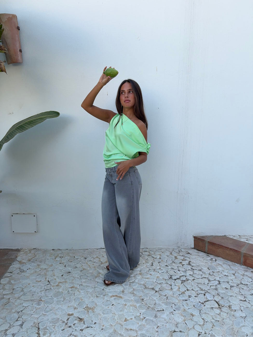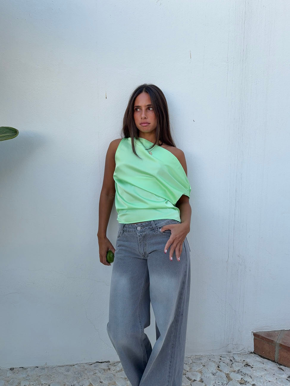 En elegant og enkel one-shoulder top i glansfuld grøn satin. Det minimalistiske design fremhæver skulderen på en sofistikeret måde, mens det bløde satin falder smukt.
