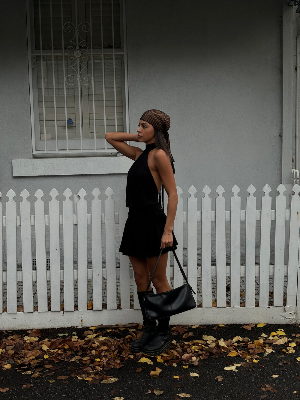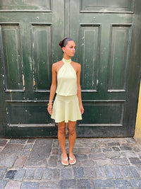 Vores Kaiana kjole er den perfekte kombination af cool og feminin. Den er designet med elastik i taljen, der skaber en flatterende silhuet, og et bredt bindebånd, der kan styles kreativt om halsen eller ryggen. Den åbne ryg og det korte, svingende skørt gør den ideel til varme sommerdage eller aftener, hvor du vil føle dig både afslappet og stilfuld.