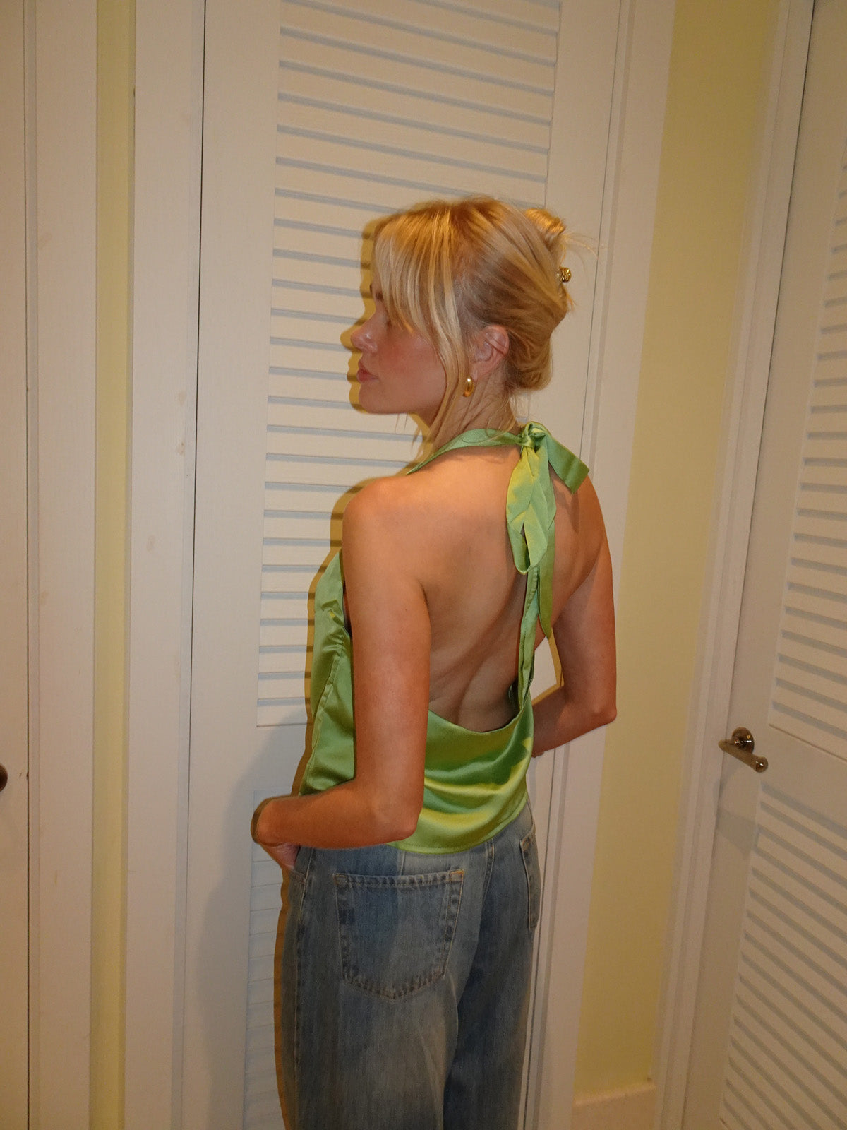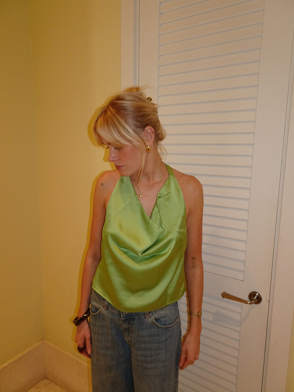 Tilføj et frisk pust til garderoben med denne elegante satin-top i en smuk limegrøn farve. Toppen har brede stropper og en let draperet udskæring, som giver et flatterende og feminint udtryk. Det glatte satinstof tilfører et luksuriøst touch og gør toppen ideel til både hverdagsbrug og festlige lejligheder.