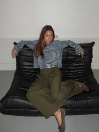 Denne langærmede T-shirt med grå og gule striber er et tidløst element i enhver garderobe. Med sin afslappede pasform og bløde bomuldskvalitet giver den både komfort og coolness. Den mørke kontrastkrave tilføjer et moderne touch, der gør den ideel både alene og som lag-på-lag.