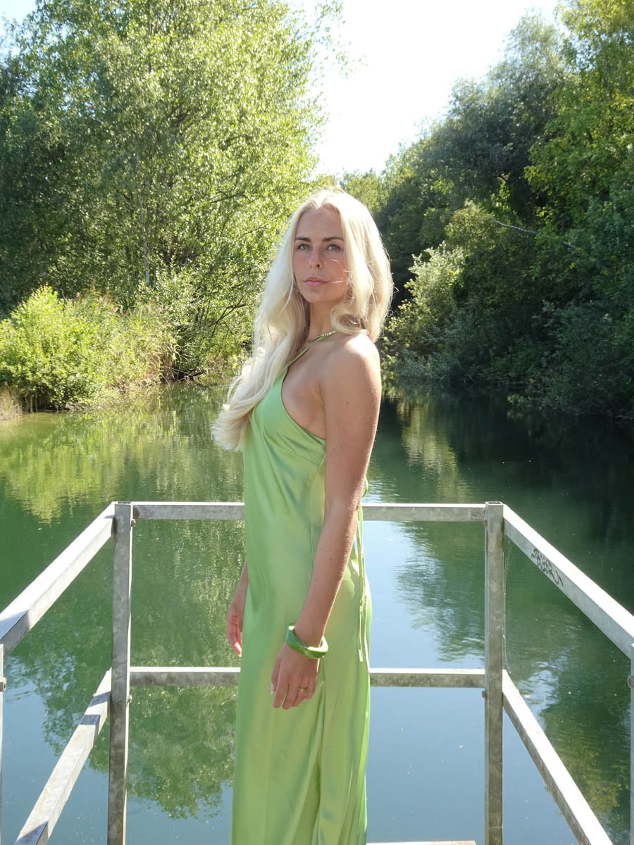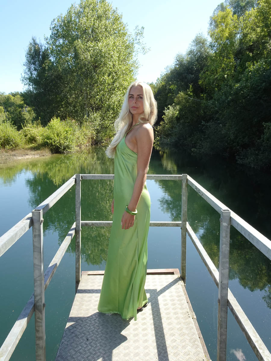 Talia er en smuk og elegant satin kjole i en frisk grøn farve. Kjolen har halterneck-design med tynde stropper og en glansfuld finish, der giver et luksuriøst udtryk. Det lange, flydende snit gør den perfekt til sommerfester, bryllupper eller andre særlige lejligheder, hvor du vil skille dig ud med et stilrent og feminint look.