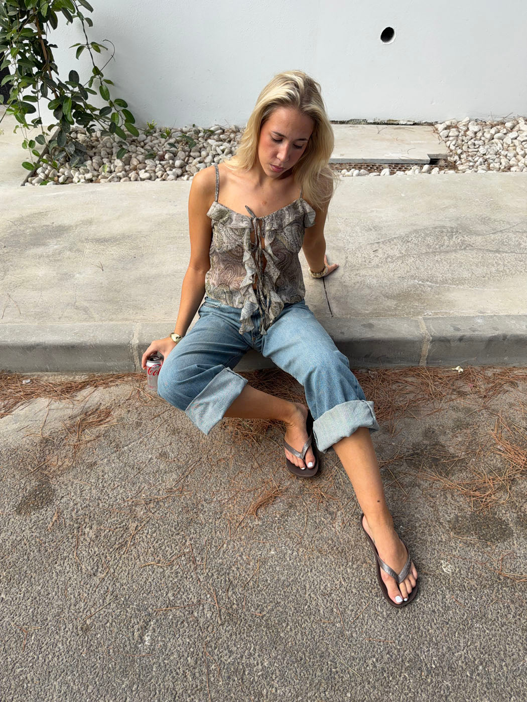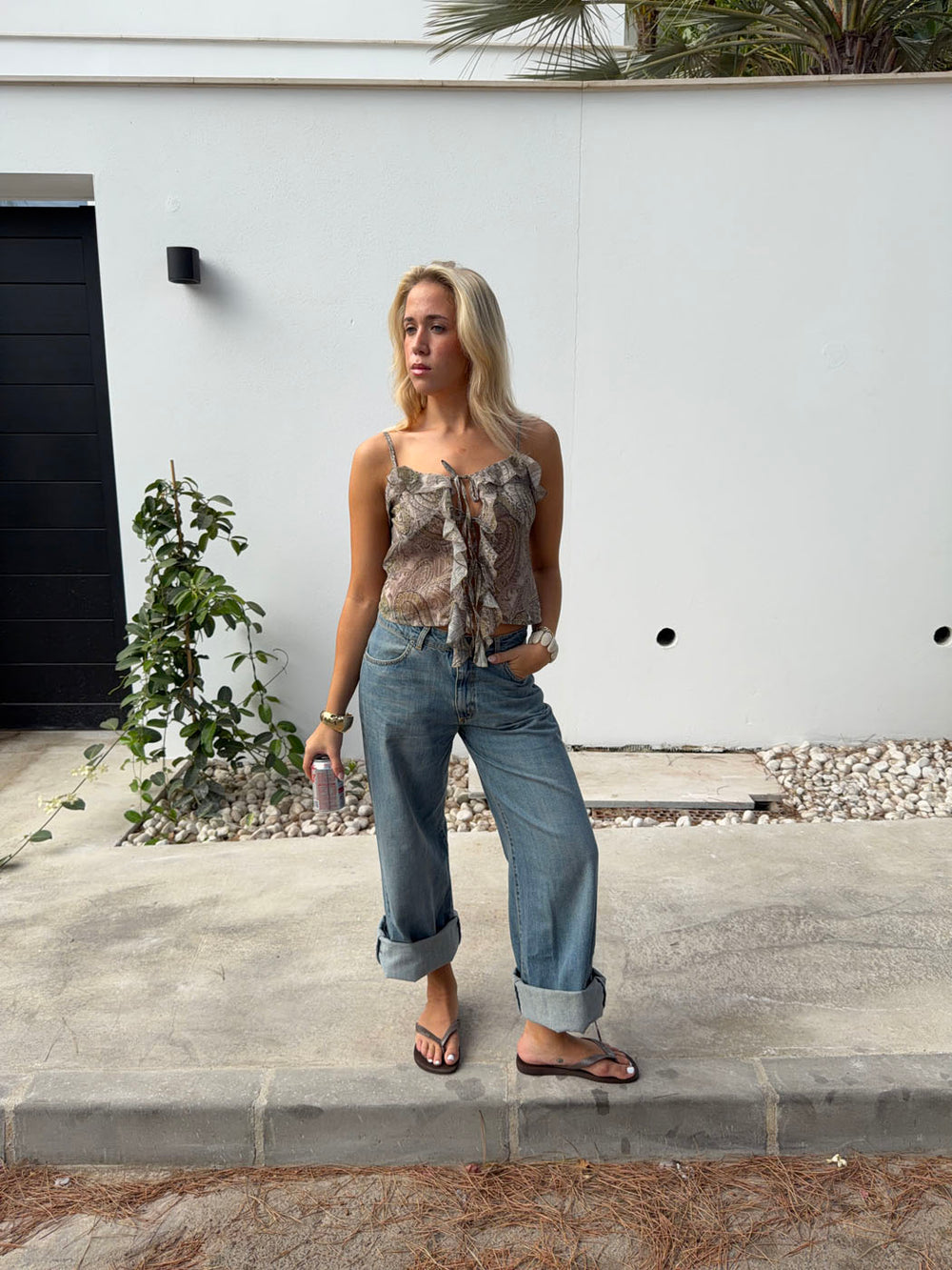 Denne top emmer af lethed og bohemecharme. Det fine paisleyprint i grønne og sandfarvede nuancer giver et sofistikeret, men afslappet udtryk, mens de tynde stropper og bindebånd foran tilfører et feminint touch.