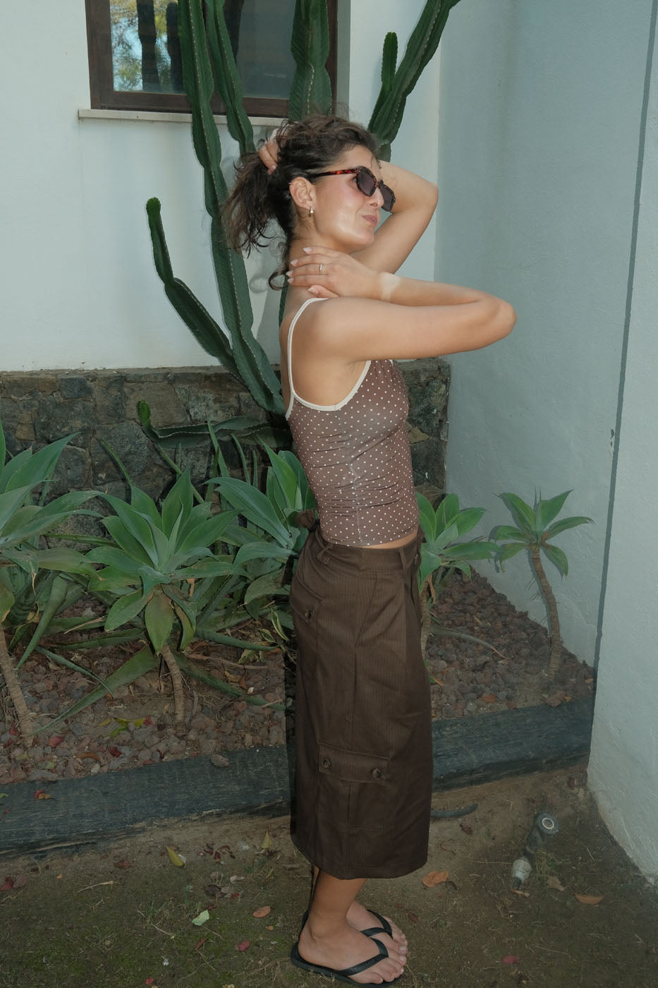 Denne brune stroptop med hvide prikker er et feminint og legende indslag i garderoben, der kombinerer komfort og charme i ét design. De fine, lyse kanter langs stropper og udskæring skaber en smuk kontrast til den varme brunlige base og giver toppen et delikat, retroinspireret udtryk. Den lette og bløde kvalitet gør den behagelig at have på – perfekt til både lune sommerdage og afslappede hverdagslooks.