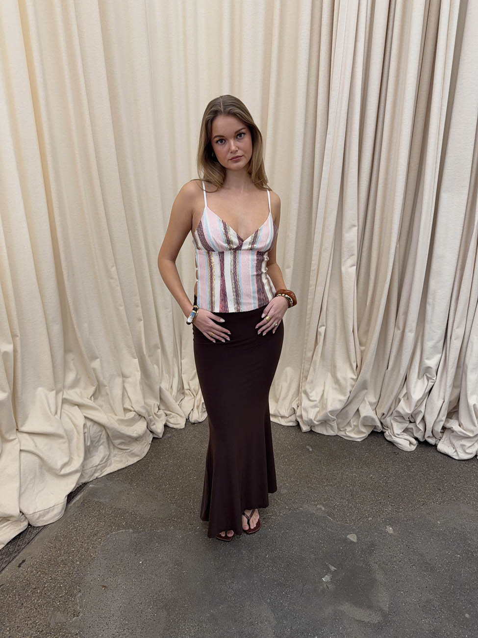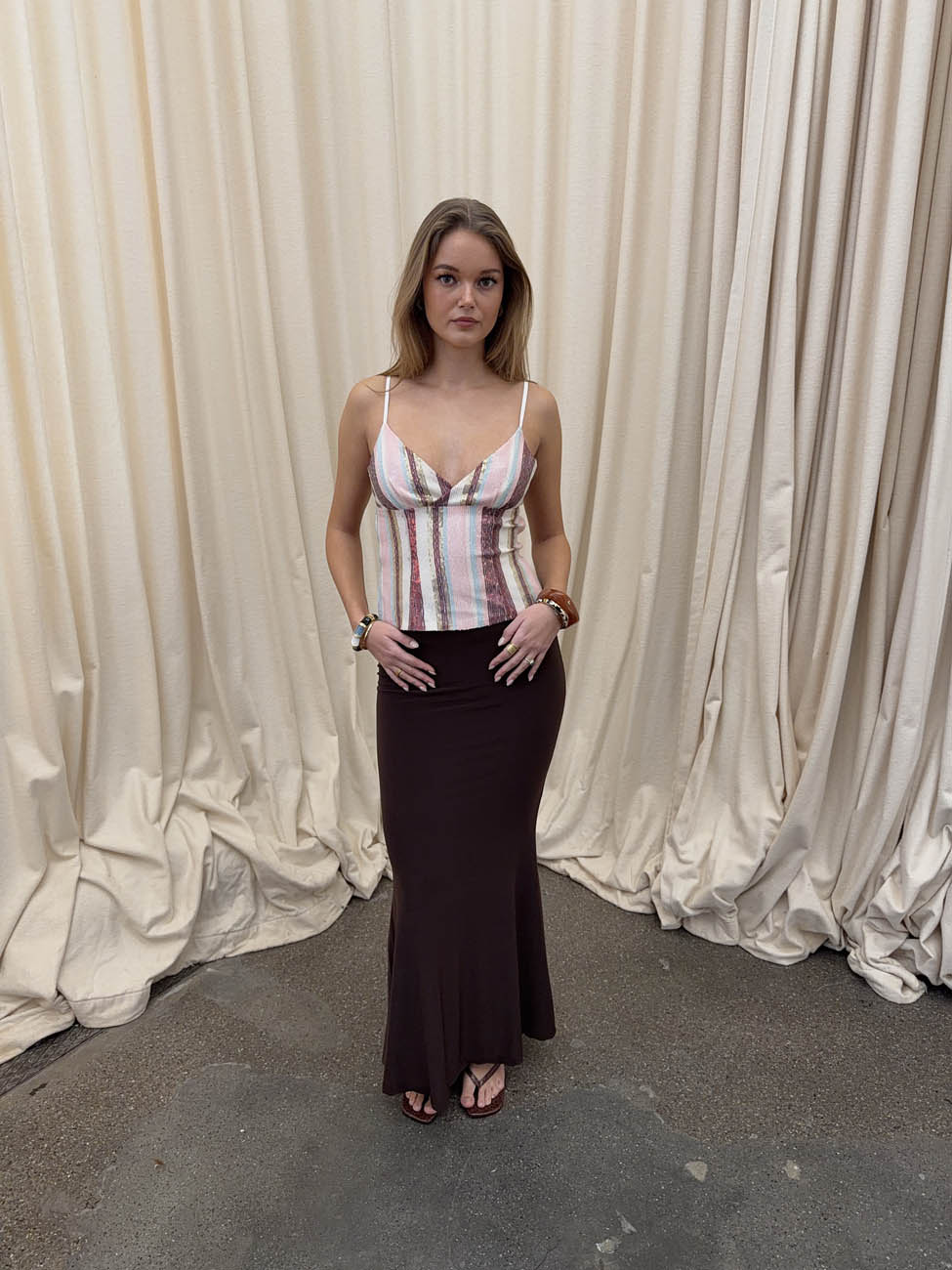 Denne smukke top er et festligt statement-piece, der kombinerer farverig charme med glamourøs glitter. Toppen er dækket af fine pailletter i stribede nuancer af rosa, hvid, guld, blå og bordeaux, som fanger lyset smukt ved enhver bevægelse. Med justerbare stropper og en let, behagelig pasform er den perfekt til både byture, festlige lejligheder og sæsonens events.
