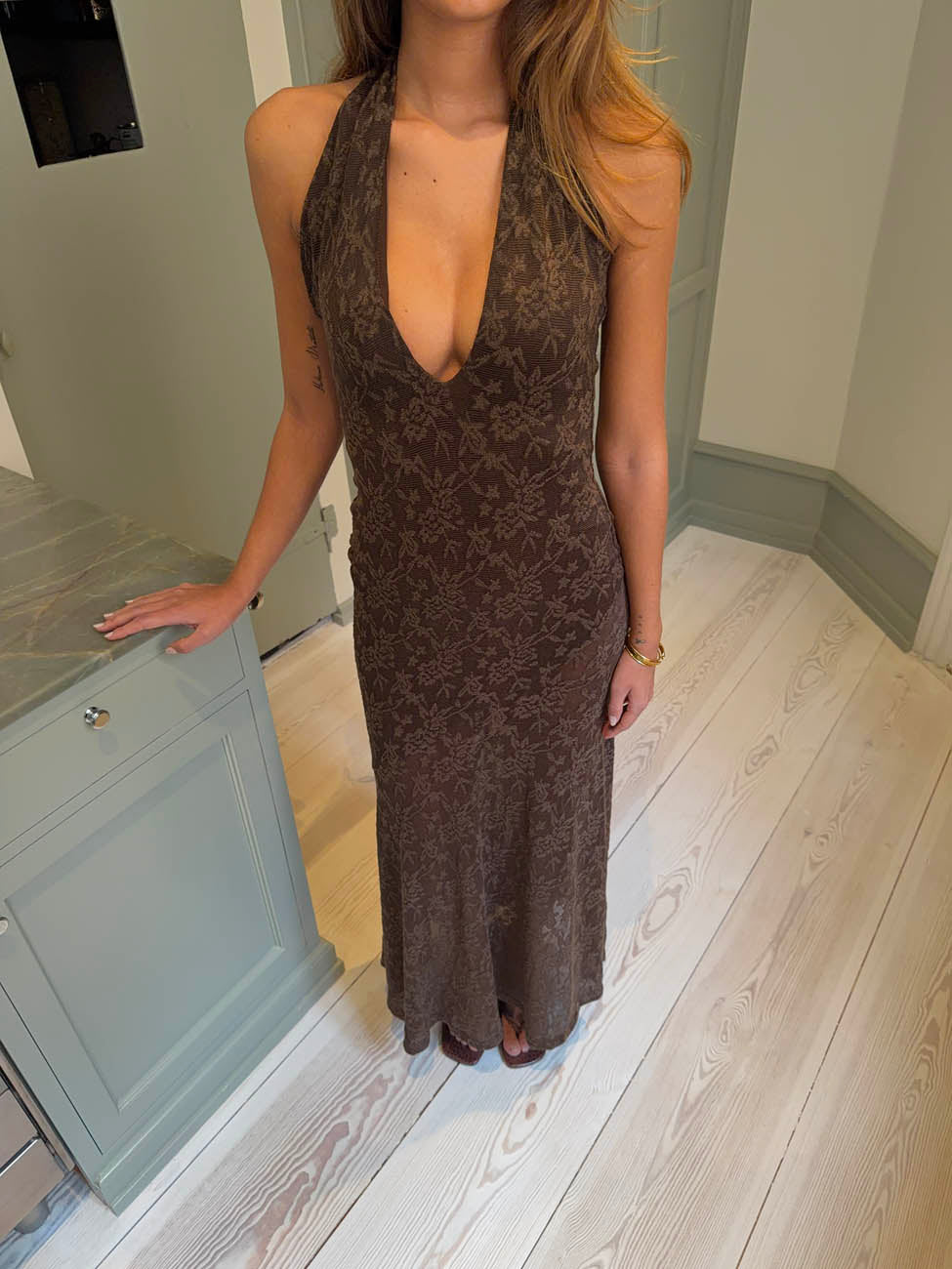 Den dybe halterneck-udskæring bindes i nakken og fremhæver skuldre og dekolleté på smukkeste vis, mens kjolens lange, let draperede pasform skaber en slank og harmonisk silhuet. Perfekt til festlige begivenheder, sommerdage eller aftenlook, hvor du ønsker noget både elegant og unikt.