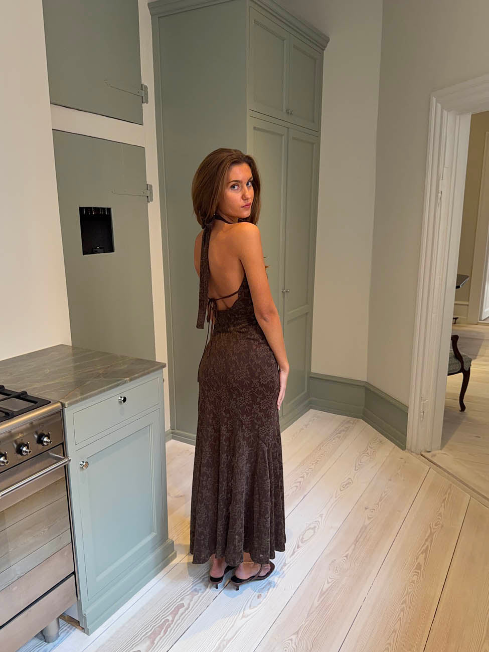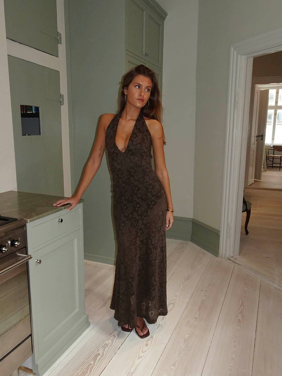 Denne smukke brune maxikjole kombinerer et elegant, vintage-inspireret look med et flatterende snit. Kjolen er lavet i et blødt, strækbart materiale med et diskret blomstret mønster, der giver et eksklusivt og feminint udtryk.