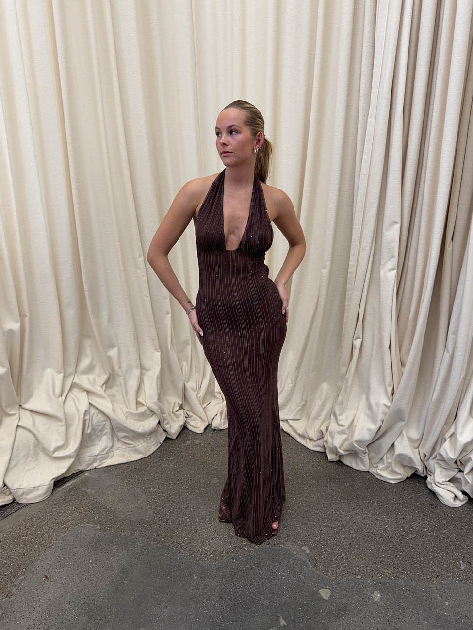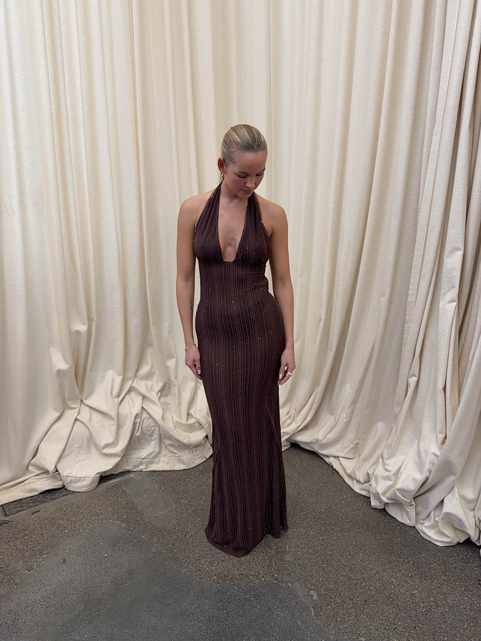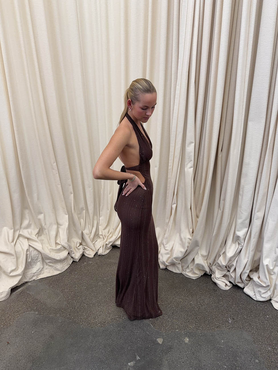 Denne elegante brune maxikjole er det perfekte valg til festlige anledninger. Kjolen er designet i et blødt, strækbart materiale, der smyger sig flot om kroppen og giver maksimal komfort. Det diskrete stribede glimmermønster tilføjer et subtilt, stjerneagtigt shine, som får kjolen til at glitre smukt, når du bevæger dig.