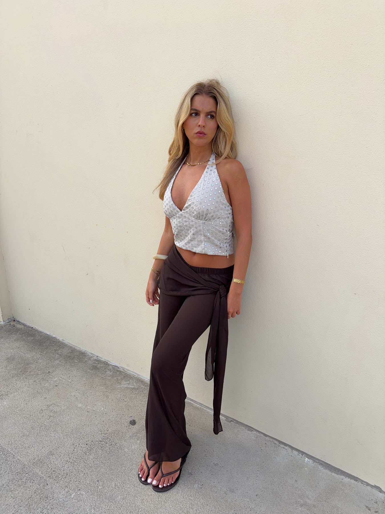 Denne smukke top kombinerer et feminint snit med fine, glitrende detaljer. Toppen har en dyb V-udskæring og en elegant halterneck-lukning, der bindes i nakken og giver et sofistikeret look. Det lette materiale er dekoreret med diskrete, skinnende palietter, som giver toppen et eksklusivt og festligt udtryk. Perfekt til både aftenbrug, fester og særlige anledninger.
