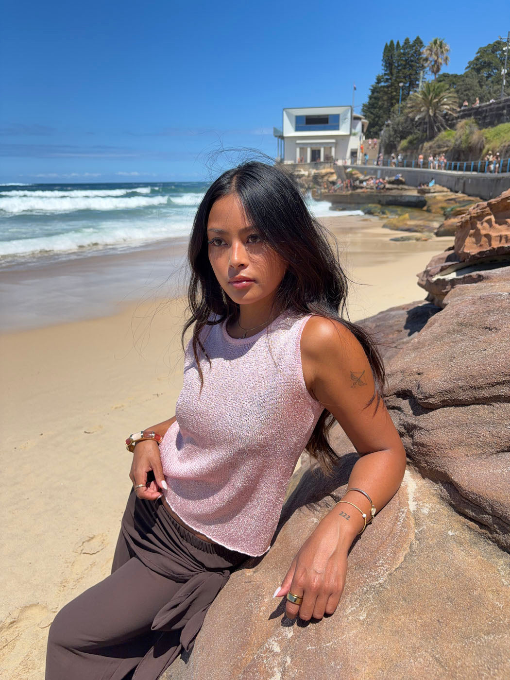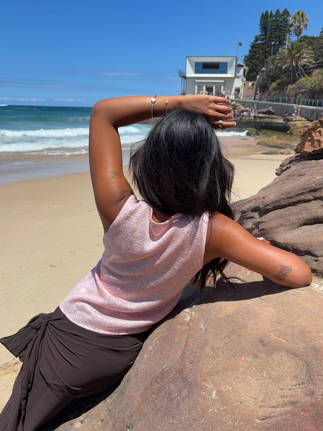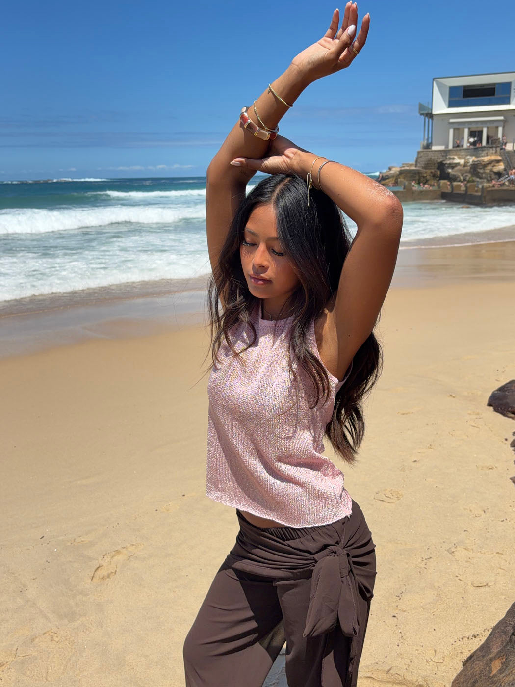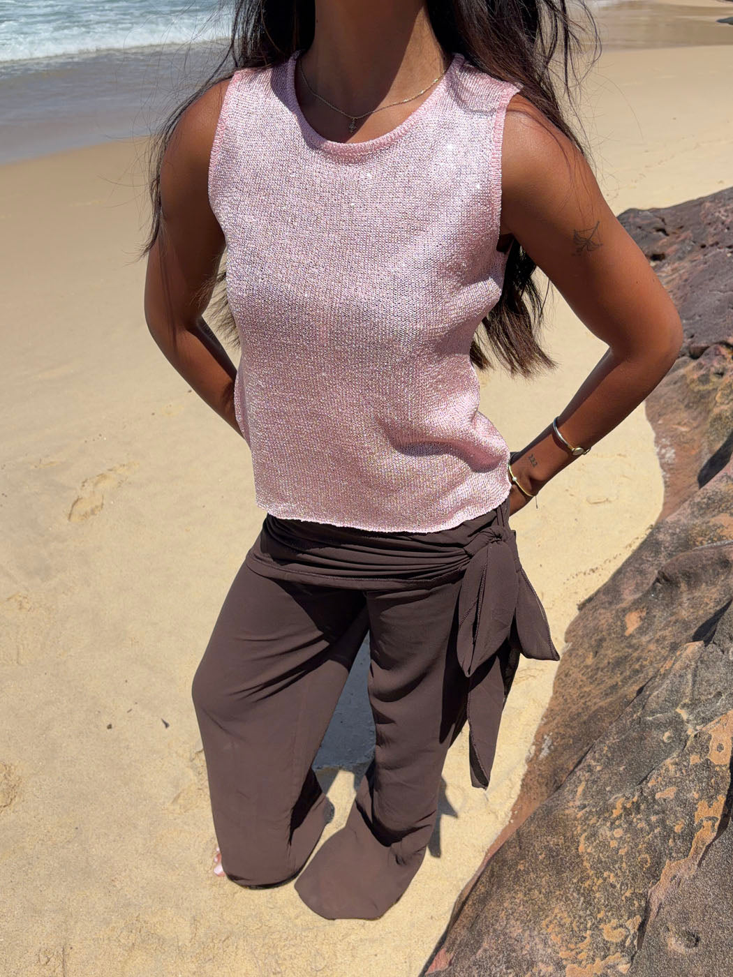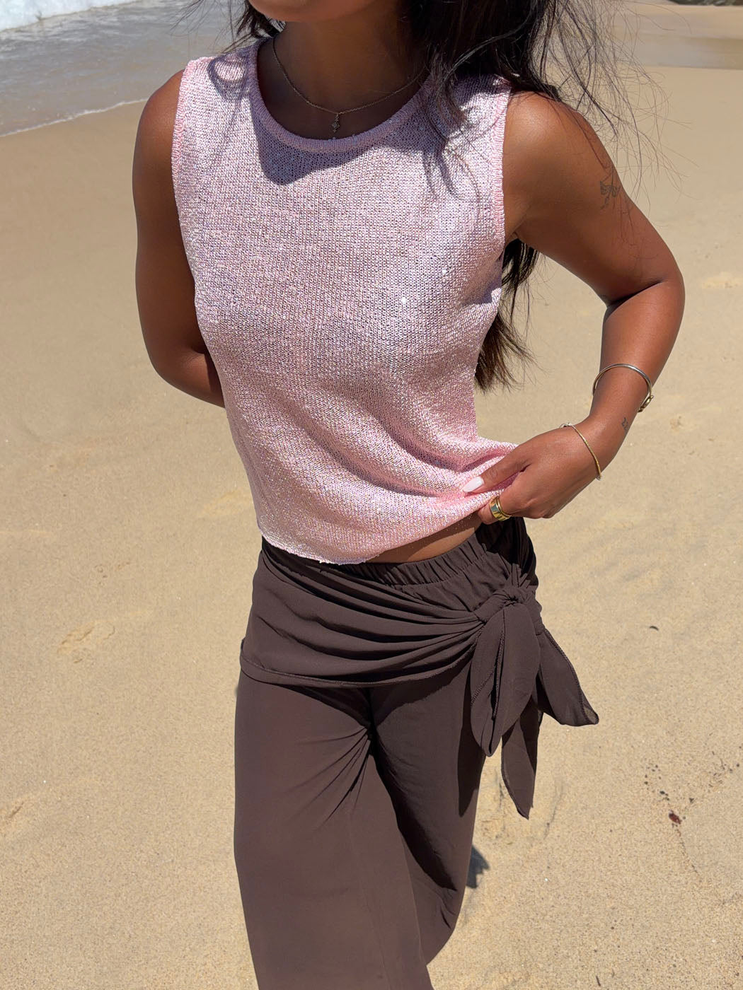 Silja toppen i lyserød glitter er den perfekte blanding af feminint og festligt. Med sin skinnende glitteroverflade fanger den lyset og skaber en elegant, iøjnefaldende look.