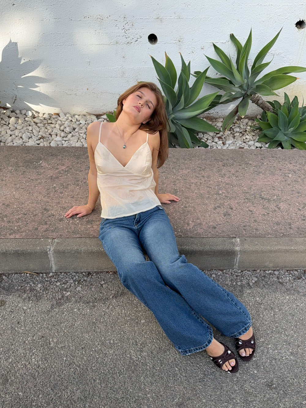 Denne lette og delikate top i en fin, cremefarvet nuance er fremstillet i en transparent chiffon med diskrete blomsterbroderier. De slanke stropper og den let vuggende silhuet skaber et luftigt og feminint look, perfekt til varme dage og lyse sommeraftener. Det transparente materiale giver et elegant lag-på-lag-udtryk – style den med en enkel bralette eller som kontrast over en tanktop. De små broderede detaljer tilfører et romantisk og håndlavet præg, mens snittet sikrer komfort og lethed. En poetisk style til både hverdagsbrug og særlige lejligheder.