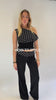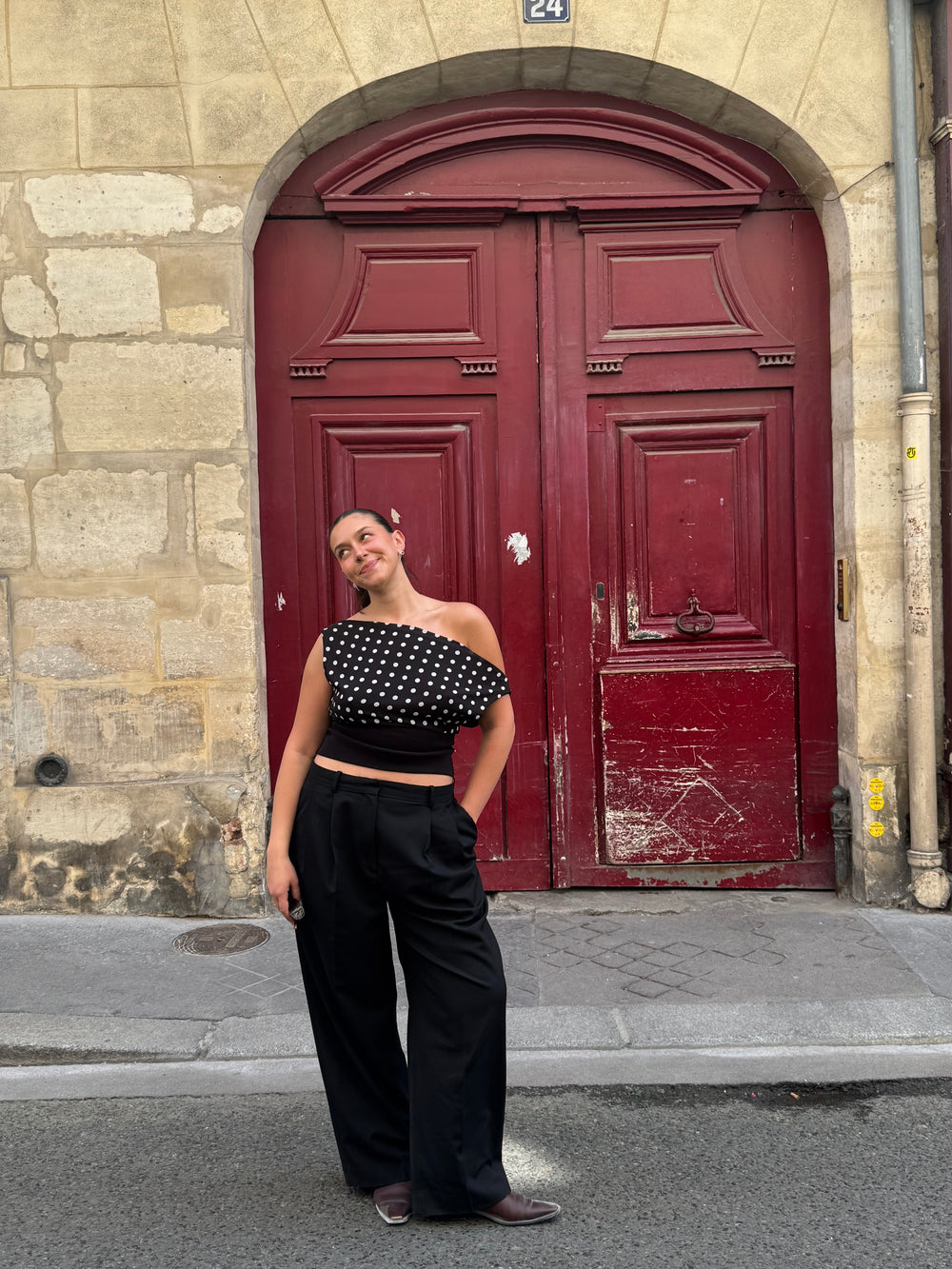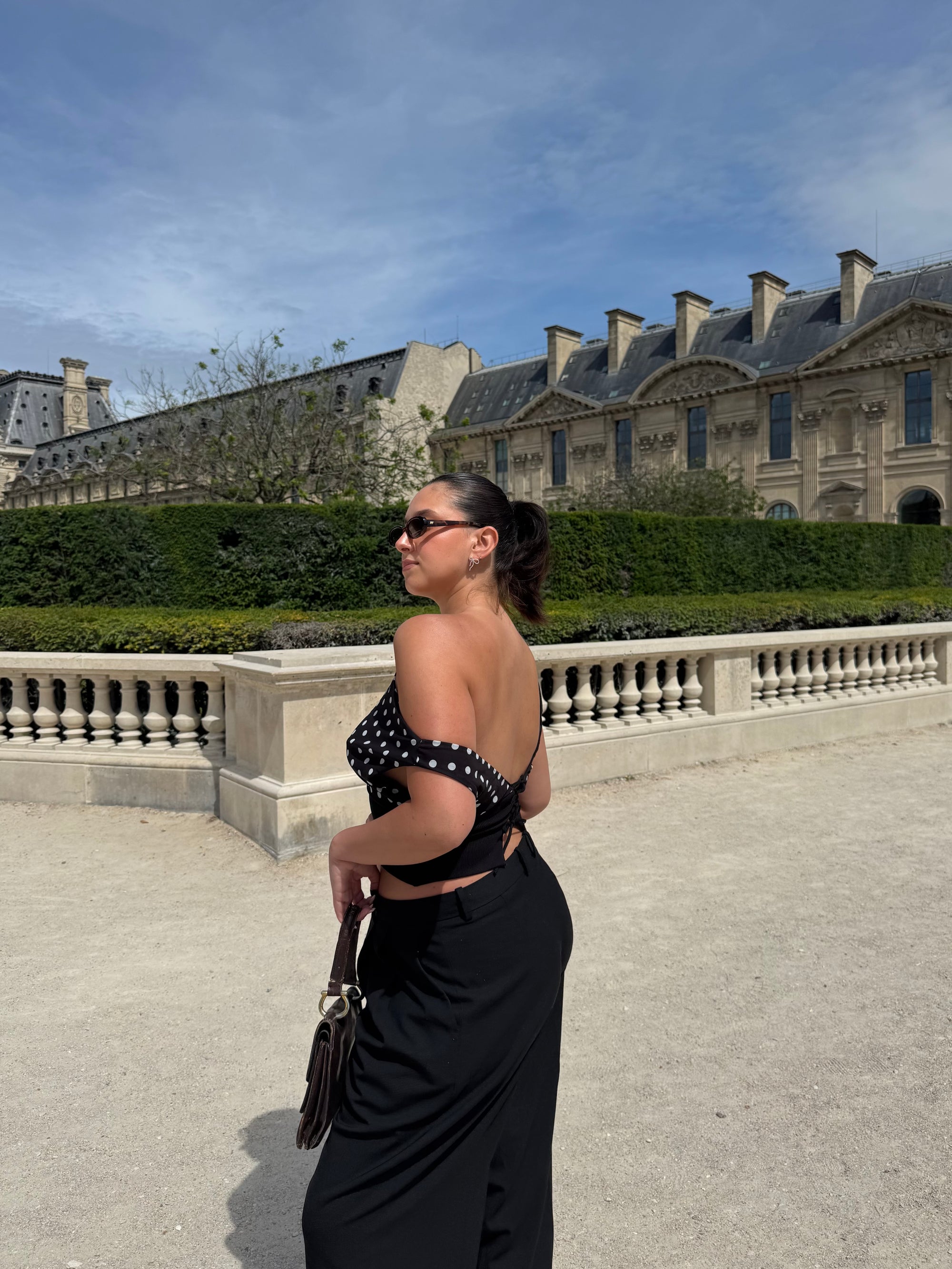 Denne sorte top med hvide polkaprikker kombinerer moderne stil med en flatterende pasform. Øverste del af toppen er løs, lavet af et let og luftigt materiale, der skaber en afslappet og feminin silhuet. Nederst på toppen er stoffet mere tætsiddende og ribbet, hvilket giver en figursyet effekt, der fremhæver din form på en elegant måde. Toppen kan justeres på ryggen med snore, hvilket gør det muligt at tilpasse pasformen efter din krop. Det tidløse polka prikkemønster tilfører et strejf af klassisk charme, mens den smarte kombination af materialer gør denne top både behagelig og stilfuld – perfekt til både hverdag og festlige lejligheder.
