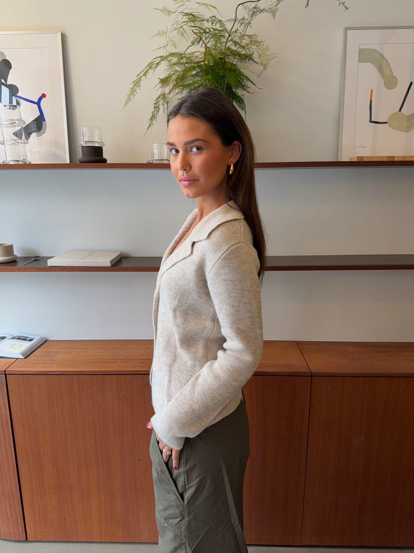 Denne elegante strikjakke er det perfekte valg, når komfort og klassisk stil skal gå hånd i hånd. Jakken er fremstillet i en blød og let strikkvalitet med en smuk, meleret struktur, der giver et eksklusivt og roligt udtryk. Den lyse nuance gør den nem at kombinere med resten af garderoben og ideel til både hverdag og arbejde.