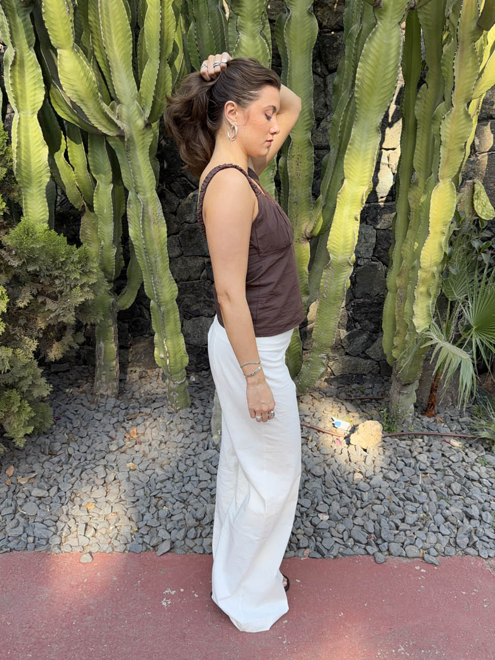 Denne feminine top i varm brun nuance kombinerer enkelthed med raffinerede detaljer. Den bløde bomuldsblanding føles behagelig mod huden, mens de rynkede stropper giver et legende og moderne twist. Den let strukturerede overdel falder elegant ned over kroppen og skaber en afslappet, men stilfuld silhuet. En alsidig style, der både kan dresses op med højtaljede bukser og smykker til aftenen – eller bruges med shorts og sandaler til en varm sommerdag. Den dæmpede farve gør den nem at kombinere med både lyse og mørke toner i garderoben.