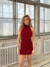 Halterneck mini-kjole med åben ryg i glimmer materiale. Kjolen er tætsiddende og giver en flot figur.