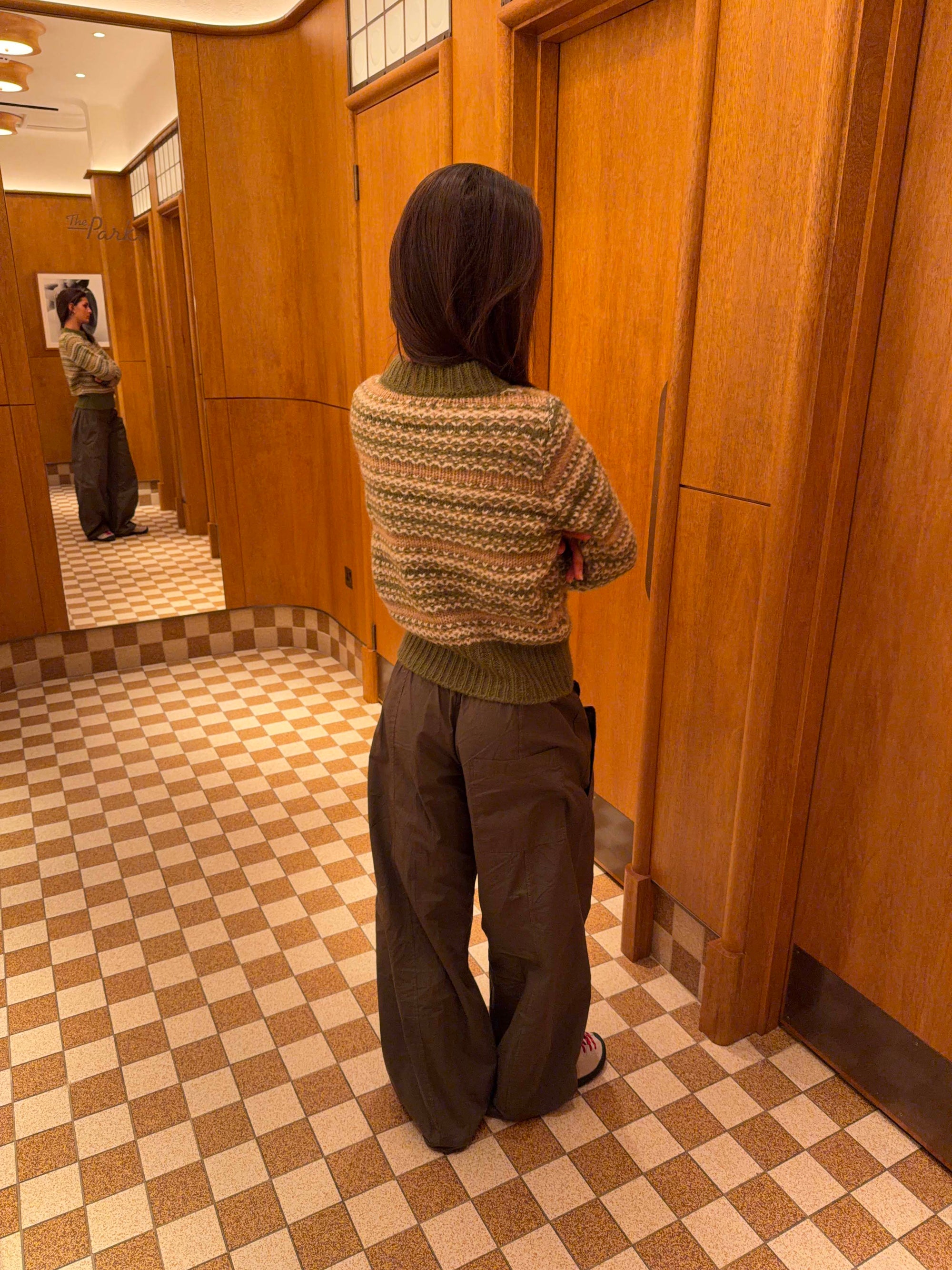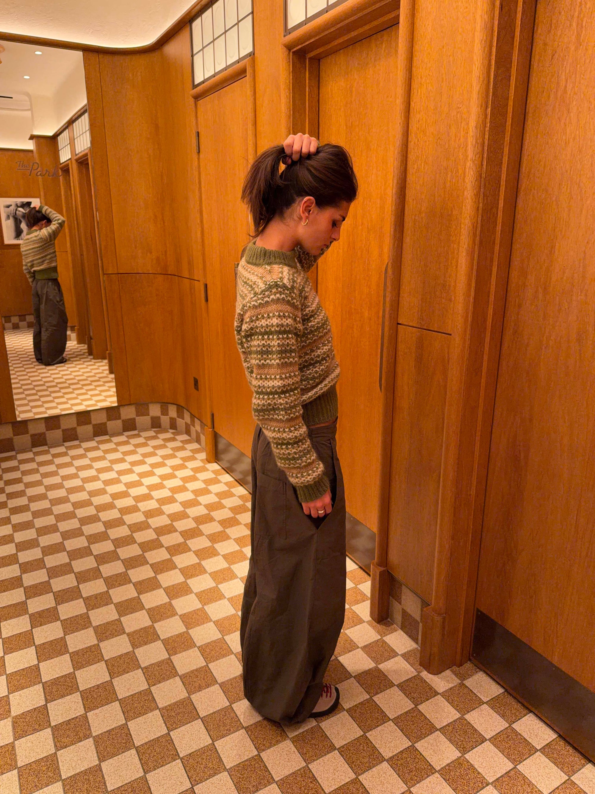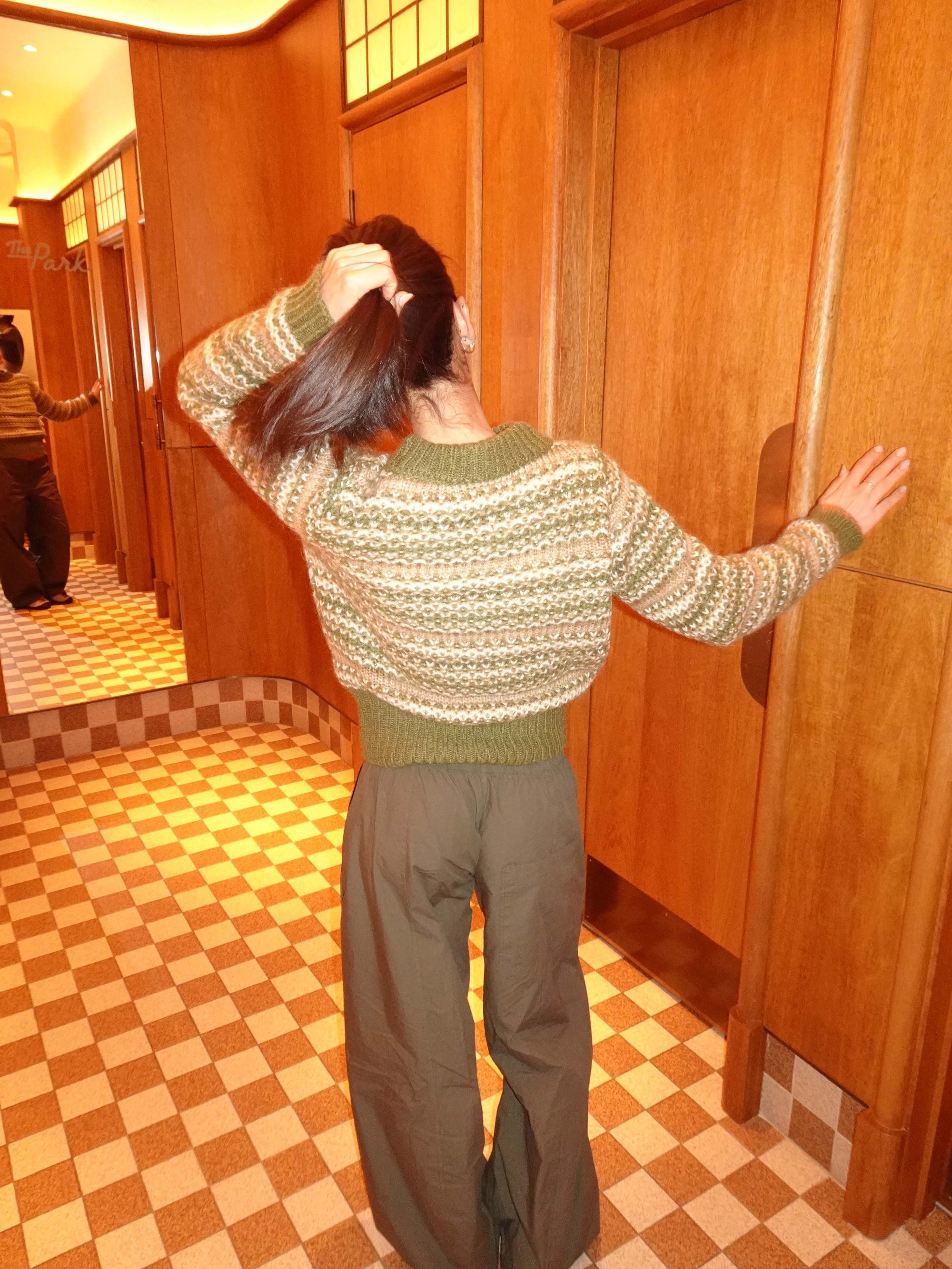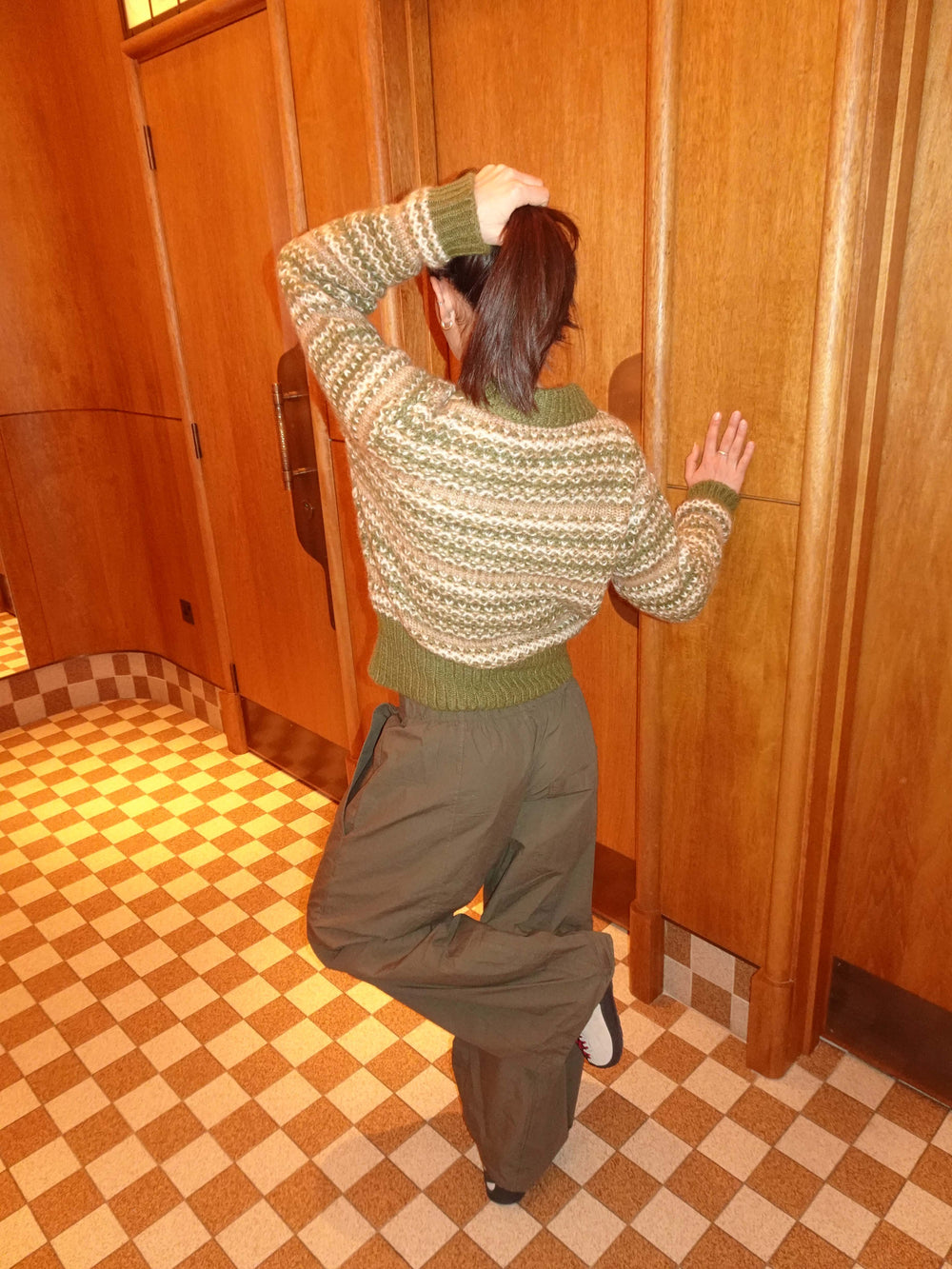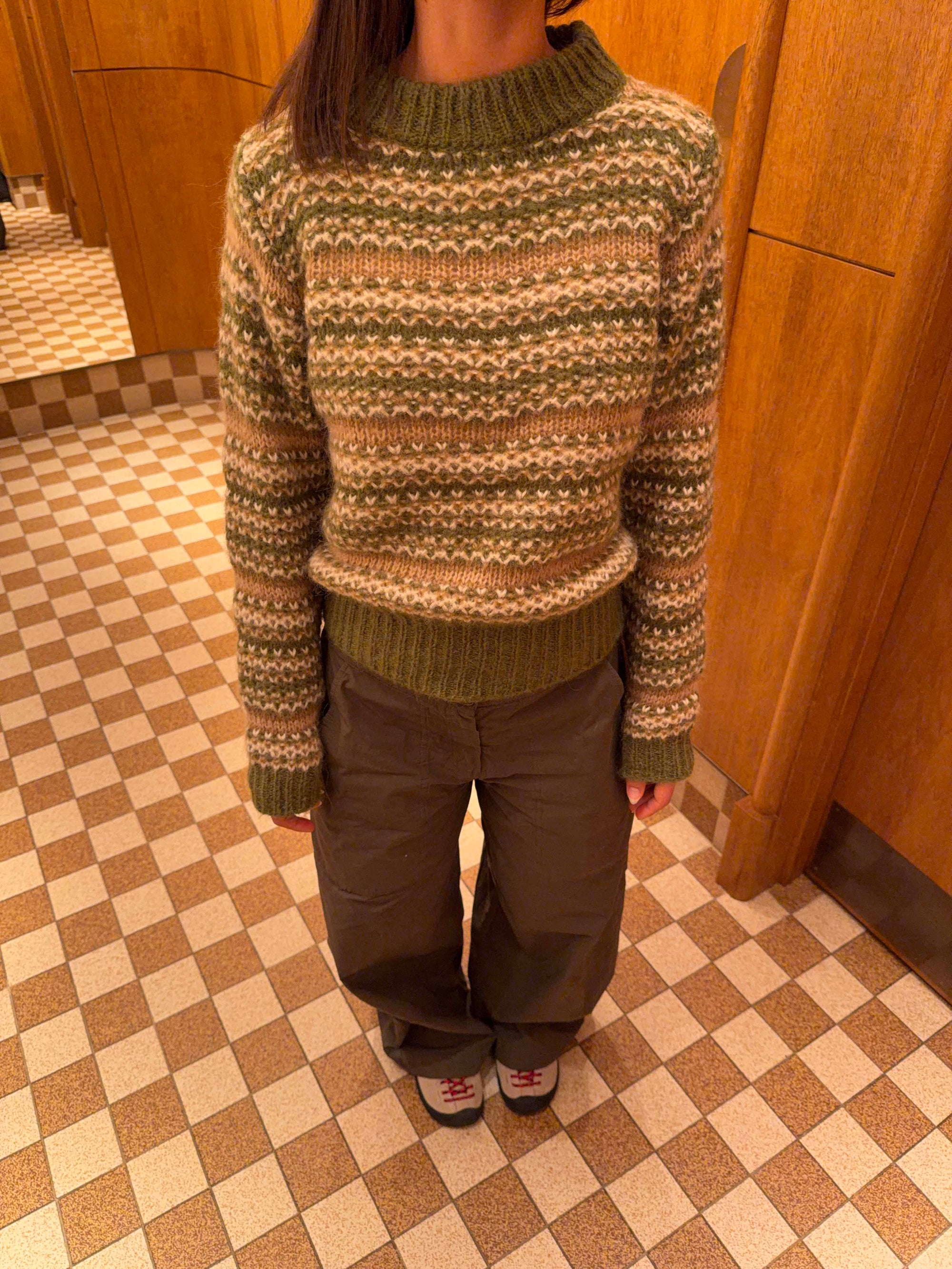 Striktrøjen er designet i et charmerende flerfarvet mønster i olivengrøn, beige, creme og brune nuancer, som giver et blødt og harmonisk udtryk. Den chunky, luftige strikkekvalitet gør den ekstra behagelig at have på – perfekt til de kølige dage.