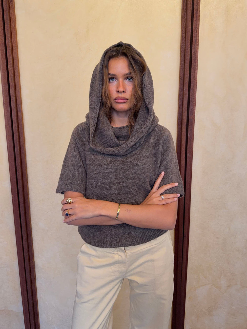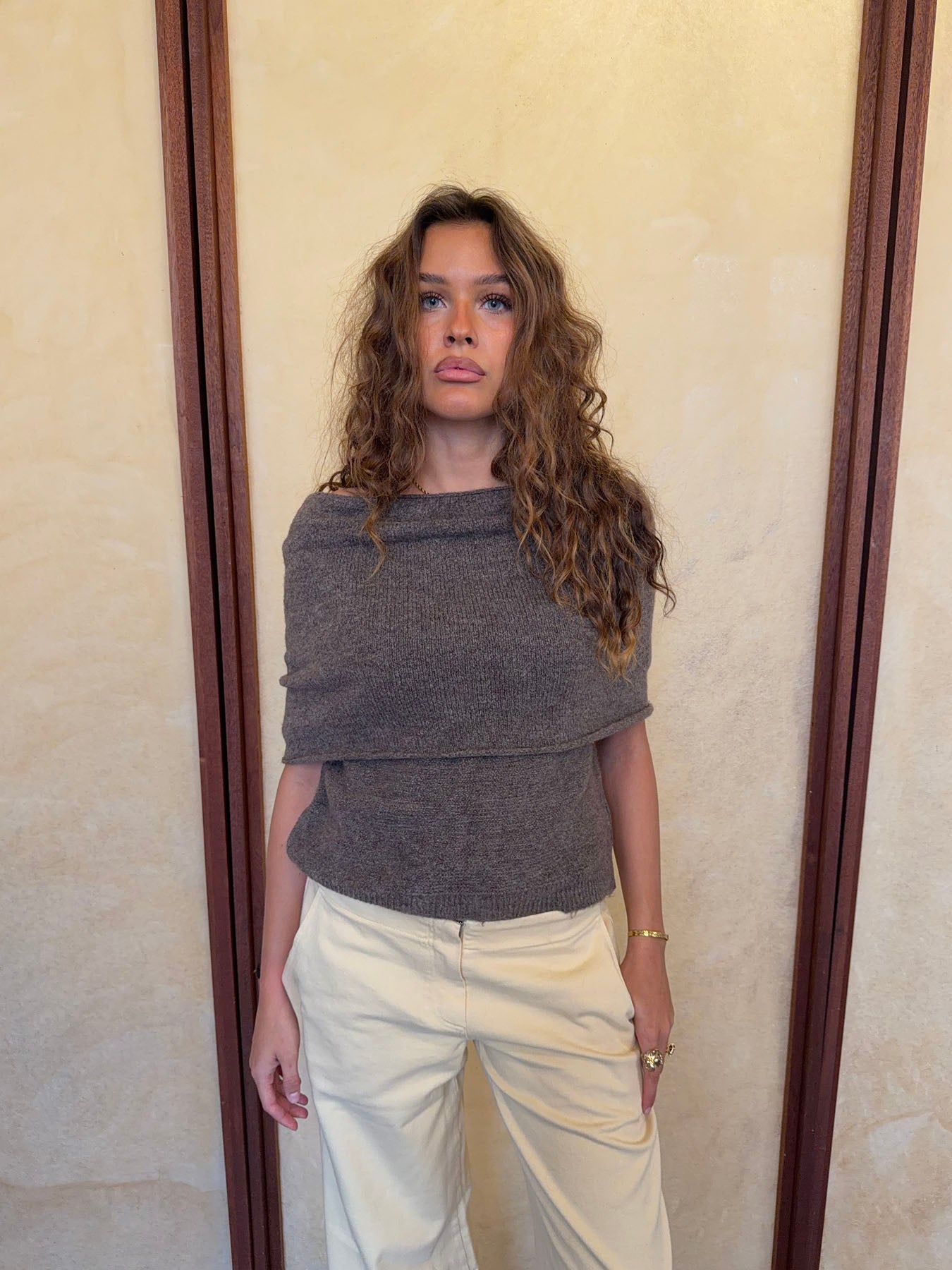 Denne elegante striktrøje i en taupe nuance er et unikt og alsidigt musthave i garderoben. Trøjen er designet med en smart, aftagelig eller foldbar halsdel, som kan styles på flere måder: