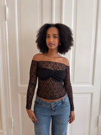 Hvid blondebluse i off-shoulder. Toppen har et ekstra lag med blonde på brystet, så det er mindre gennemsigtigt.