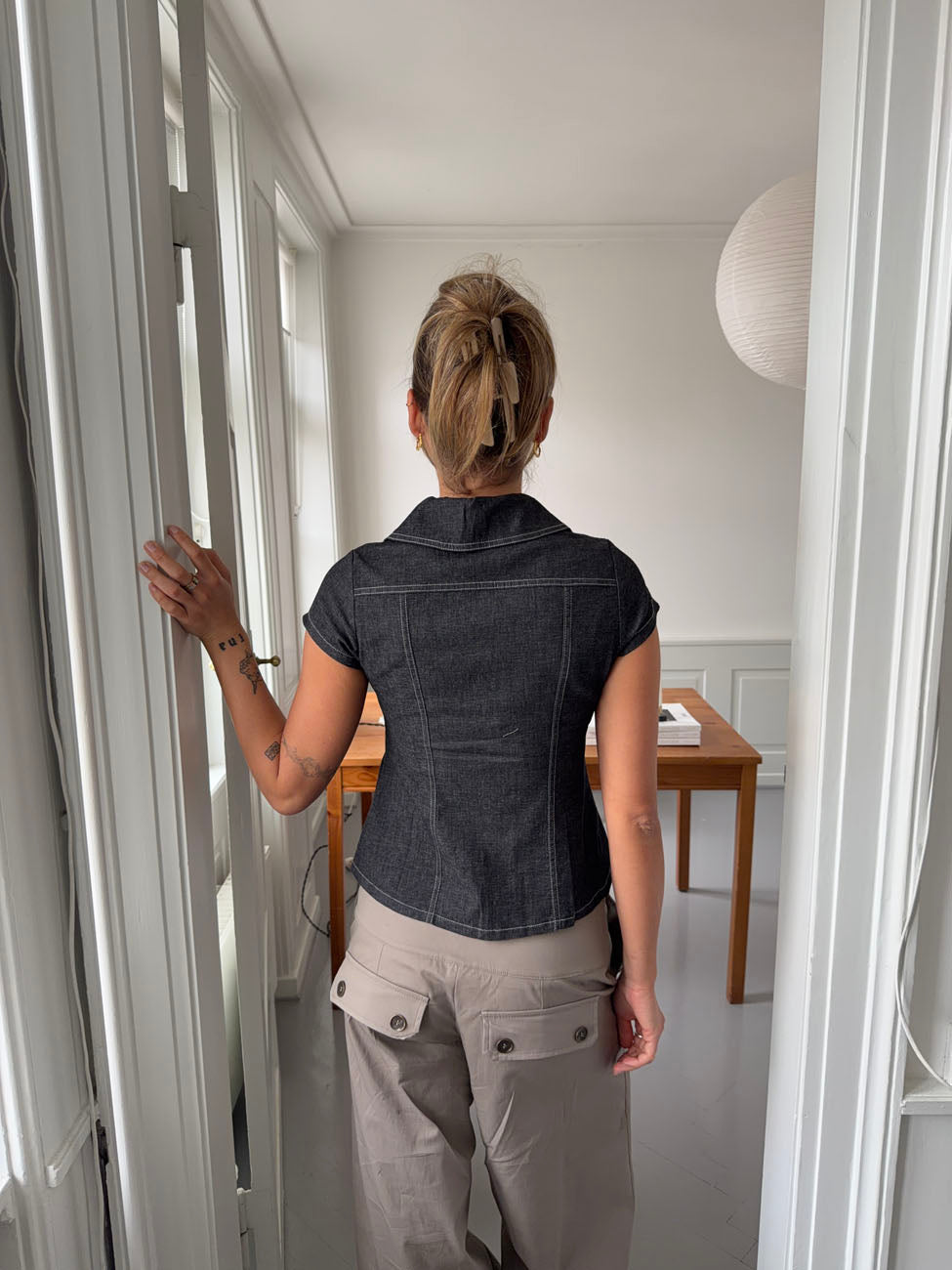 En kort og figursyet denimskjorte i washed black med et cool workwear-inspireret udtryk. Den er lavet i en blød, men struktureret denimkvalitet og har tydelige kontrastsyninger, som giver et råt og moderne look. Perfekt som lag over en t-shirt, skjorte eller kjole – året rundt.