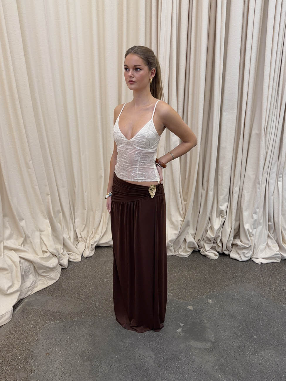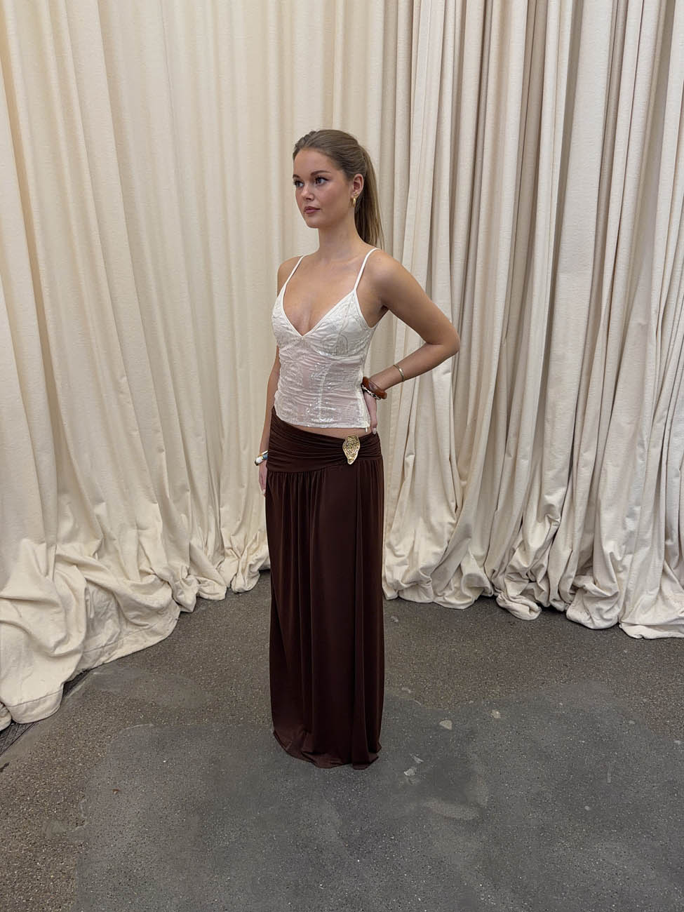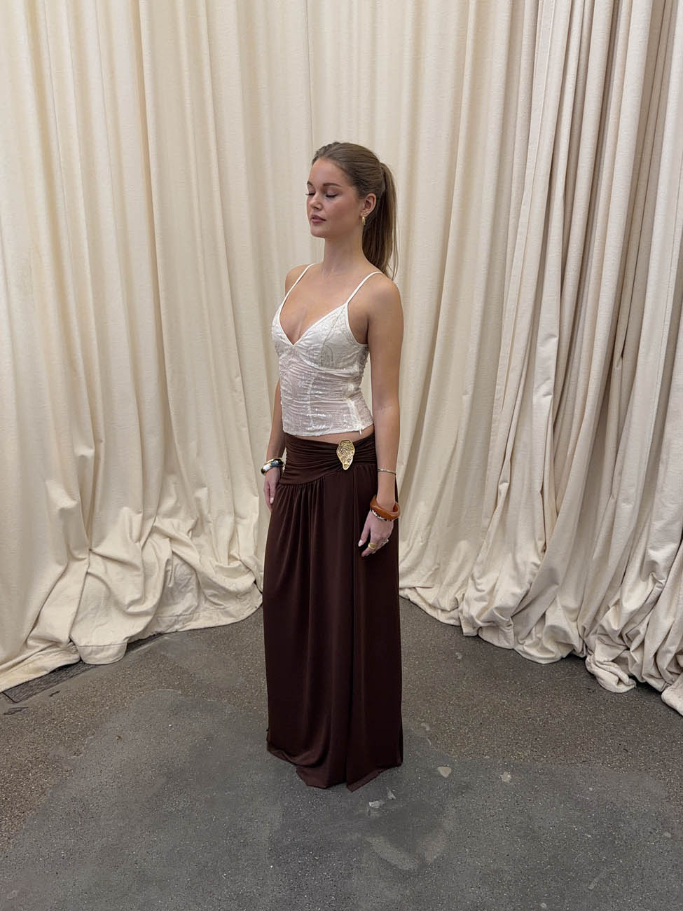 Denne elegante brune maxi-nederdel kombinerer komfort med et luksuriøst og sofistikeret udtryk. Det bløde, let skinnende materiale falder smukt om kroppen og skaber en flatterende silhuet. Den draperede detalje foran giver et eksklusivt look, mens den guldfarvede dekoration tilføjer et raffineret og feminint touch.