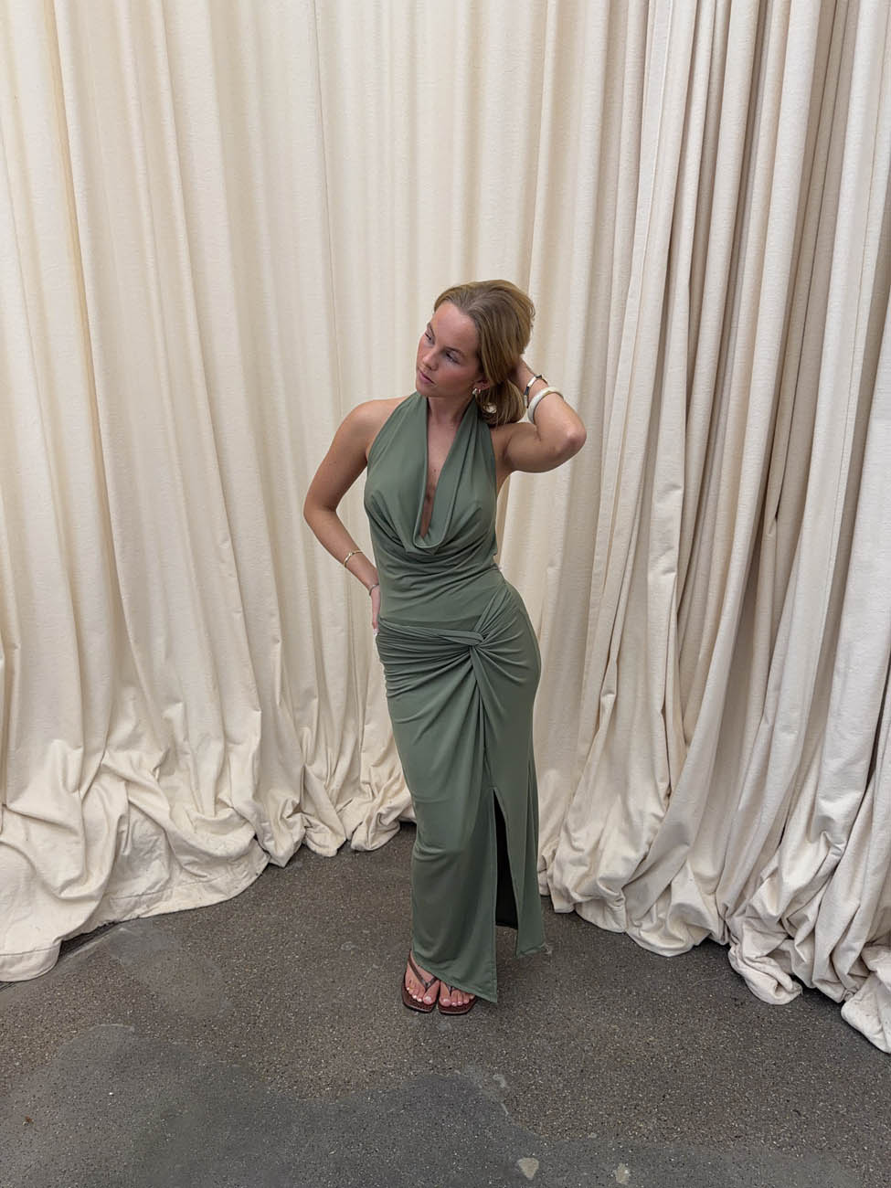 Denne elegante maxikjole i støvet grøn er fremstillet i et blødt, glansfuldt stretchmateriale, der falder smukt og skaber en lang, slank silhuet. Kjolen har en diskret drapering i midten, som fremhæver figuren og giver et flatterende, sofistikeret udtryk.