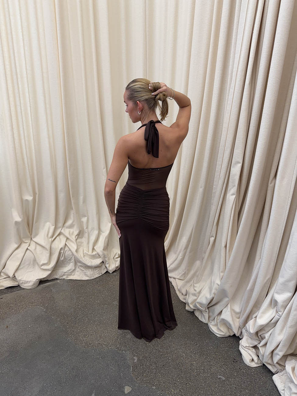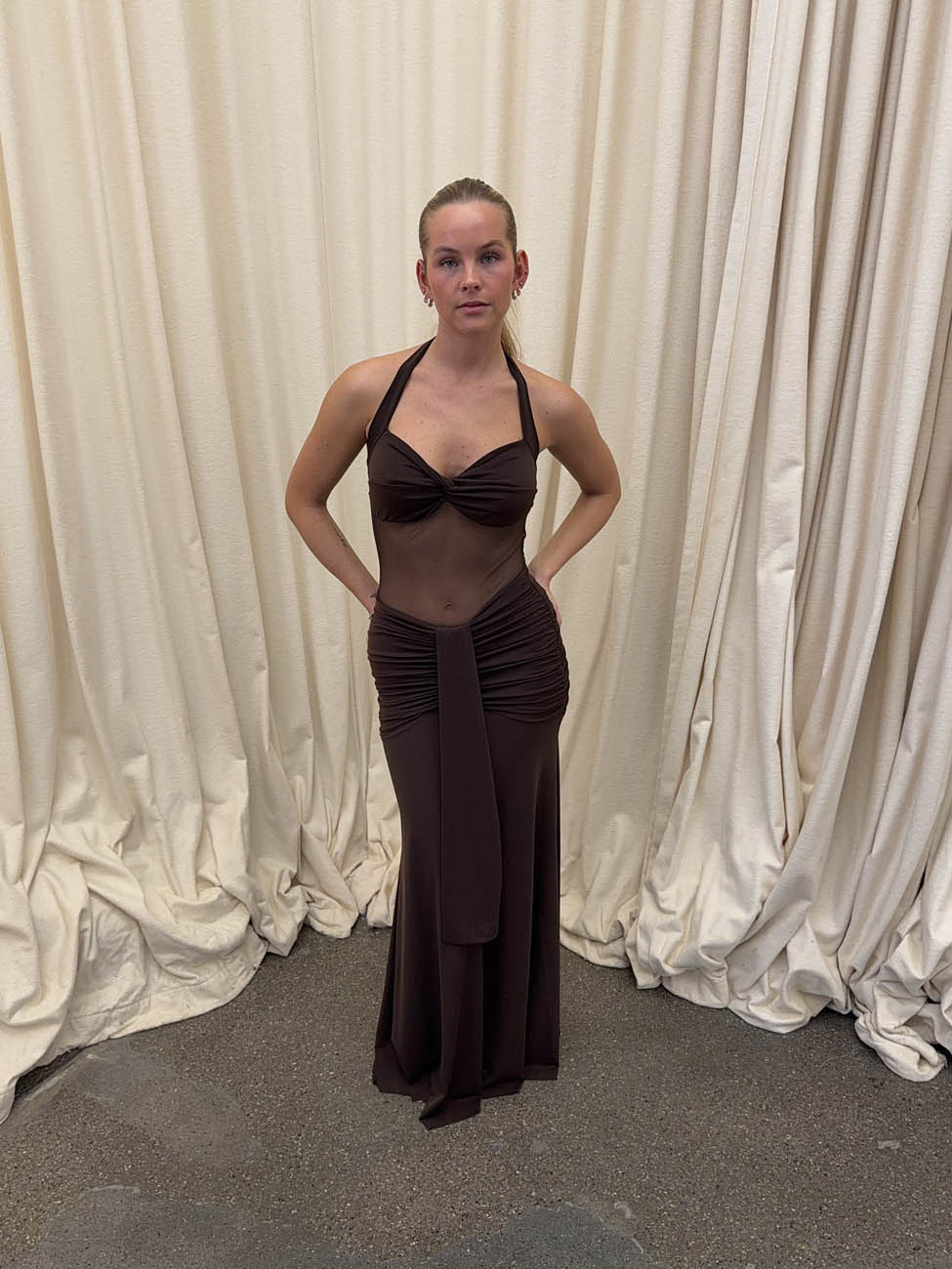 Denne smukke maxikjole i dyb brun nuance kombinerer elegance med et moderne, sofistikeret design. Kjolen har en flatterende halterneck-top, der bindes i nakken og skaber et feminint udtryk, mens den draperede front giver en smuk form og fremhæver taljen. Det lange, let udsvingede skørt falder flot langs kroppen og giver et elegant, flydende look ved hver bevægelse.Vaskeanvisning: kan vaskes ved 30°, ikke egnet til tørretumbler