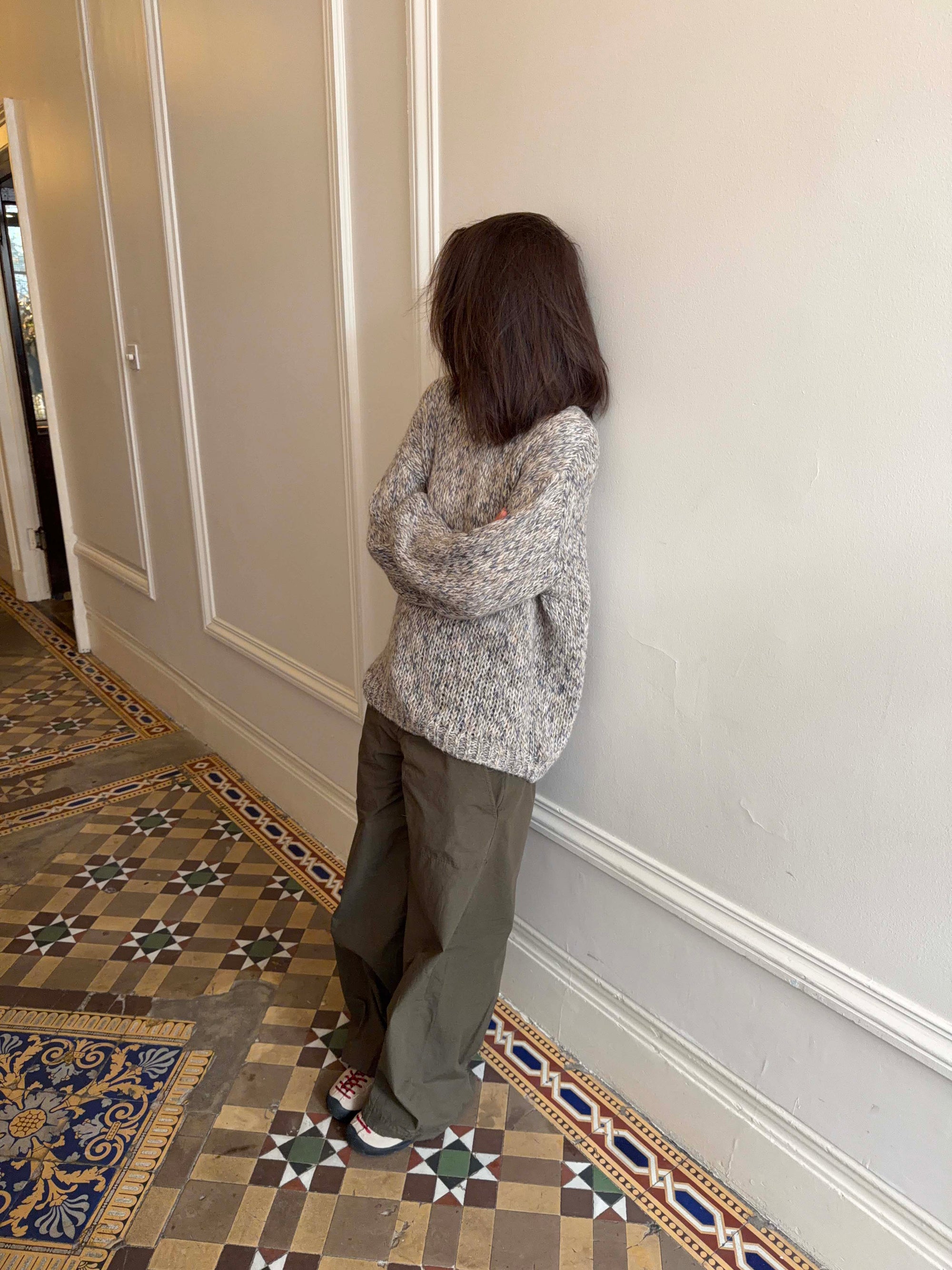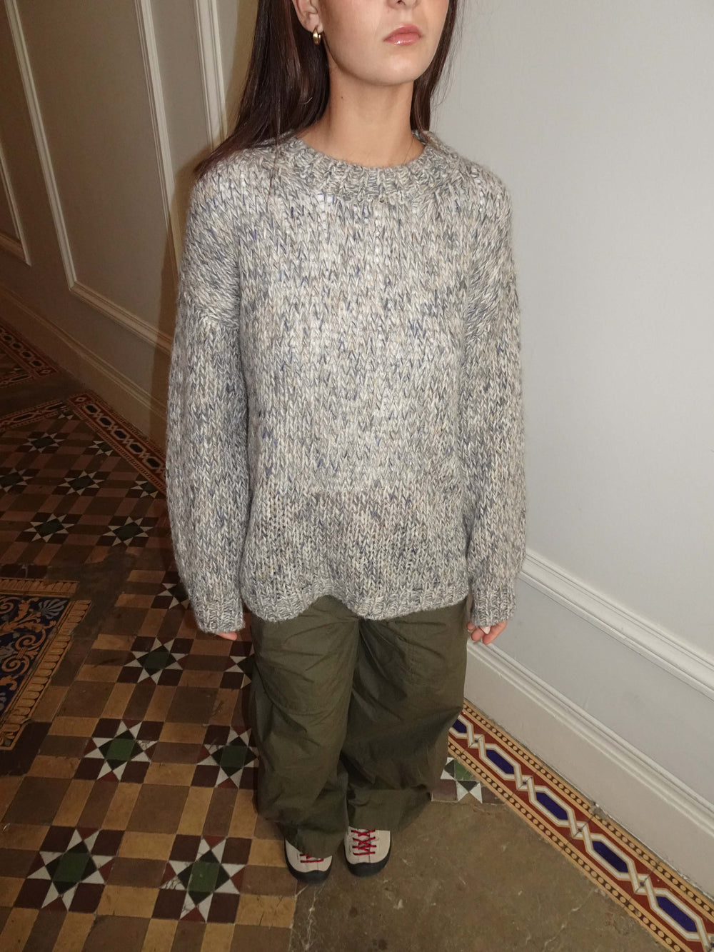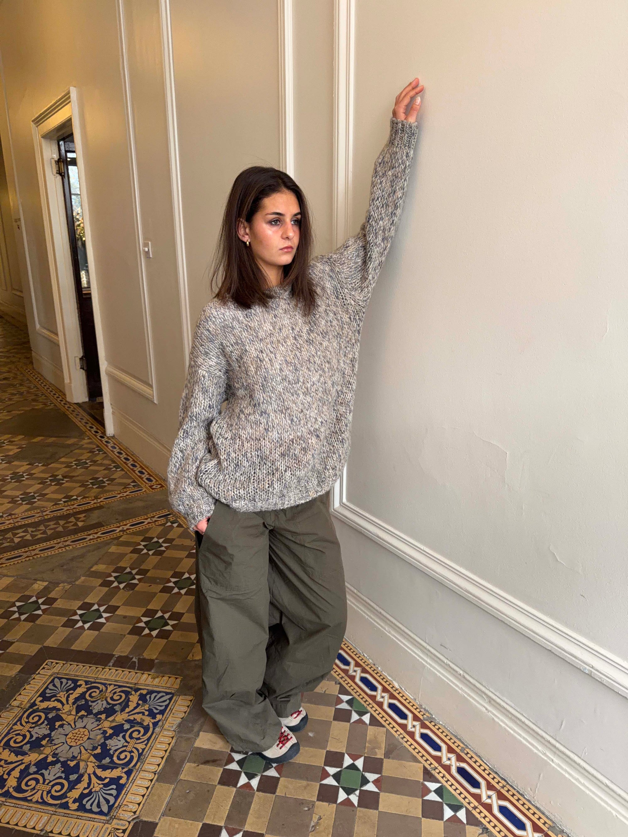 Denne chunky melerede striktrøje er den perfekte kombination af hygge, varme og stil. Den er strikket i en blød, kraftig kvalitet med et smukt meleret mønster i grå og naturfarvede toner, som giver et eksklusivt og rustikt udtryk.
