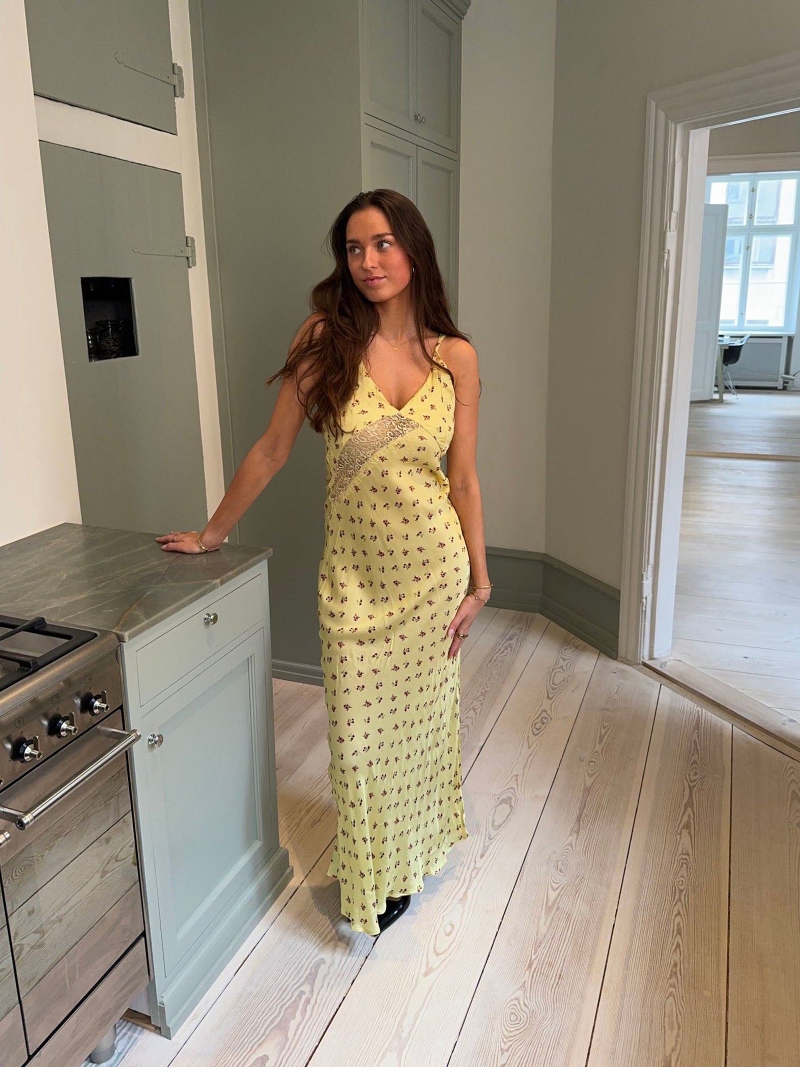 Vores Emily kjole er en elegant maxi kjole i satin, prydet med små blomster, der dækker hele kjolen for et delikat og feminint udtryk. Kjolens V-halsudskæring giver et smukt, flatterende look, mens de dobbelte stropper tilføjer en moderne og sofistikeret detalje. Den lette satin bevæger sig smukt med kroppen og giver en flydende effekt.