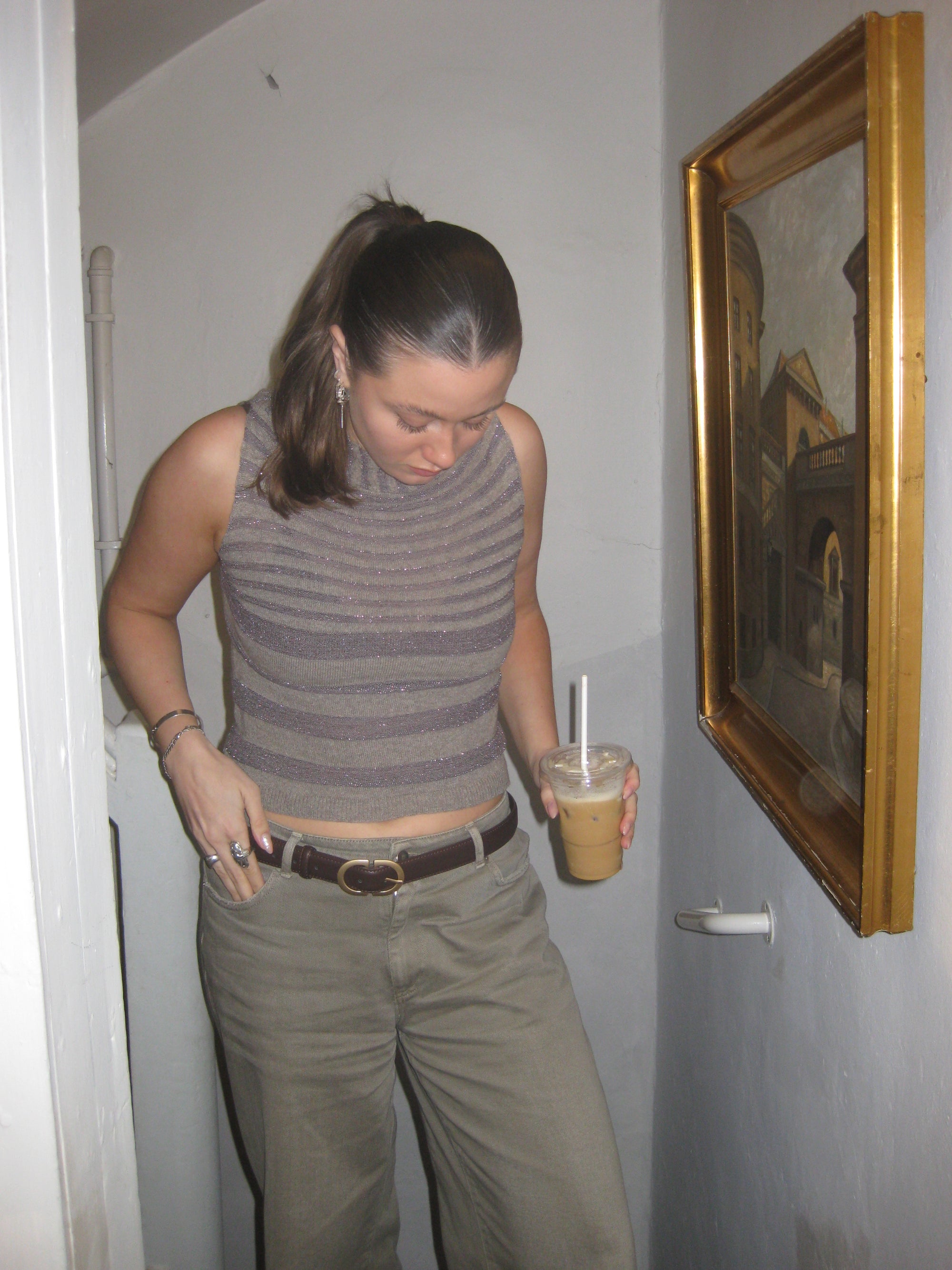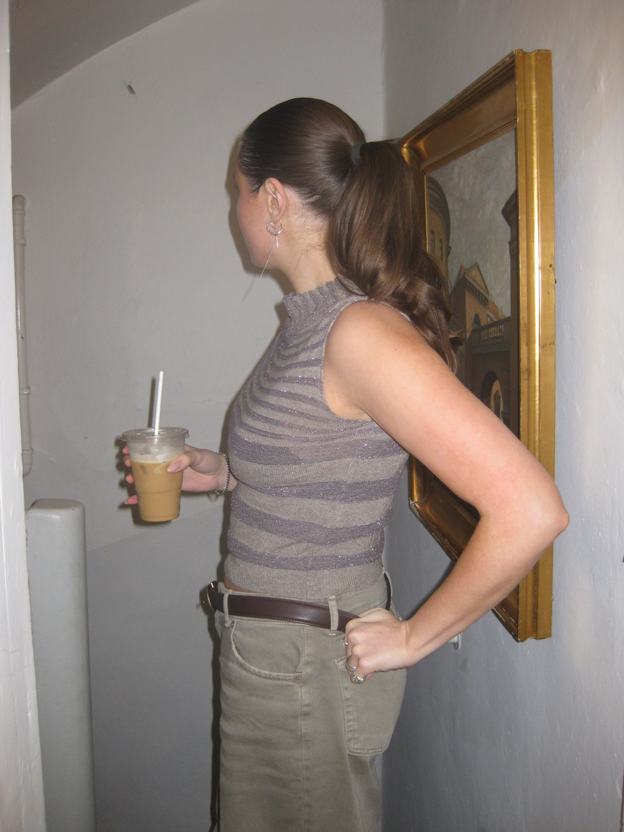 Denne top har en utrolig behagelig pasform, der føles let og komfortabel mod huden. Den er designet uden ærmer og har en bred udskæring, som giver et afslappet og sofistikeret udtryk. Det glitrende materiale tilføjer et elegant, men stilfuldt touch, der får toppen til at skinne - perfekt til både hverdagsbrug og festlige lejligheder.