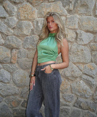 Denne top er helt perfekt til festlige begivenheder. Denne top er cropped og har et halterneckdesign, som bindes i nakken. Den har smock bagpå, som gør den elastisk og er lavet i et satinmateriale.