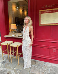 Lilli er en elegant maxi kjole i sort med klassiske hvide polka prikker. Kjolen har en tætsiddende overdel med smalle stropper og et langt, flydende skørt, der giver et sofistikeret og feminint udtryk. Perfekt til sommerfester, middage eller en aften ude, hvor du vil kombinere komfort og stil.