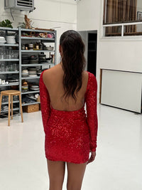 Vores smukke Calinda kjole med pallietter har et tætsiddende fit og er perfekt til nytår og andre festlige begivenheder. Den er lårkort med lange ærmer og har den flotteste åbne ryg.