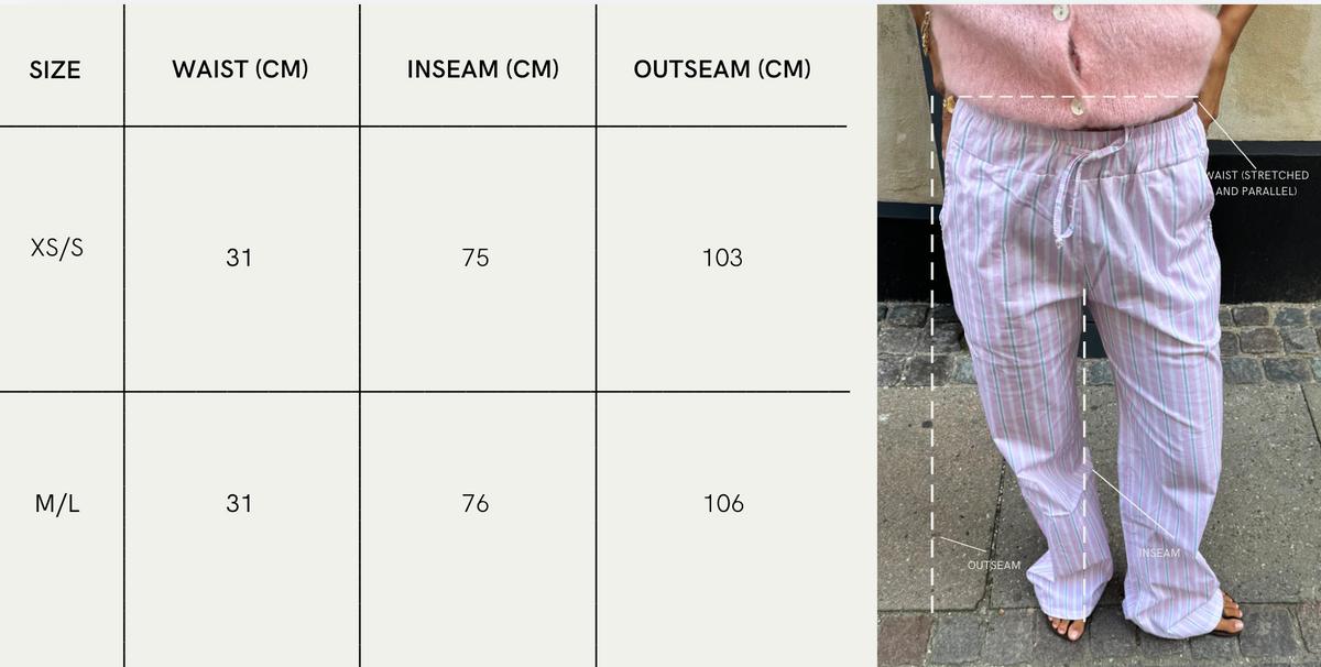 Disse bukser har et løst og afslappet fit. De har et elastisk taljebånd med bindebare snore. Bukserne har skrå lommer i siderne.
