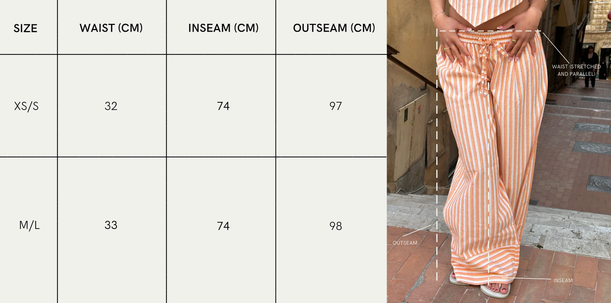 Vores fine Aura bukser er i et flot og let materiale perfekt til sommeraftner! Bukserne har hvide og orange striber og har et loose fit. For at fuldende looket, kan du matche bukserne med vores Aura stribede top!