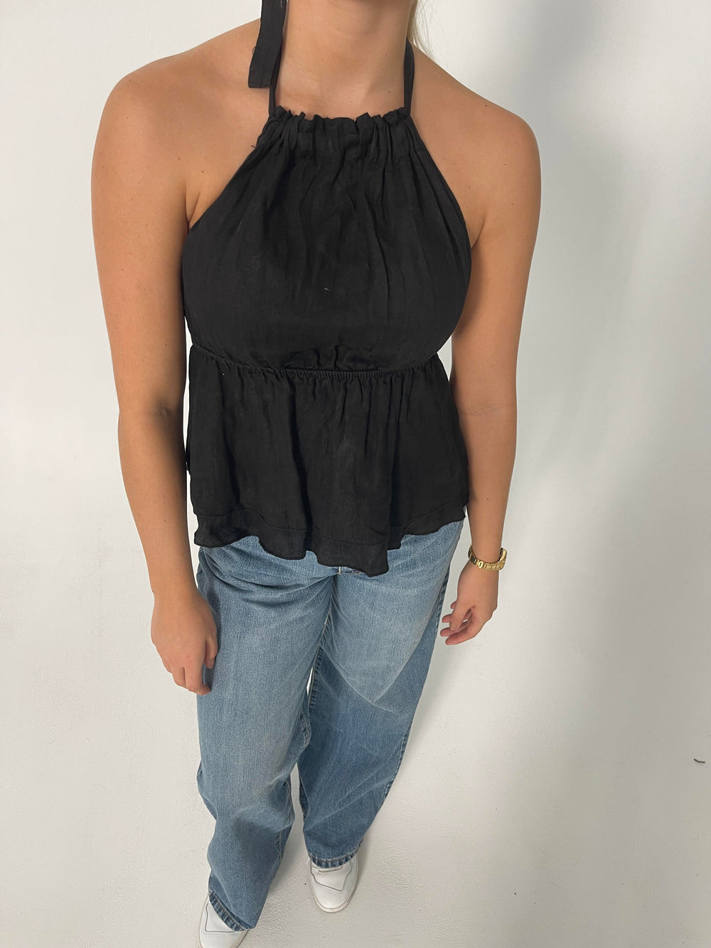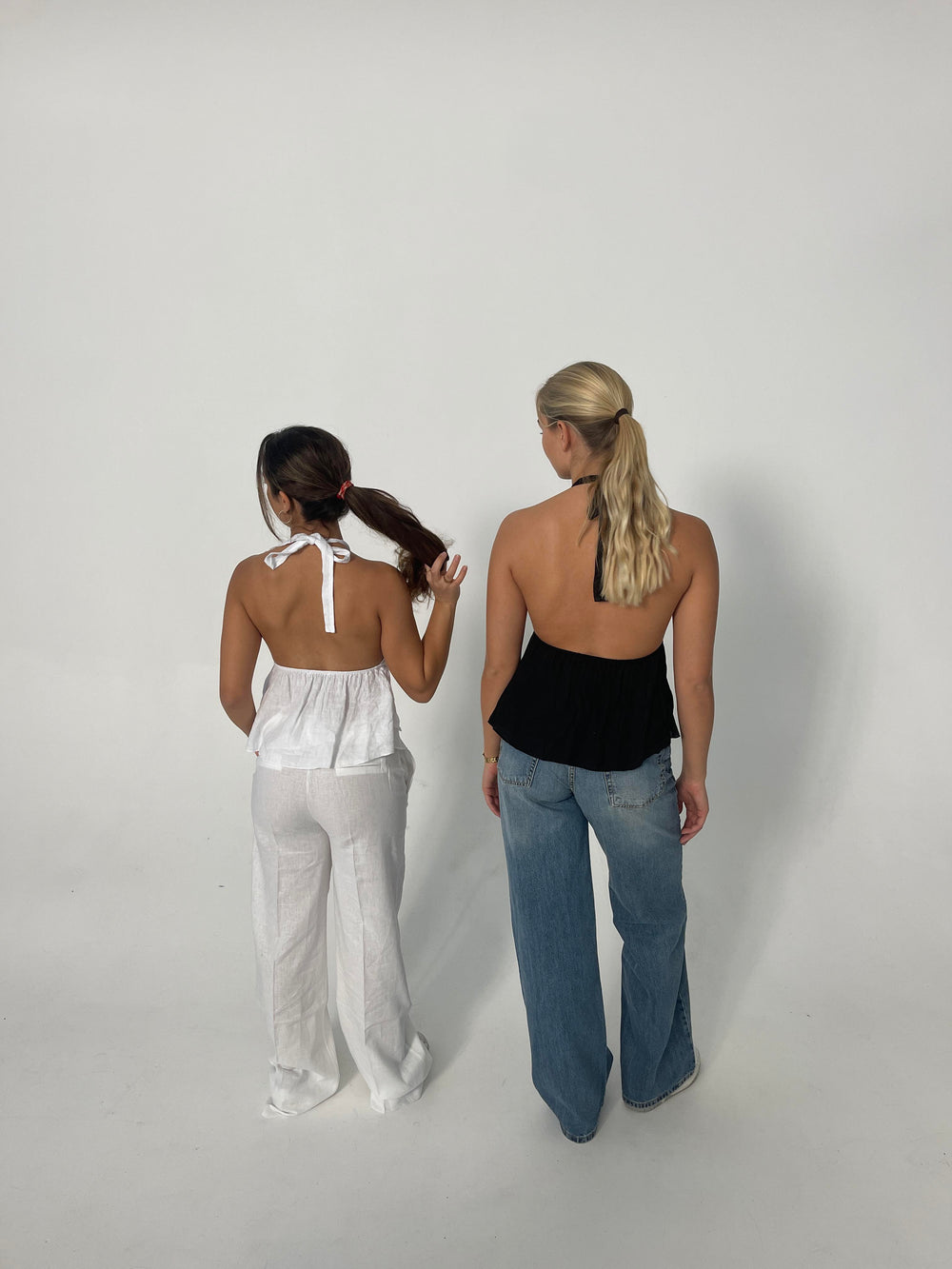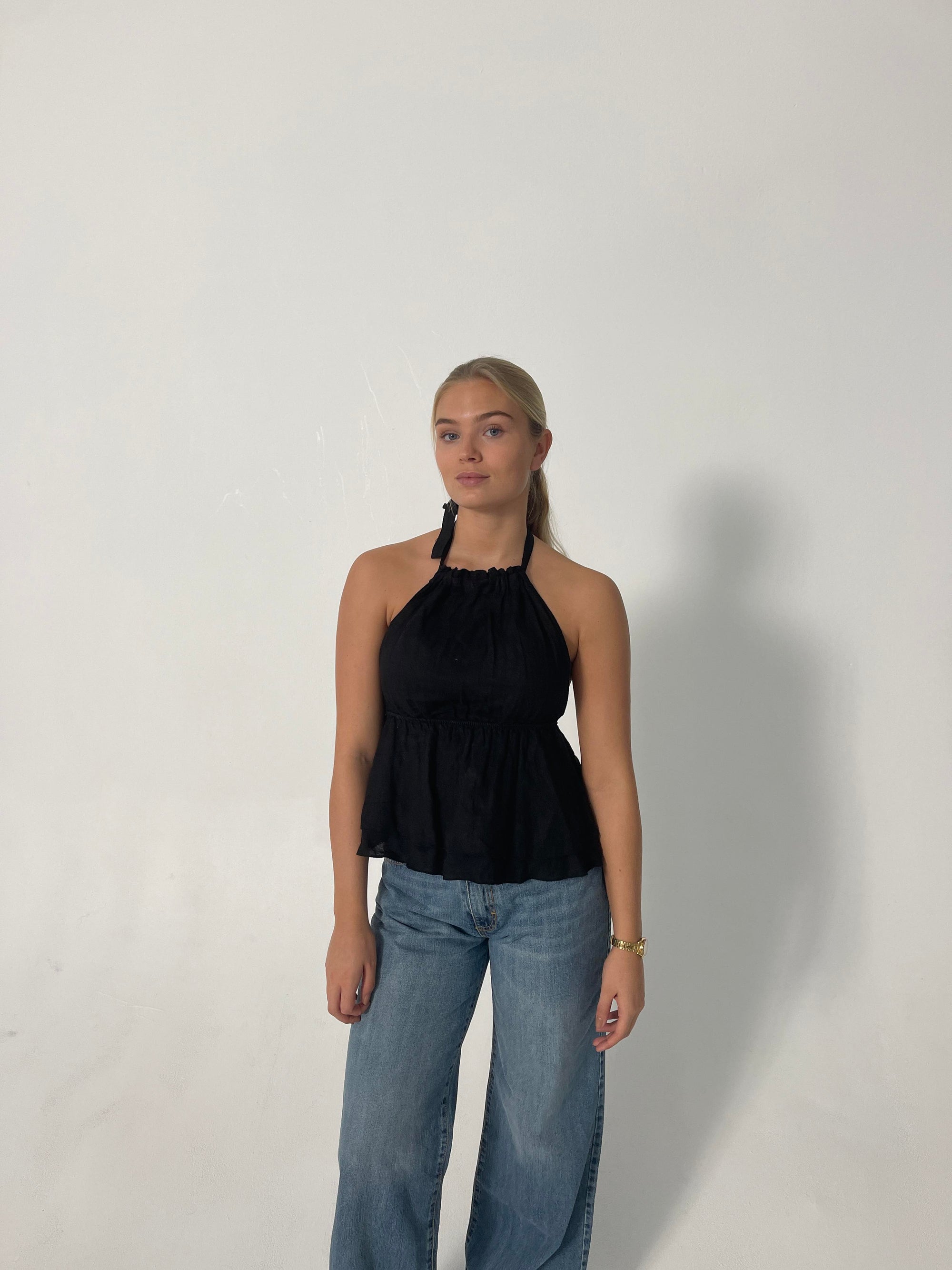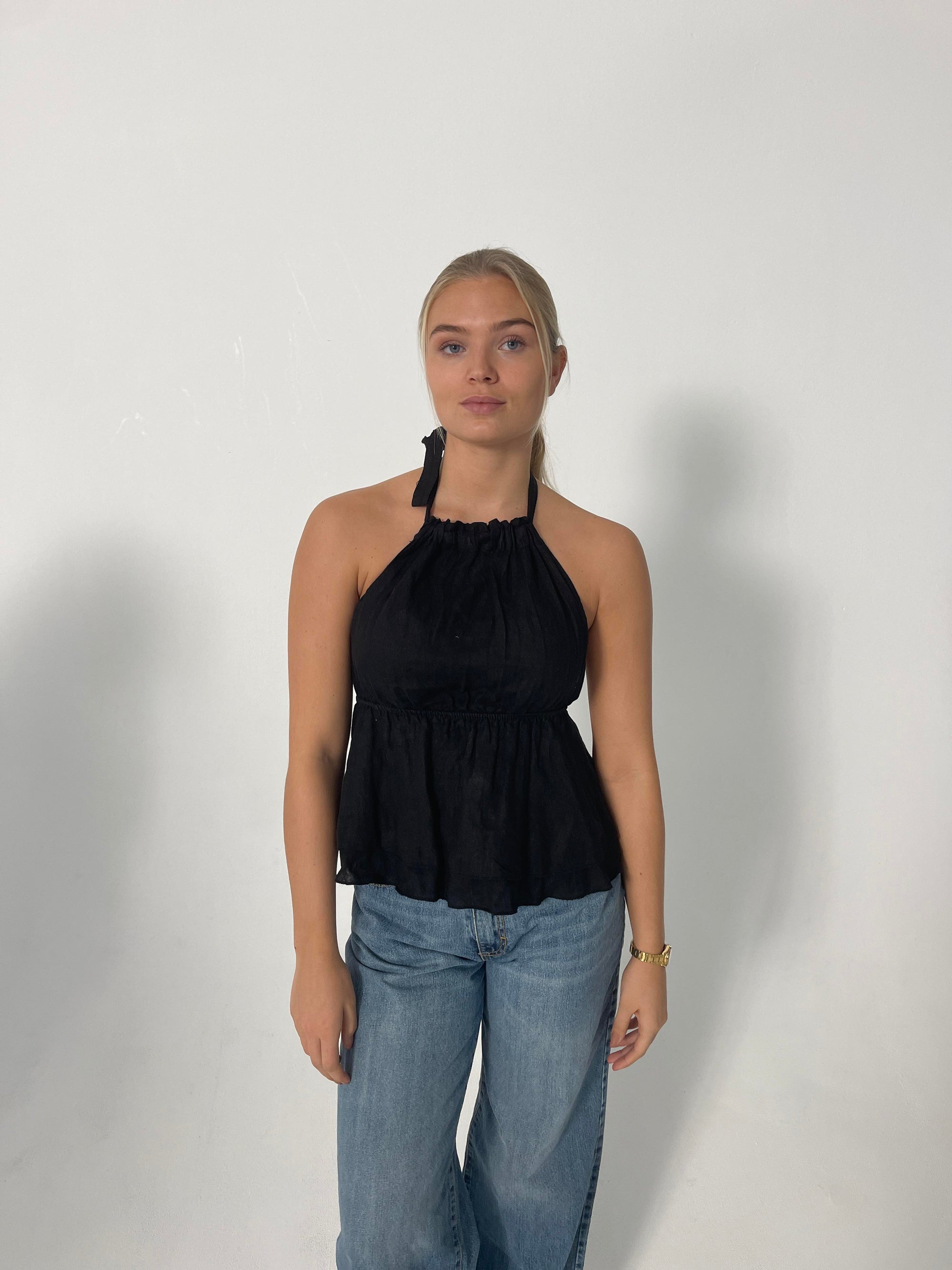 Vores Cleo top er lavet i et hør materiale, som er helt perfekt til den varmere årstid. Toppen har den fineste åbne ryg og skal bindes i nakken.