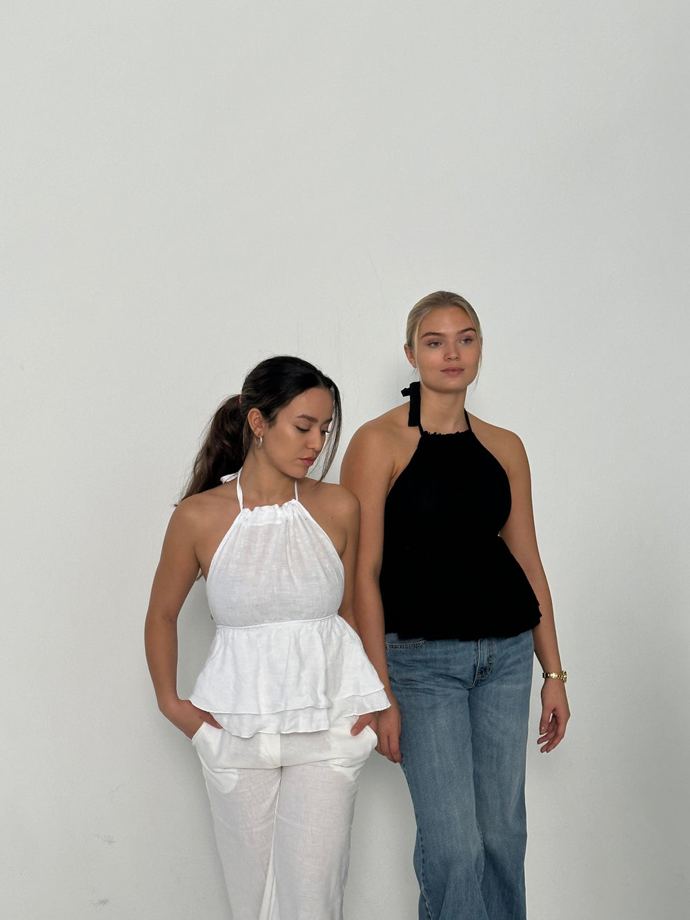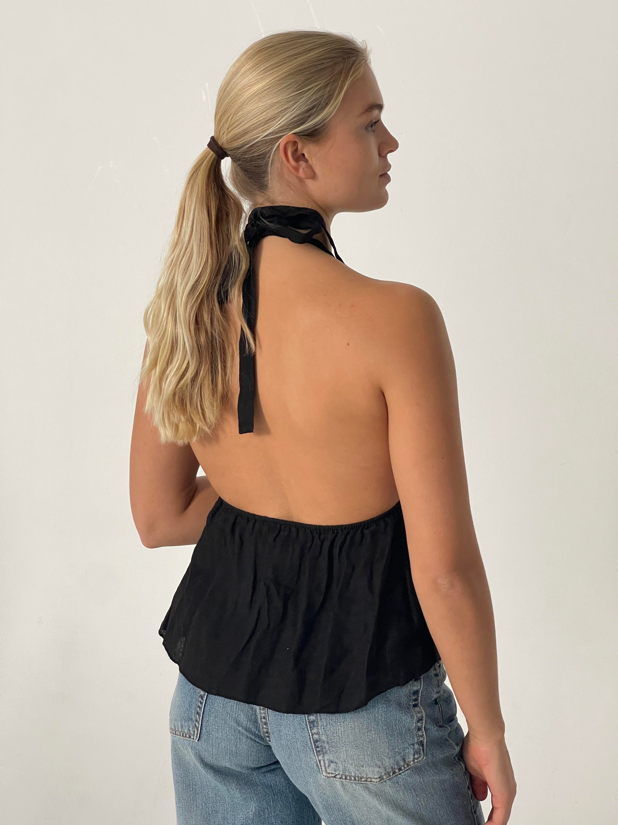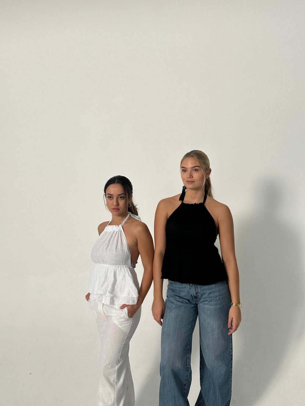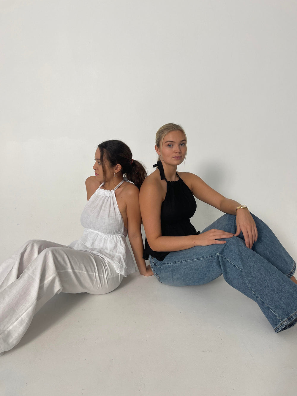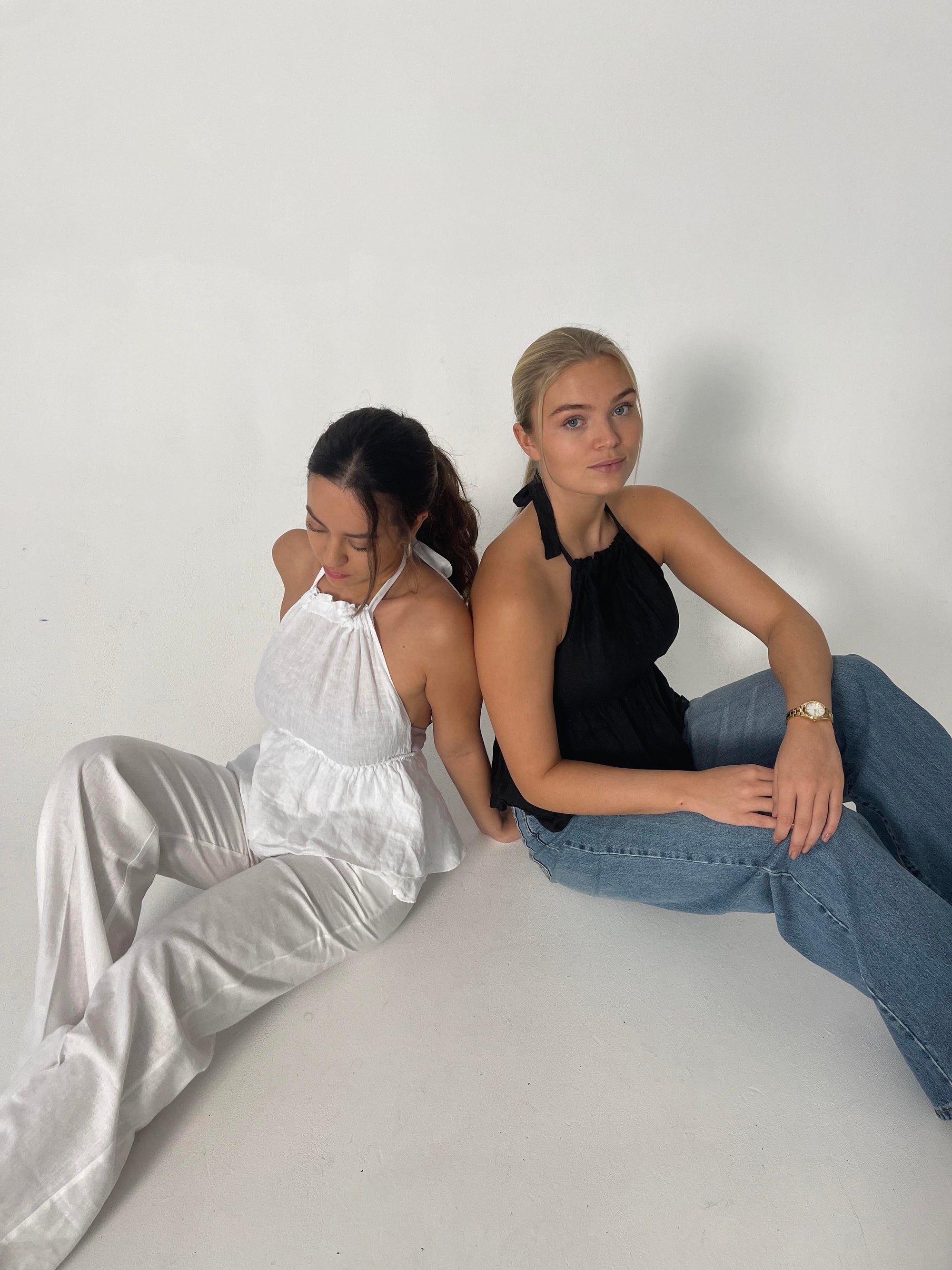 Vores Cleo top er lavet i et hør materiale, som er helt perfekt til den varmere årstid. Toppen har den fineste åbne ryg og skal bindes i nakken.
