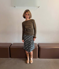 Denne brune mesh nederdel med hvide polkaprikker er perfekt til sommerferien! Den har et cool, let gennemsigtigt look med en blød underkjole, så du både får komfort og stilpoint på én gang. Det elastiske taljestykke gør den super nem at hoppe i, og den sidder flatterende uden at være stram. Perfekt længde til både klipklapper og støvler – lige under knæet, men stadig med masser af bevægelse.