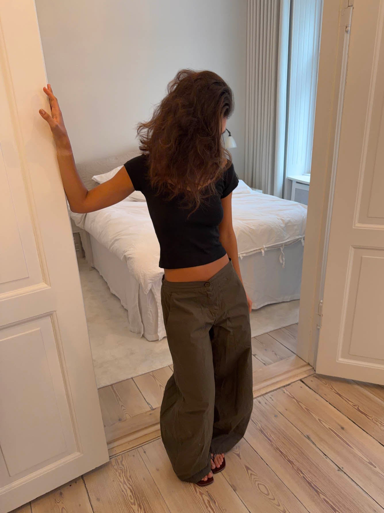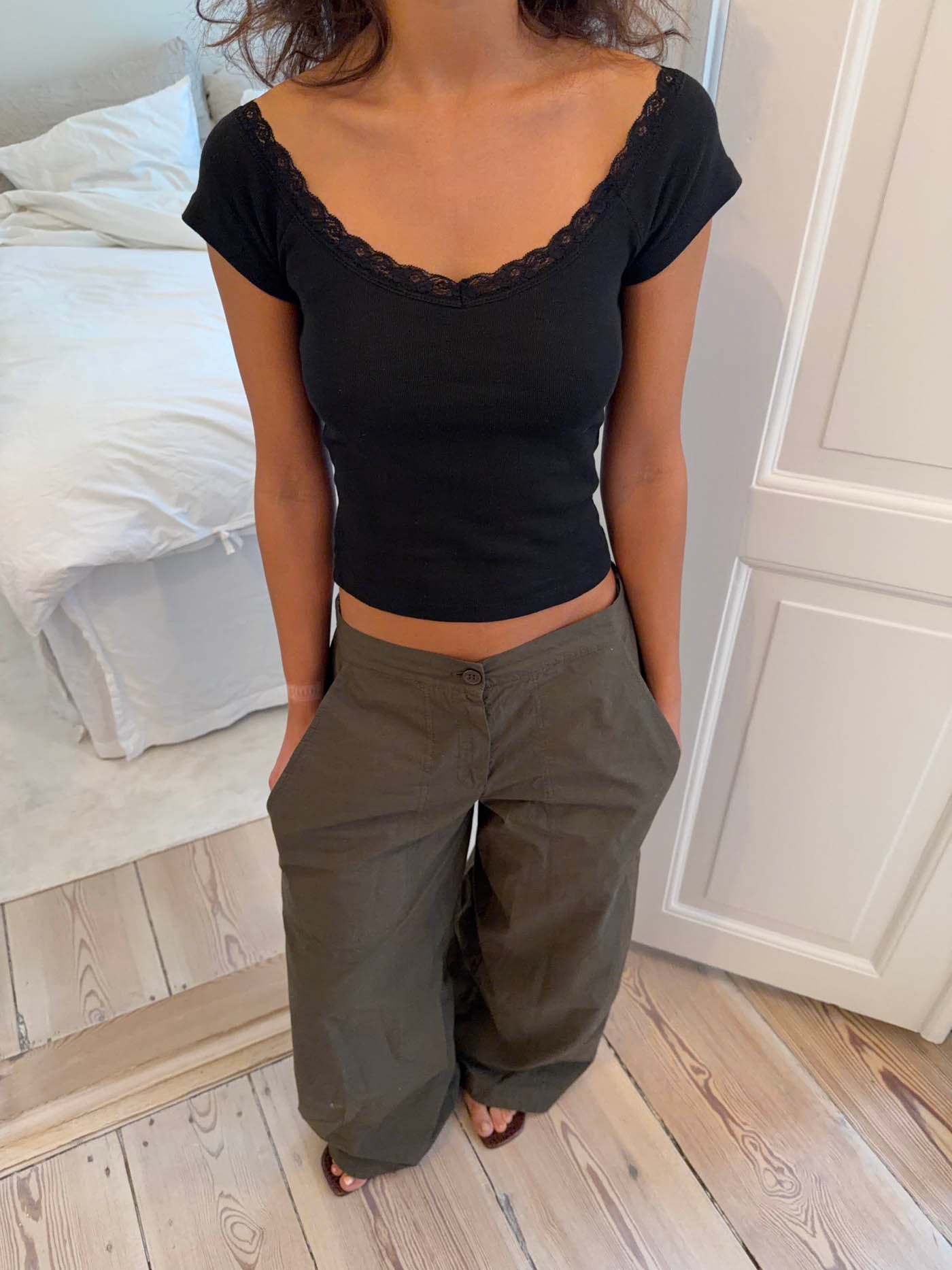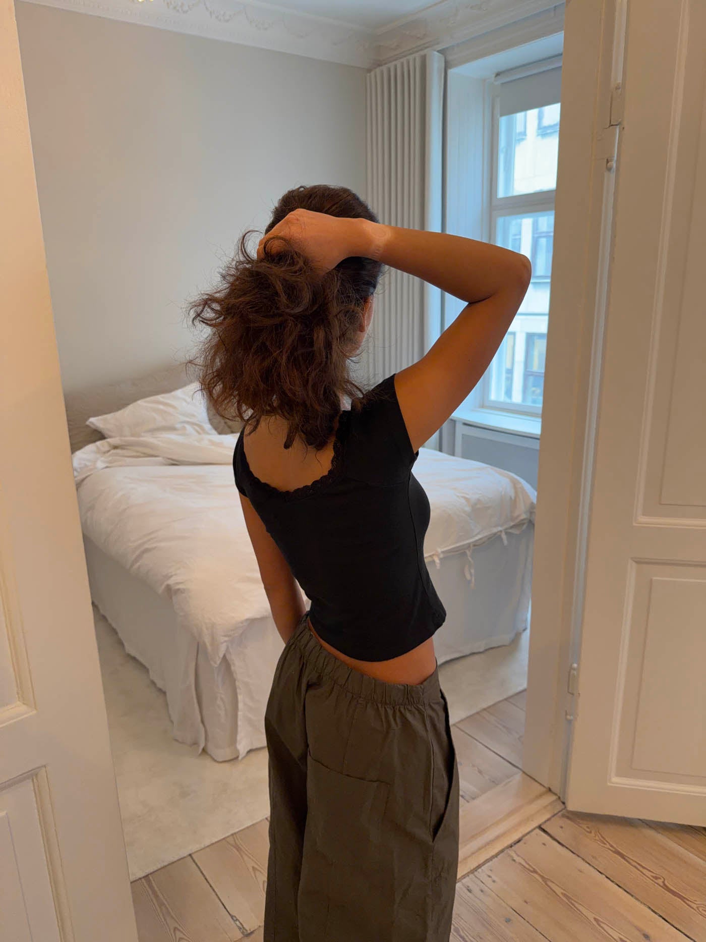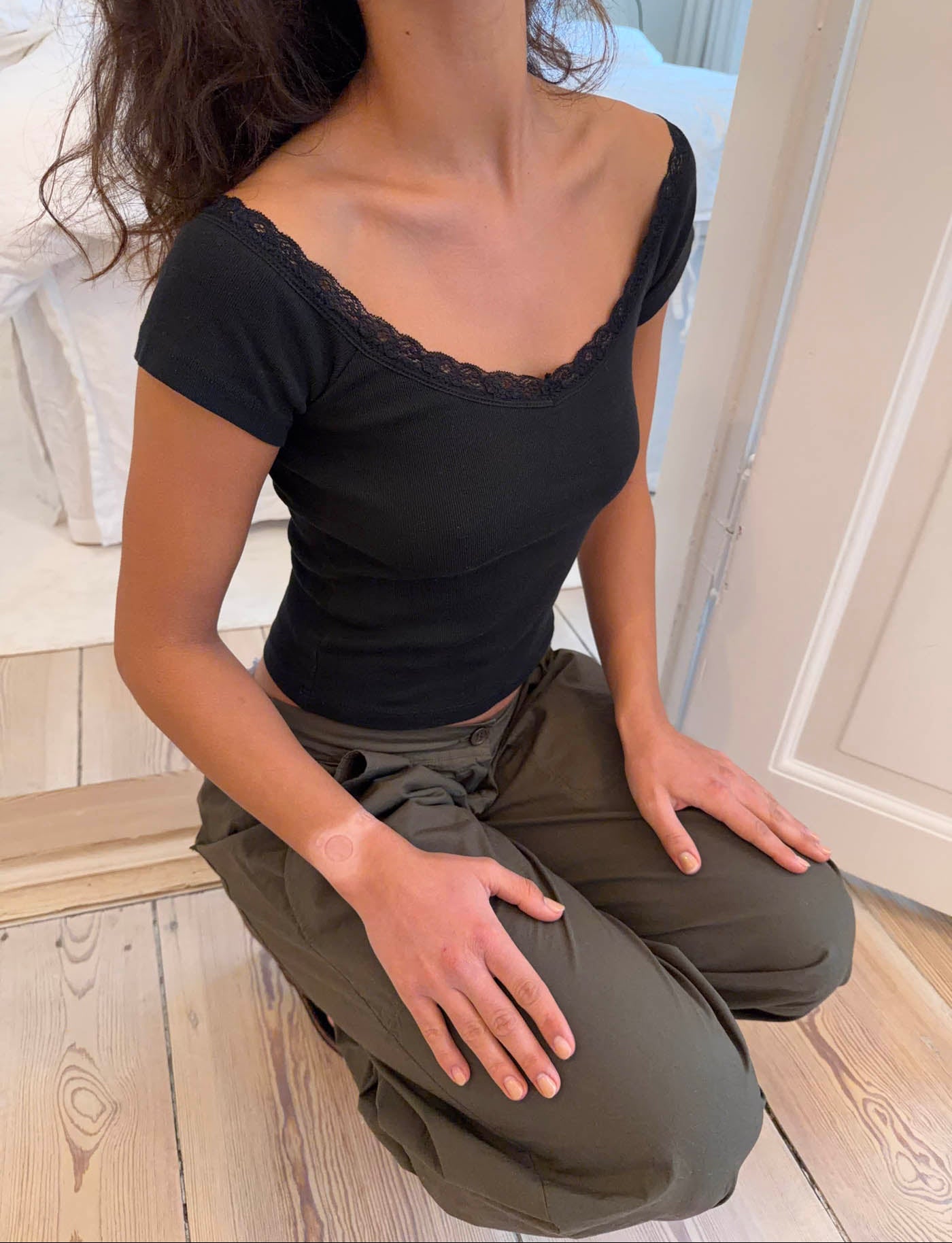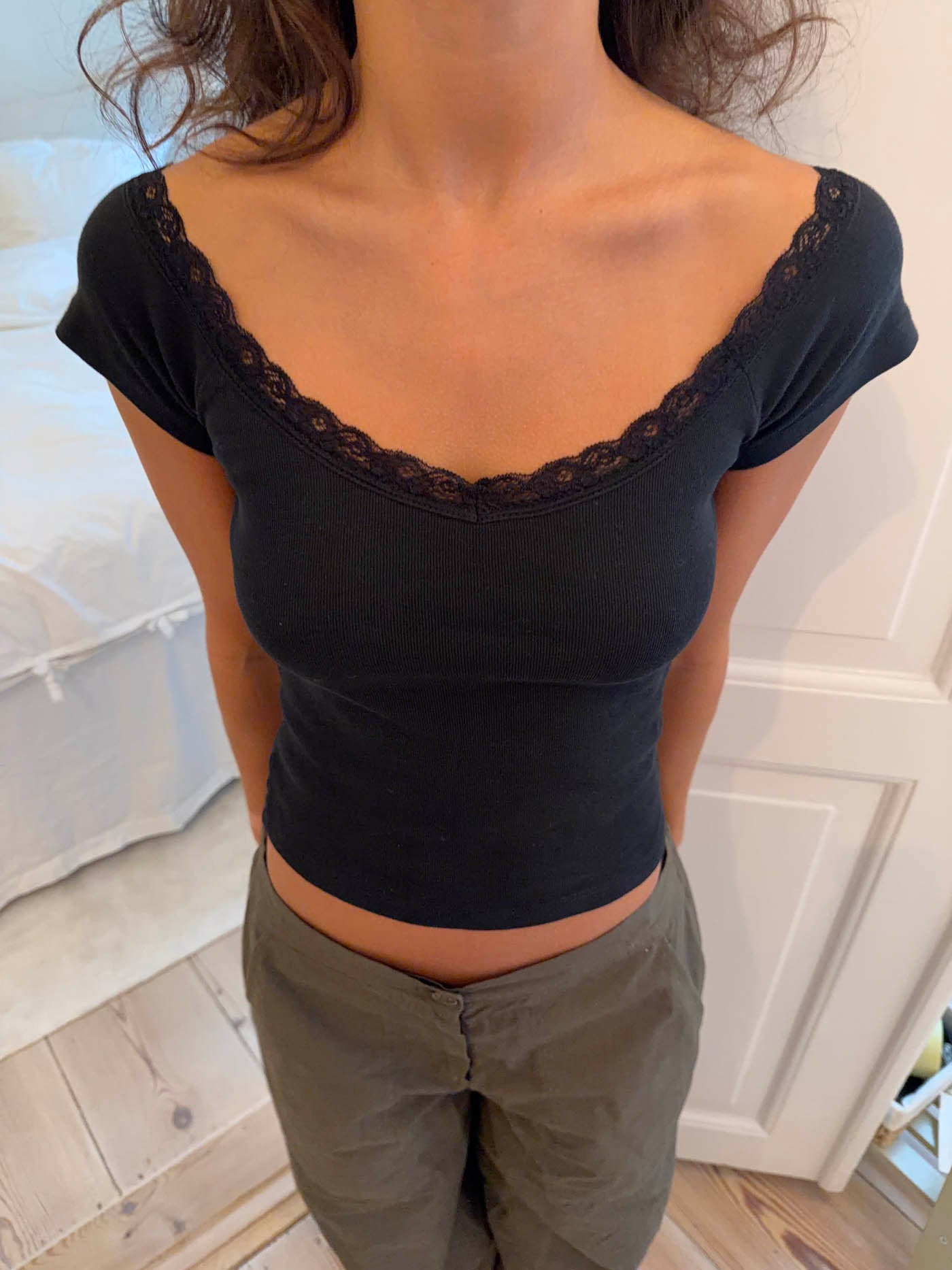 En feminin og tidløs sort top i en blød, ribbet kvalitet, der smyger sig elegant til kroppen. Designet har en flatterende V-udskæring med fine blondedetaljer, som tilfører et romantisk touch. De korte ærmer og tætsiddende pasform gør den perfekt både alene eller som en layering-piece under en blazer eller cardigan. Style den med jeans for et effortless hverdagslook eller en nederdel for en mere sofistikeret vibe.