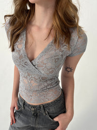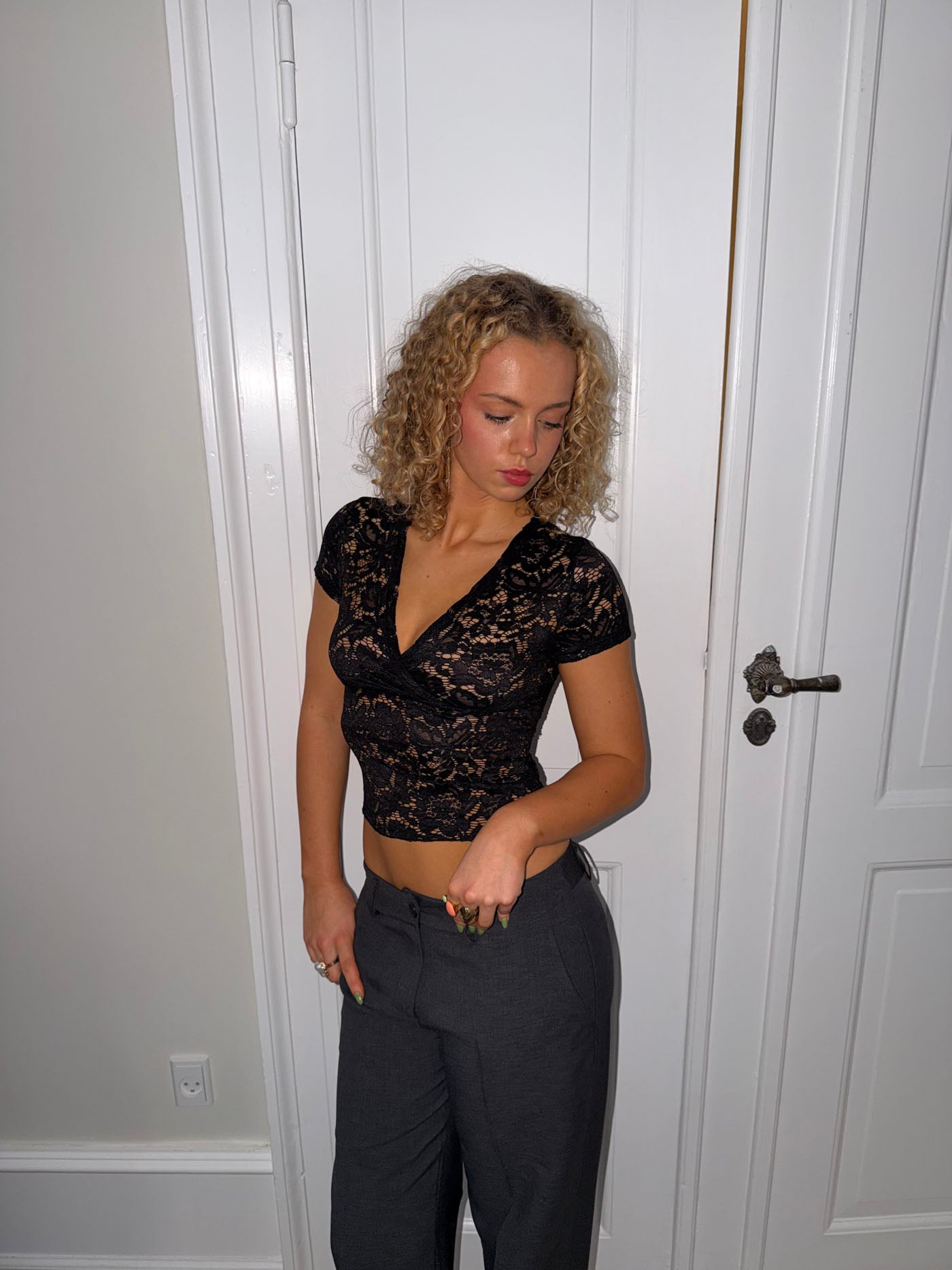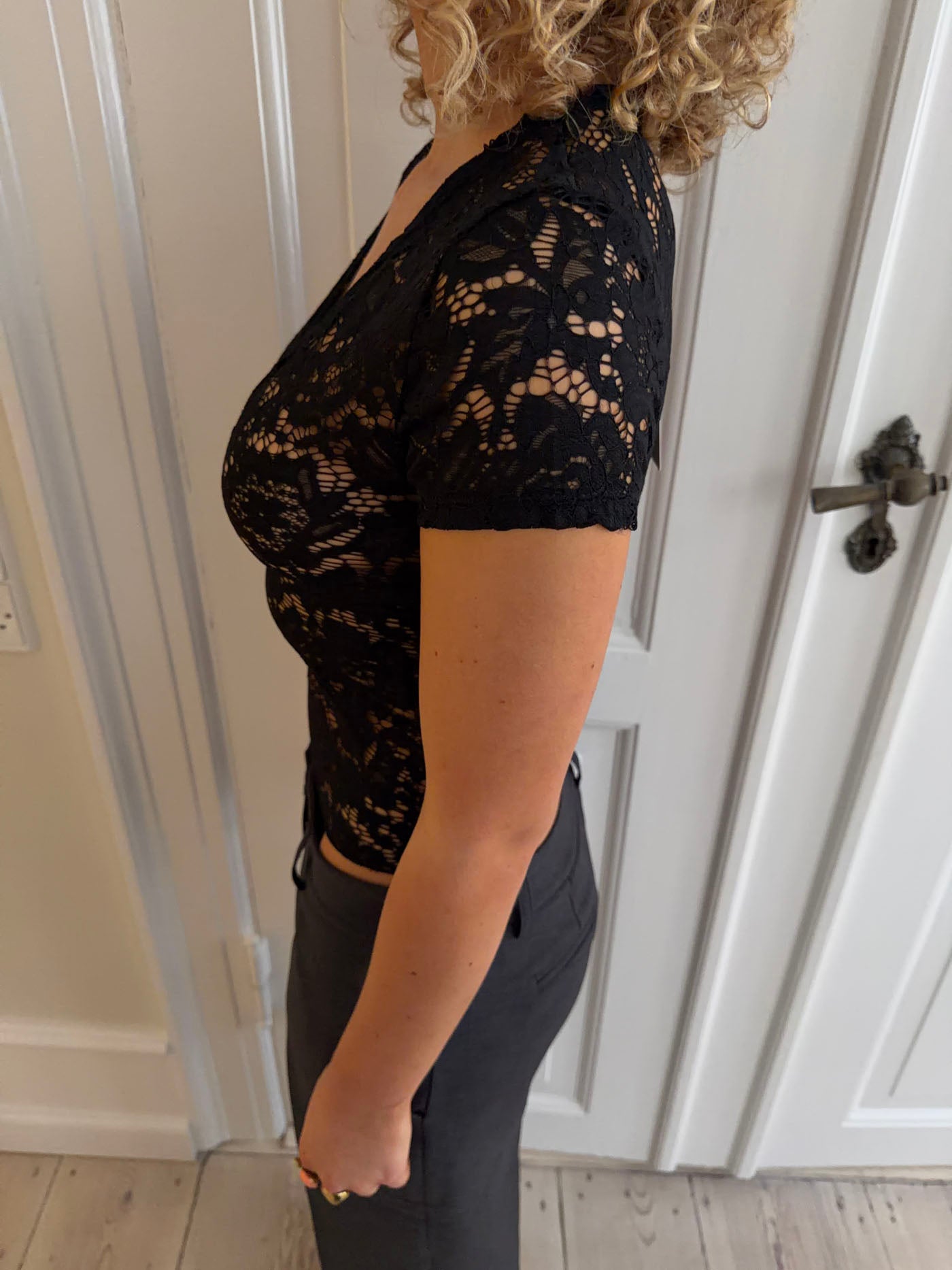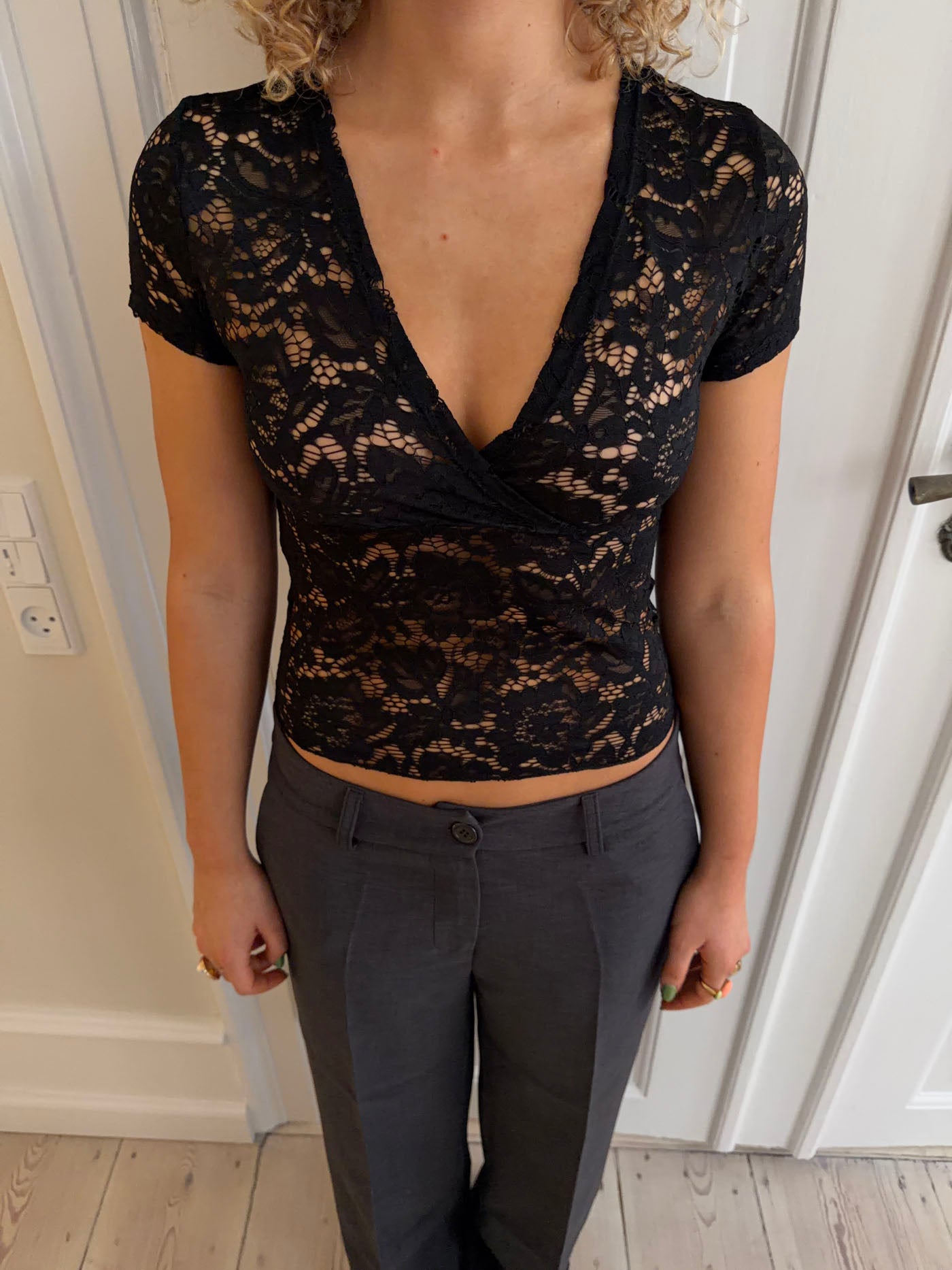 Den fineste tætsiddende blonde V t-shirt. På billederne styles den med en neutral bh, og derfor vil den være transparent hvis man ikke har noget indenunder.