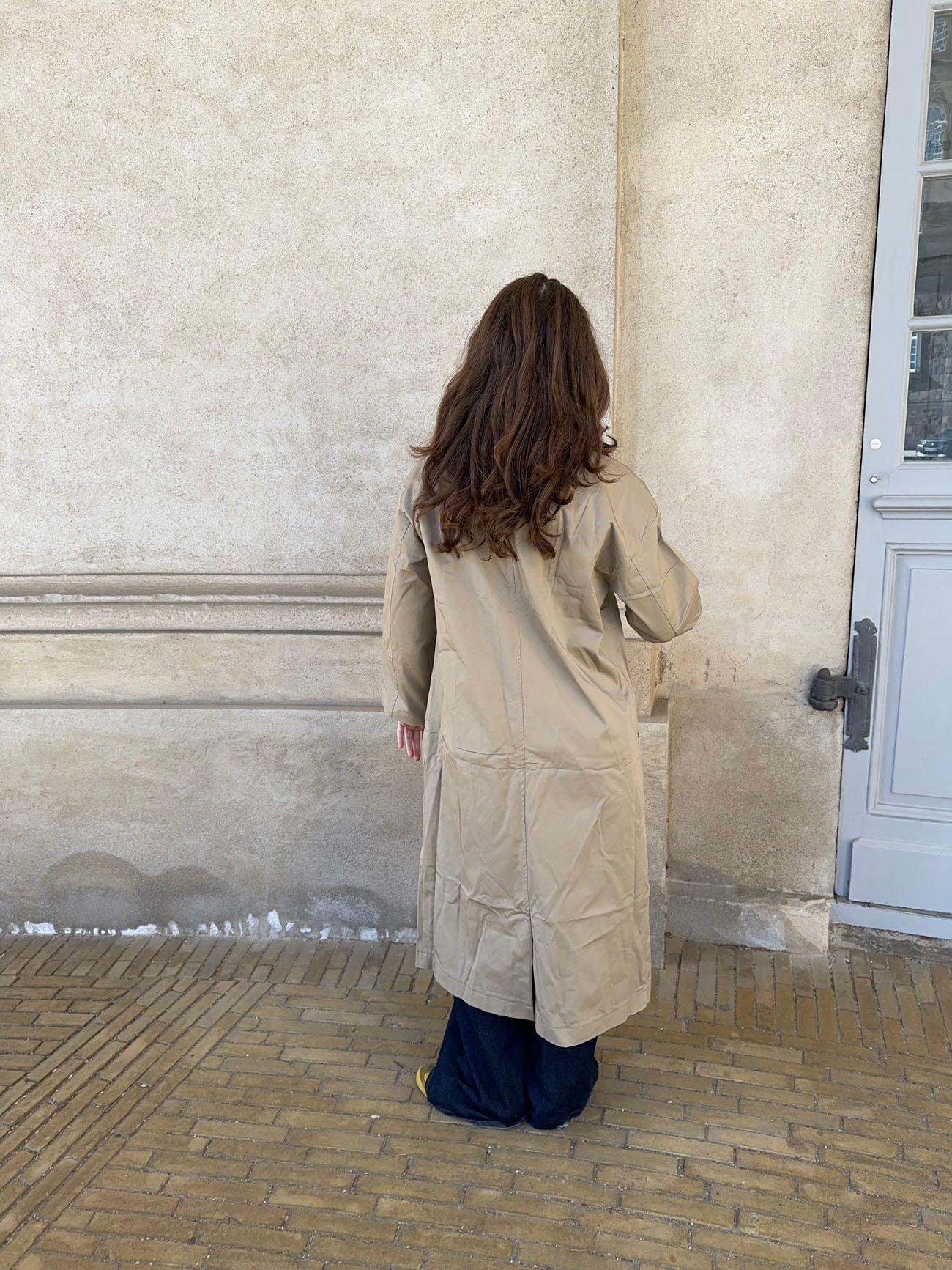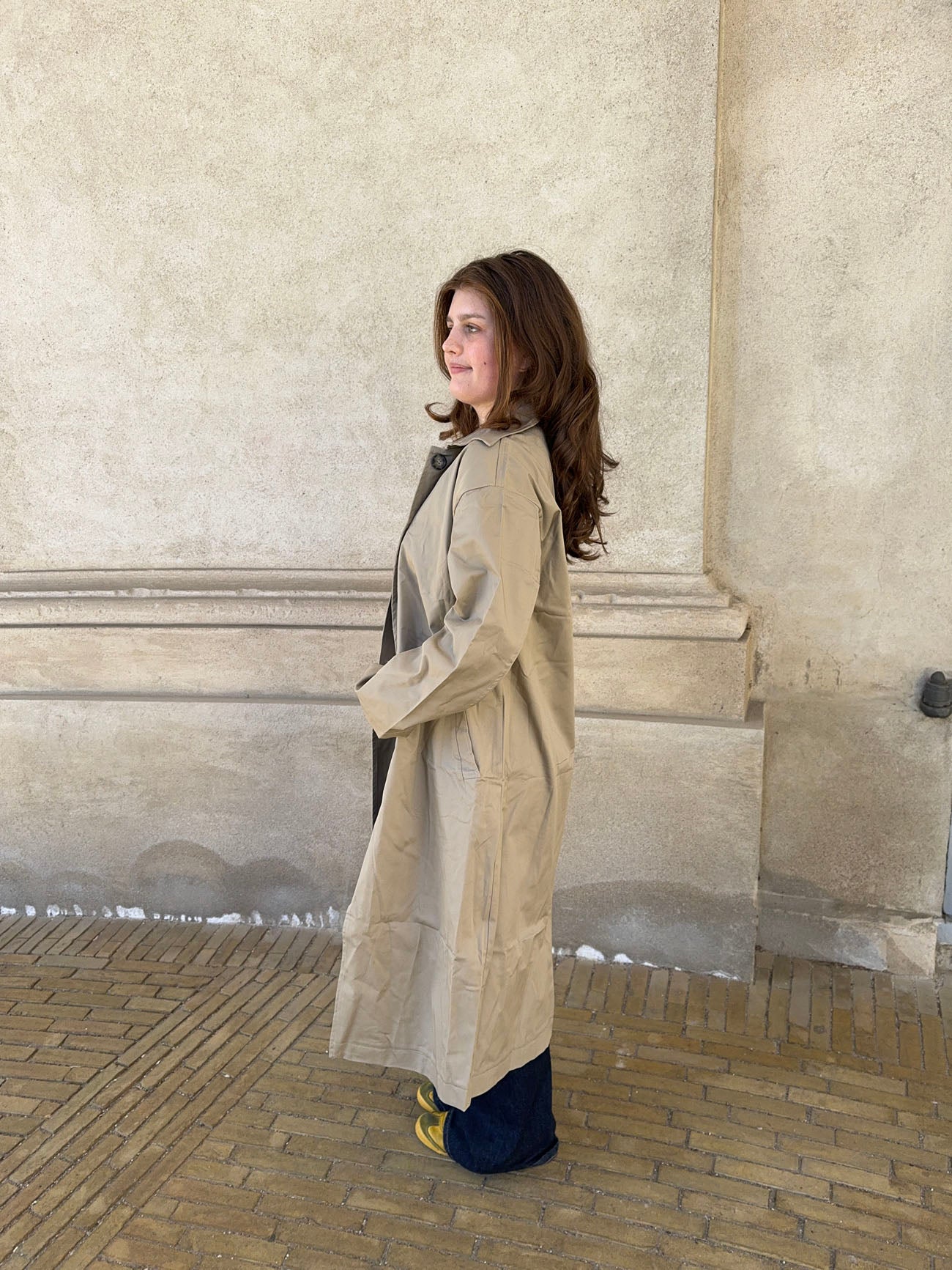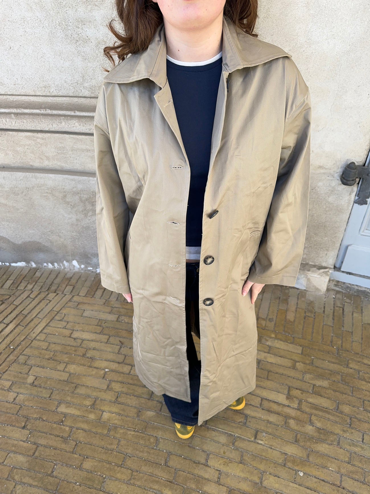 Denne knælange trench coat er designet med klassiske knapper og en elegant krave. De praktiske lommer giver både funktionalitet og stil. Frakken har et tidløst snit, der passer til enhver anledning. Perfekt til at fuldende dit look med både komfort og elegance.